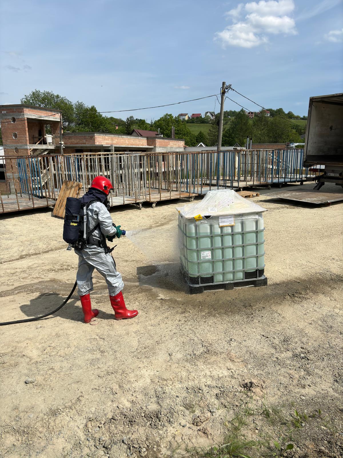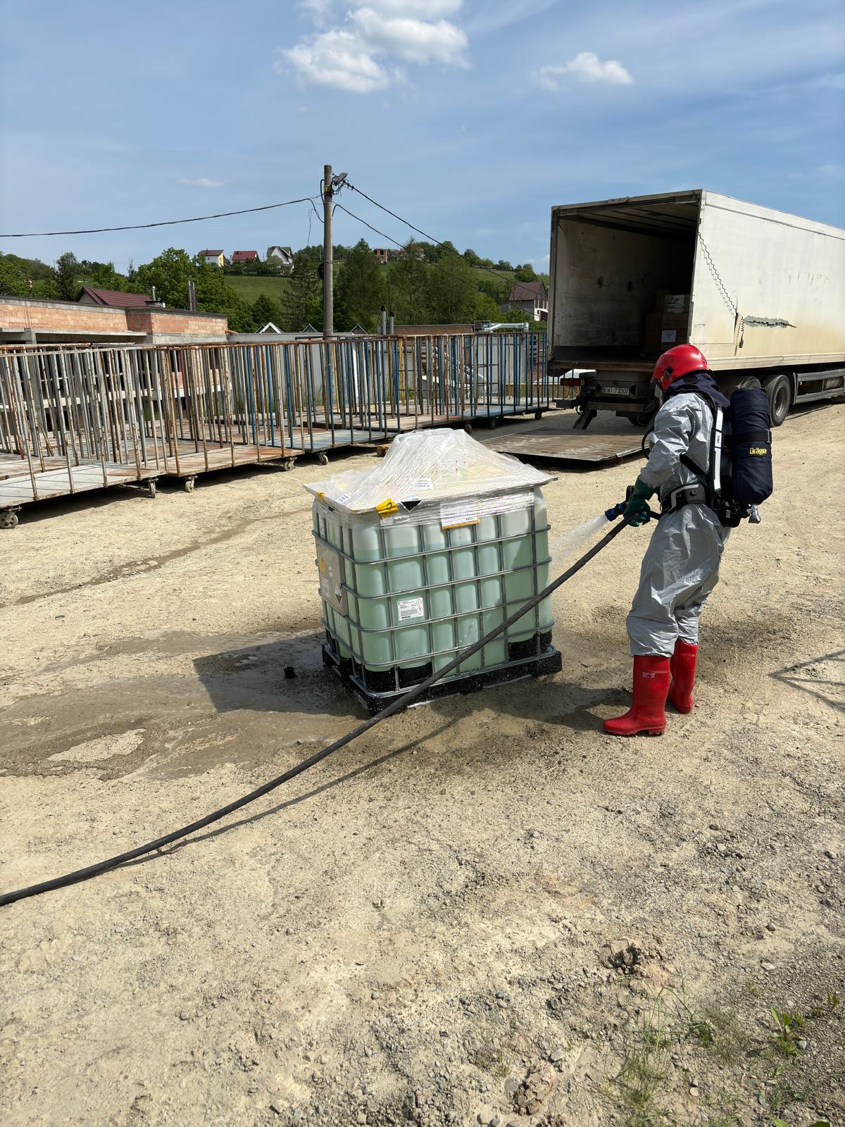 10 maja o godzinie 13.20 zastępy z JRG nr 1 w Nowym Sączu oraz OSP Krasne Potockie zadysponowane zostały do działań w miejscowości Krasne Potockie. Po przybyciu na miejsce zdarzenia ustalono, że doszło do wycieku niebezpiecznej substancji (nadtlenek wodoru - 35% składowanym w DPPL) stanowiącej przesyłkę obsługiwaną przez firmę spedycyjną. Zdarzenie miało miejsce w trakcie rozładunku pojemnika. W chwili przybycia strażaków, zbiornik ustawiony był na środku placu. Osoba mająca kontakt z substancją, nie uskarżała się na żadne dolegliwości. Działania strażaków polegały na zabezpieczeniu miejsca zdarzenia oraz spłukaniu kończyny dolnej pracownika mającego kontakt z substancja. Dalsze działania polegały na wyznaczeniu strefy niebezpiecznej z określeniem miejsca wejścia i wyjścia ze strefy. Rozwinięto linię szybkiego natarcia. Stworzono zaopatrzenie wodnego w oparciu o pobliski hydrant. Wypływ kropelkowy uszczelniono poprzez właściwe ustawienie zaworu, dokręceniu nakrętki oraz zabezpieczeniu zaworu przy wykorzystaniu opasek zaciskowych. Spłukano zbiornik wodą. Przeprowadzeniu dekontaminację ratowników oraz sprzętu. Miejsce zdarzenia zostało pisemnie przekazano pracownikowi. Działania strażaków trwały ponad godzinę.