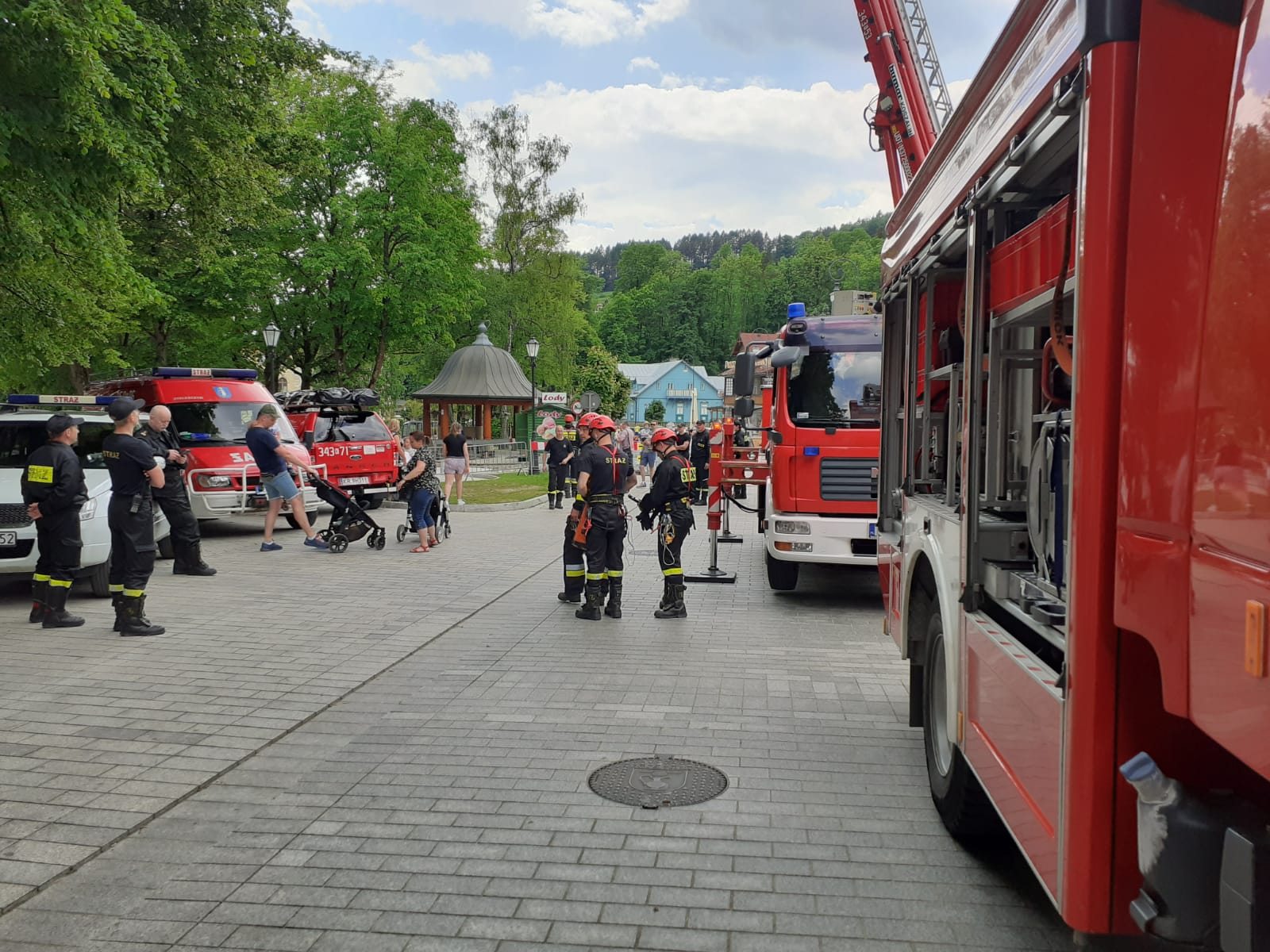 Krynica Zdrój- strażacy zabezpieczają mobilny punkt sczepień i wykonują pokazy