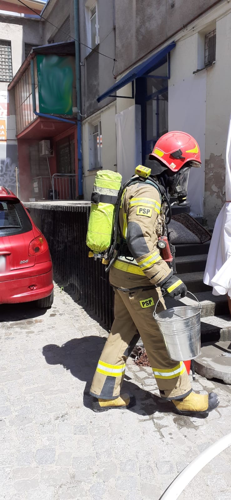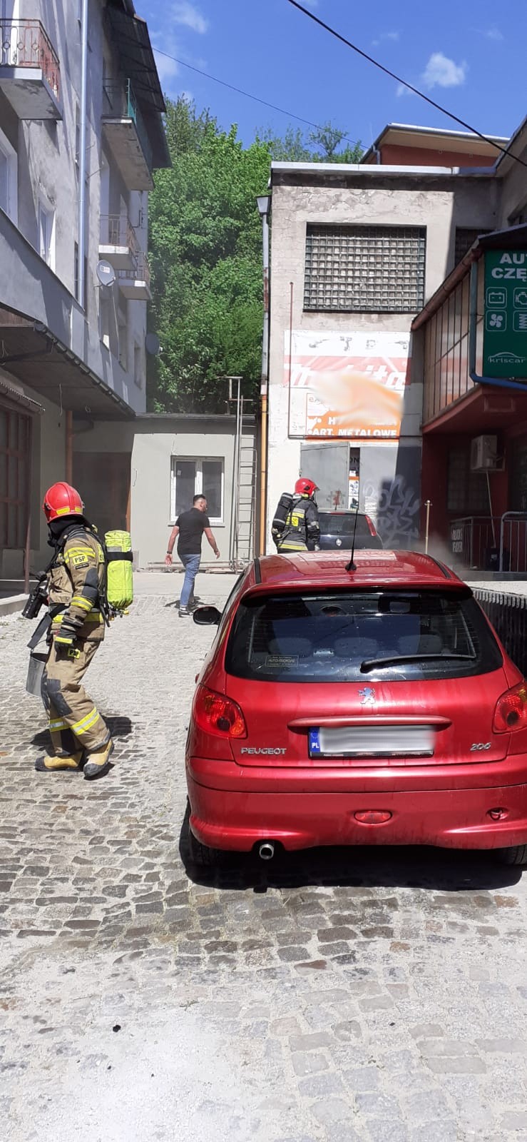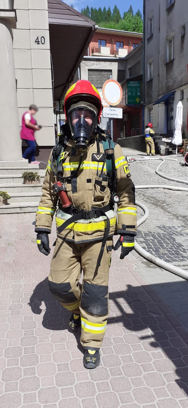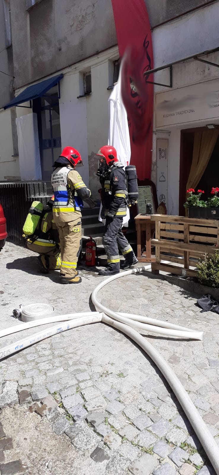 21 maja o godzinie 14.18 zastępy z JRG w Krynicy Zdroju zadysponowane zostały do działań w Krynicy Zdroju na ulicę Piłsudskiego. Po przybyciu na miejsce zdarzenia ustalono, że z otworów okiennych i drzwiowych pomieszczeń piwnicznych restauracji wydobywał się dym. Jeden z zaparkowanych samochodów znajdował się w zadymieniu w bliskiej odległości od okna. Obecny na miejscu pracownik restauracji poinformował, że prawdopodobnie coś się zapaliło nad kominkiem w pomieszczeniach piwnicznych. Próba ugaszenia pożaru przez pracowników nie powiodła się. W chwili powstania pożaru w pomieszczeniach technicznych restauracji przebywały dwie osoby, które opuściły budynek i nie uskarżały się na żadne dolegliwości. Najemca lokalu odłączył zasilanie w energie elektryczną. Strażacy weszli do budynku w sprzęcie ochrony dróg oddechowych z linią gaśniczą oraz kamerą termowizyjną. Zlokalizowano źródło ognia jakim było wyposażenie kominka oraz drewniany wystrój wnętrza jednego z pomieszczeń. W miejscu tym prowadzono działania gaśnicze. W tym samym czasie sprawdzono wyższe kondygnacje otwierając okna celem oddymiania. Samochód został przeparkowany. Nadpalone elementy wynoszono i dogaszano na zewnątrz. W trudno dostępne miejsca drewnianej zabudowy podano proszek gaśniczy. Po lokalizacji pożaru przystąpiono do oddymiania z wykorzystaniem wentylatora mechanicznego. Po przewietrzeniu pomieszczeń i sprawdzeniu urządzeniami pomiarowymi na obecność gazów niebezpiecznych sprawdzono wyższe kondygnacje oraz pomieszczenia piwniczne. Ze względu za zapach spalenizny zalecono otwarcie okien oraz wietrzenie. Działania strażaków trwały ponad godzinę.