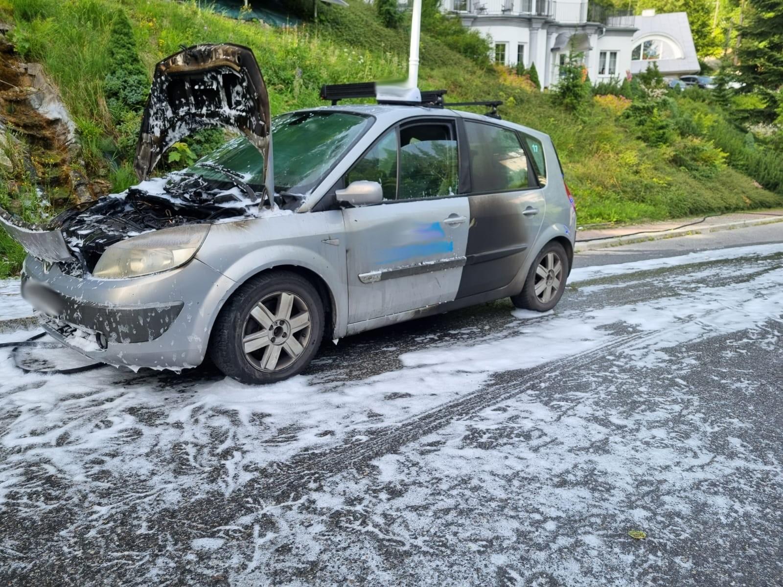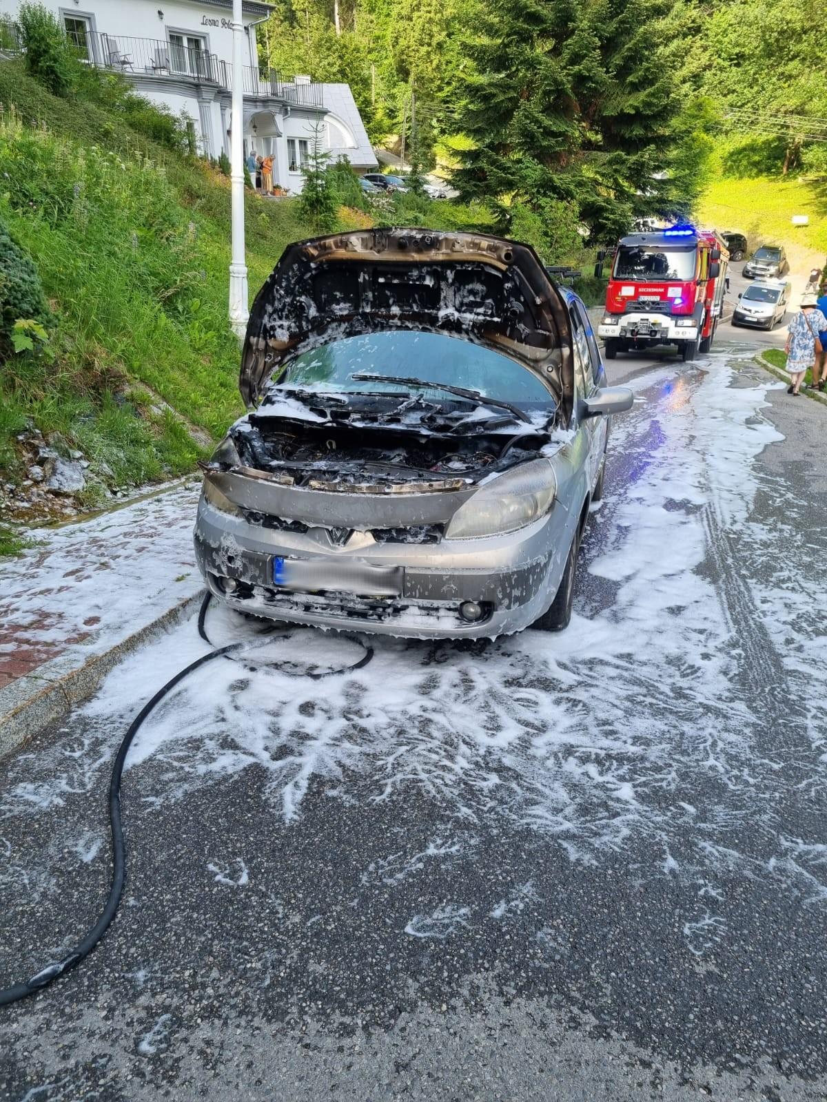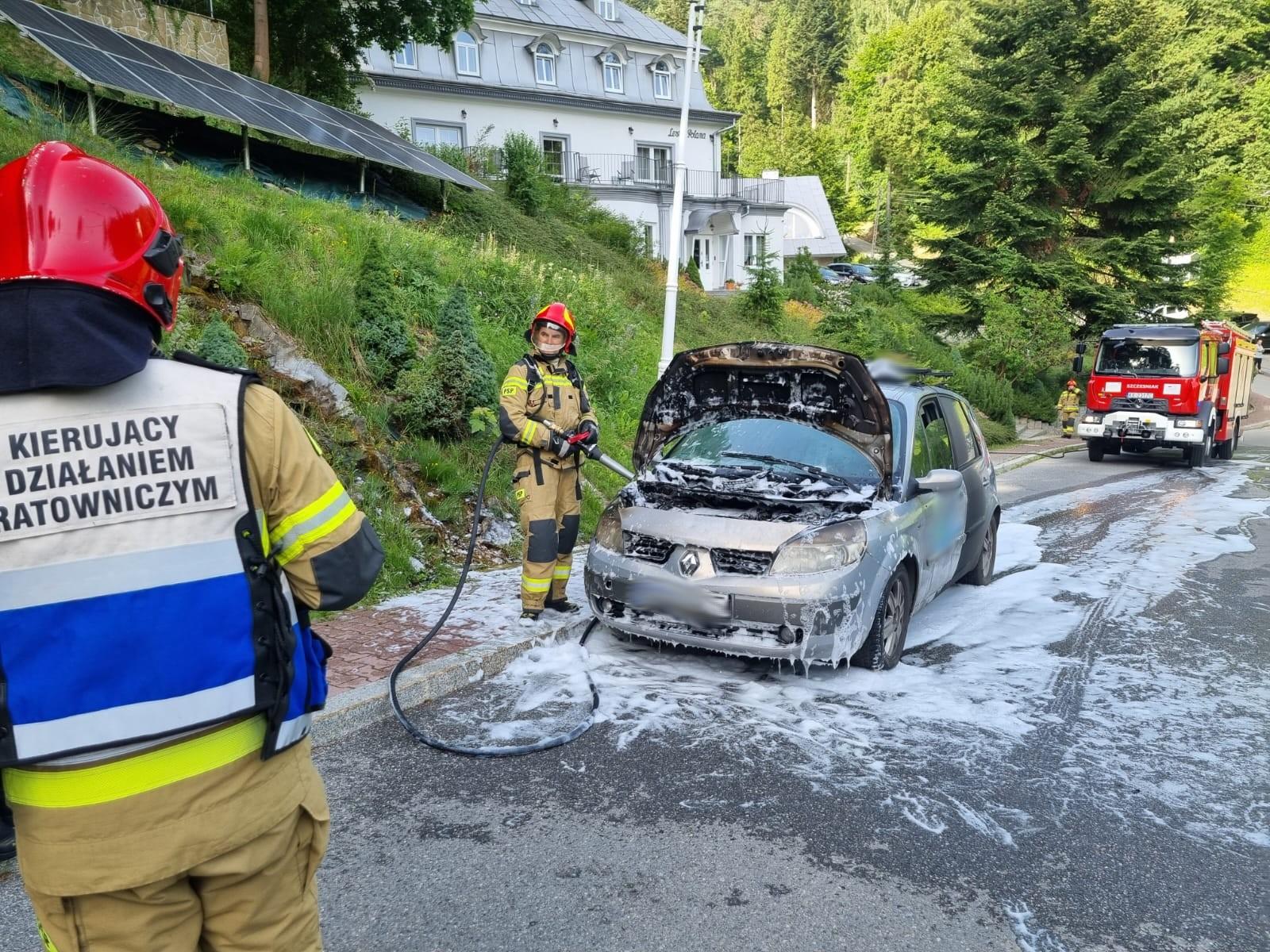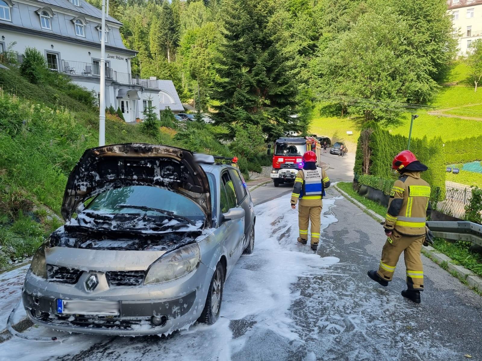 21 czerwca o godzinie 16.54 zastęp z JRG w Krynicy Zdroju zadysponowany zostały do działań na ulicę Wysoką w Krynicy Zdroju. Po przybyciu na miejsce zdarzenia ustalono, że na drodze gminnej palił się samochód osobowy. Podróżujące samochodem osoby nie zostały poszkodowane. W chwili przybycia na miejsce zastępu z JRG z komory silnika oraz przedniej części pojazdu wydobywały się płomienie. Działania strażaków polegały na zabezpieczeniu miejsca zdarzenia oraz podanie jednego prądu piany ciężkiej na palący się samochód. Z uwagi na prowadzenie działań na stromym odcinku drogi palący się pojazd zabezpieczano przed stoczeniem poprzez zastosowanie klinów pod koła. Strażacy zakręci zawór instalacji LPG. Po lokalizacji pożaru przystąpiono do chłodzenia oraz kontroli kamerą termowizyjną. Odłączono klemy z akumulatora. Po kilkudziesięciu minutach dozorowania i chłodzenia temperatura pojazdu wróciła do normy. W związku z tym działania zakończono.