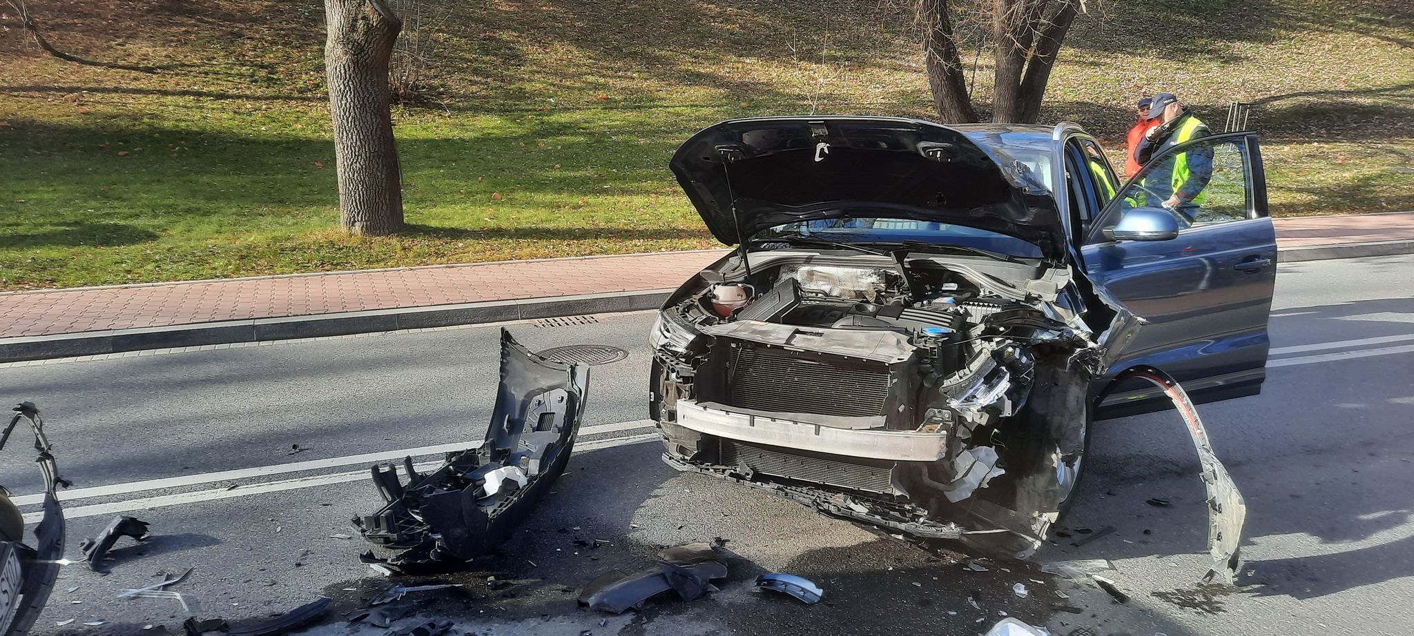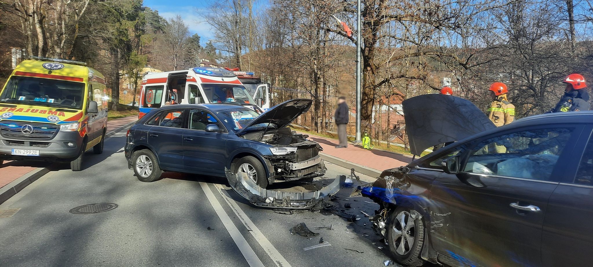 W sobotę 13 listopada o godzinie 11.54 zastęp z JRG w Krynicy Zdroju zadysponowany zostały do działań na ulicę Zdrojową w Krynicy Zdroju. Po przybyciu na miejsce zdarzenia ustalono, że doszło do kolizji trzech samochodów osobowych tj. Audi Q3, KIA CARENS oraz VW TOURAN. Samochodami podróżowało łącznie 9 osób. W wyniku zdarzenia poszkodowana została jedna osoba. Pozostałe osoby znajdowały się pod wpływem zdarzenia. Dwa znacznie uszkodzone samochody blokowały ruch drogowy w obu kierunkach. Doszło do wycieków płynów eksploatacyjnych z pojazdu. Na miejscu znajdowała się Policja, która wyznaczyła objazdy. Działania straży polegały na zabezpieczeniu miejsca zdarzenia oraz odłączeniu klem z akumulatorów w rozbitych pojazdach. Poszkodowana osoba znajdowała się w pojeździe, której strażacy udzielili pomocy. Po przybyciu karetki Pogotowia ratunkowego poszkodowana została przekazana ratownikom medycznym Pogotowia ratunkowego. Dokonano neutralizacji rozlanych płynów eksploatacyjnych. Po zakończeniu czynności dochodzeniowych przez Policję usunięto z jezdni części karoserii pojazdów. Osoba poszkodowana została zabrana do szpitala. Dzieciom biorącym udział w zdarzeniu przekazano maskotki. Działania strażaków trwały ponad trzy godziny.