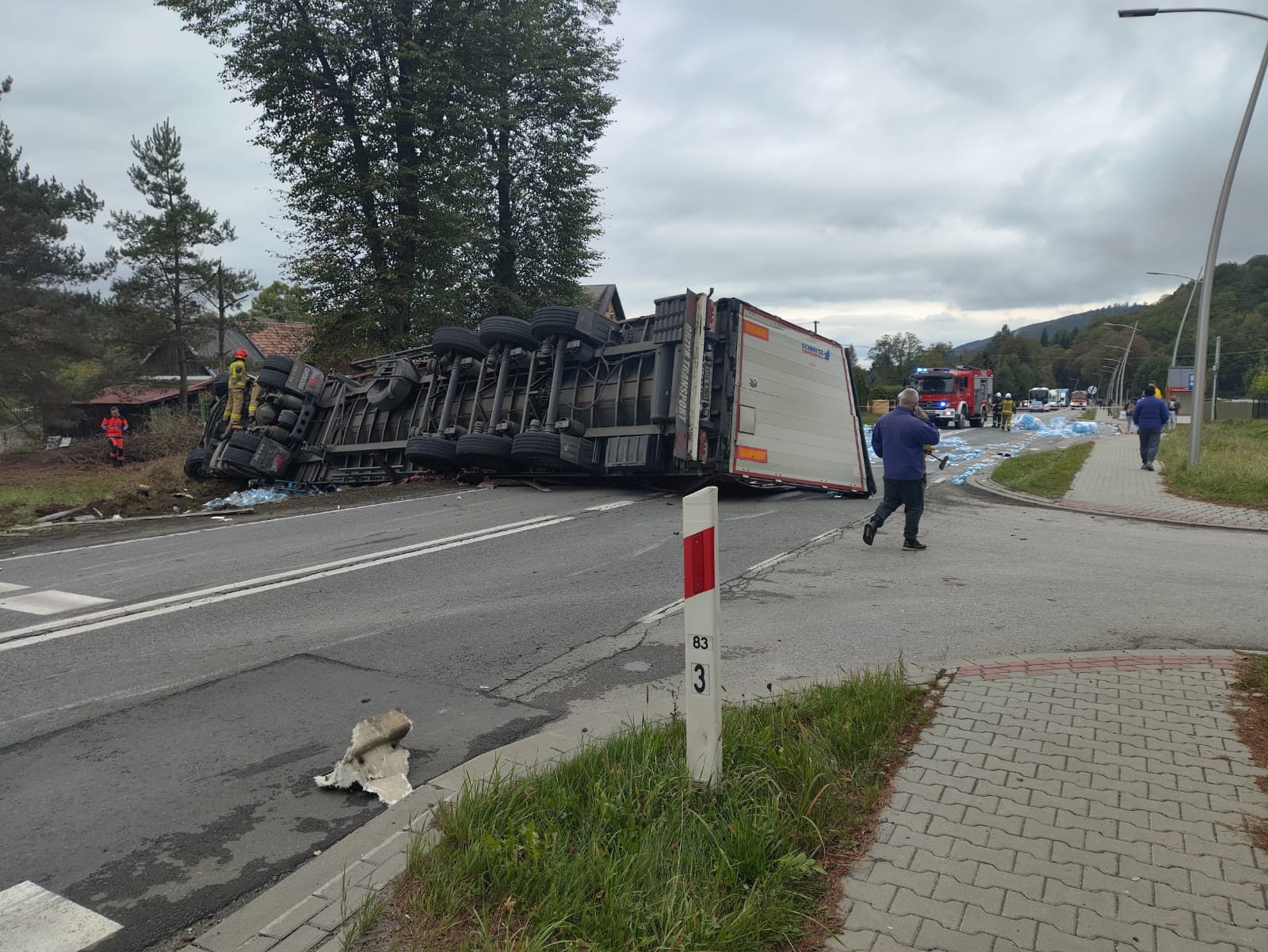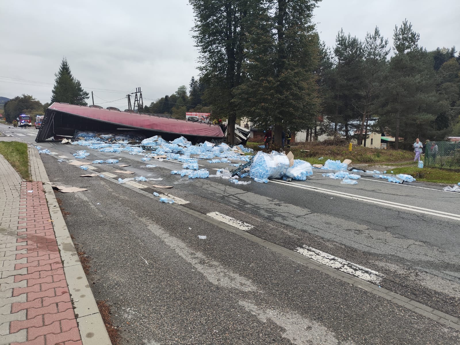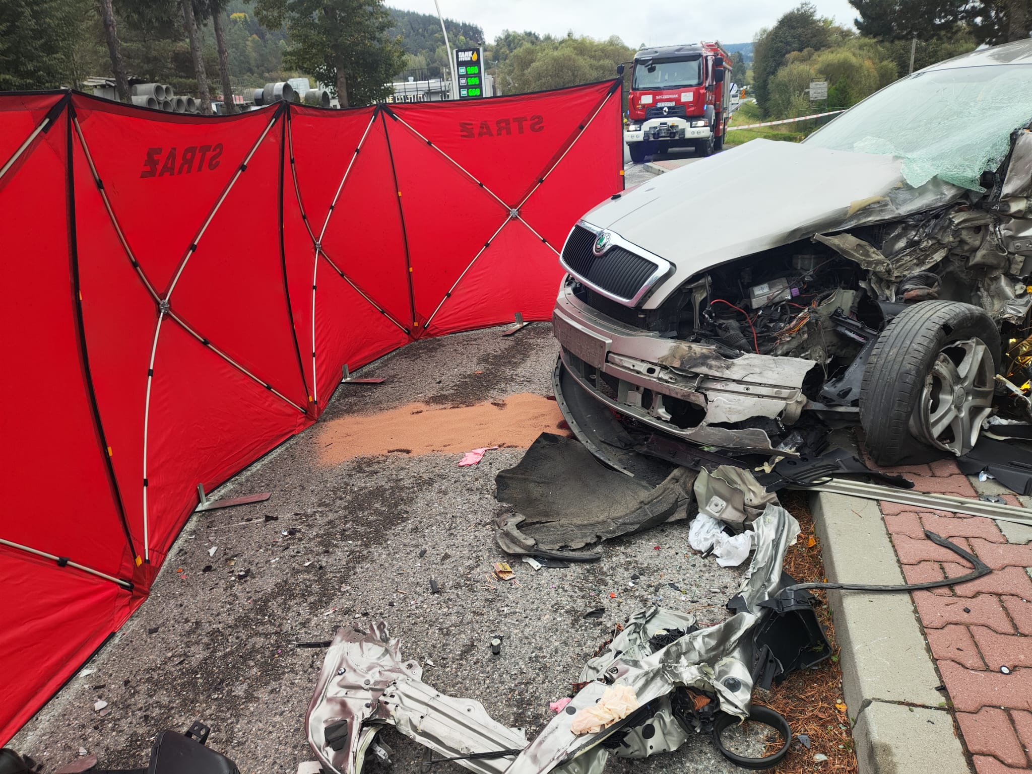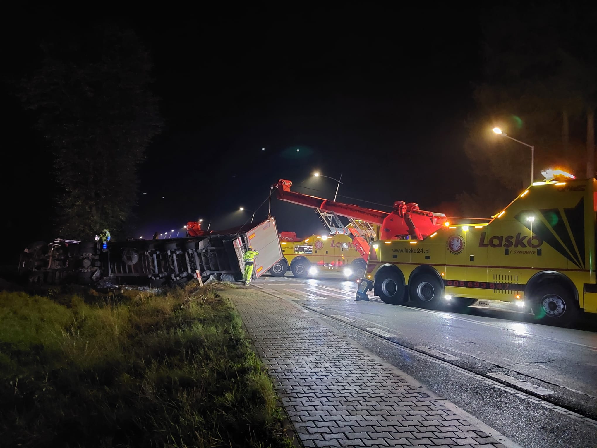 3 października o godzinie 13.16 zastępy z JRG w Krynicy Zdroju, OSP Łabowa, OSP Kamianna oraz OSP Nowa Wieś zadysponowane zostały do działań w Łabowej. Po przybyciu na miejsce zdarzenia ustalono, że samochód osobowy zderzył się czołowo z samochodem ciężarowym. Samochód osobowy stał na zatoczce autobusowej a w środku znajdował się nieprzytomny kierowca, który był reanimowany przez osoby postronne. Samochód ciężarowy wypadł z drogi i wraz z naczepą leżał na prawym boku. Naczepa była na drodze i blokowała dwa pasy ruchu. Ładunek z samochodu ciężarowego tj. butelkowana woda mineralna była porozrzucana po jezdni oraz pobliskim terenie. Kierowca samochodu ciężarowego opuścił pojazd o własnych siłach i nie uskarżał się na żadne dolegliwości. Stwierdzono wyciek płynów eksploatacyjnych zarówno z samochodu osobowego i ciężarowego. Działania zastępów straży polegały na zabezpieczeniu miejsca zdarzenia oraz kontynuowano resuscytację krążeniowo-oddechową. Wykonano dostęp do poszkodowanego z wykorzystaniem sprzętu hydraulicznego. Stwierdzono uszkodzenie latarni w której nie potwierdzono obecności napięcia. Ratownik medyczny Pogotowia Ratunkowego stwierdził zgon reanimowanego kierowcy. Kolejne działania polegały na rozłożeniu parawanu przed samochodem osobowym. Całkowicie zamknięto drogę i wygrodzono ją taśmą ostrzegawczą. Ograniczono sorbentem rozlewający się olej silnikowy z samochodu osobowego. Odłączono i wyjęto akumulatory z samochodu ciężarowego. Podstawiono wiadro pod zbiornik paliwa samochodu ciężarowego w celu zebrania kapiącego paliwa. Akumulator z samochodu osobowego wypadł w wyniku zderzenia. Przybyłe pogotowie energetyczne zabezpieczyło wystające przewody i odłączyło zasilanie od ściętej latarni. Strażacy udzielili pomocy w wyjęciu zwłok z wraku samochodu. Po uzyskaniu zgody Policji usunięto elementy karoserii i rozrzuconego ładunku z drogi. Poprzez przesunięcie naczepy udrożniono jeden pas ruchu co umożliwiło wprowadzenie ruchu wahadłowego na drodze krajowej. Na miejsce dotarły dwa holowniki, które przystąpiły do wyciągania i postawienia na koła ciągnika siodłowego z naczepą. Holowniki odholowały naczepę i ciągnik siodłowy. Na zakończenie działań OSP Łabowa zmyła drogę i przywrócono ruch w obydwu kierunkach. Działania strażaków trwały dziesięć i pół godziny.