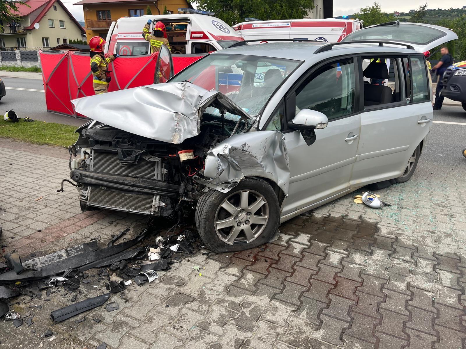 16 czerwca o godzinie 15.54 zastępy z JRG nr 2 w Nowym Sączu oraz OSP Łącko zadysponowane zostały do działań w Łącku. Po przybyciu na miejsce zdarzenia ustalono, że kierujący samochodem osobowym marki Volkswagen Touran z niewiadomych przyczyn zjechał z drogi i uderzył w ogrodzenie na pobliskiej posesji. Na miejscu karetka Pogotowia Ratunkowego. Samochodem podróżowało cztery osoby w tym dwie osoby dorosłe oraz dwoje dzieci. Jednej osobie dorosłej i jednemu dziecku była udzielana pomoc. Strażacy zabezpieczyli miejsce zdarzenia, odłączyli klemy akumulatora w pojeździe, a wycieki zasypali sorbentem. Wszystkie osoby biorące udział w zdarzeniu zostały zabrane do szpitala. Działania strażaków trwały prawie dwie godziny.