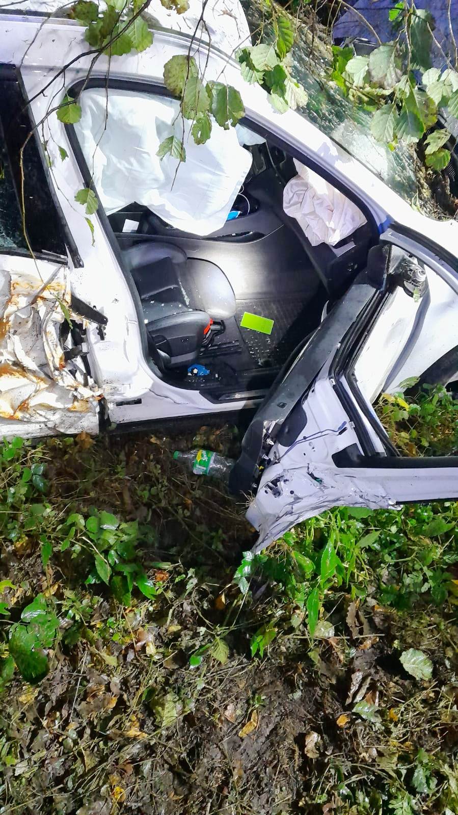 31 października o godzinie 23.48 zastęp z JRG nr 2 w Nowym Sączu zadysponowany został do działań w Łazach Biegonickich. Po przybyciu na miejsce zdarzenia ustalono, że samochód osobowy marki BMW X1 znajdował się w przydrożnym rowie. Samochód wcześniej uderzył w drzewo, które zostało uszkodzone i stwarzało zagrożenie. Pojazdem podróżowało łącznie trzy osoby. Jedna z osób, poszkodowana znajdowała się zakleszczona w pojeździe. Pozostałe dwie osoby znajdowały się poza pojazdem nie uskarżając się na dolegliwości bólowe. Działania zastępu straży polegały na zabezpieczeniu miejsca zdarzenia, oświetleniu terenu działań, odłączeniu klem akumulatora w samochodzie oraz przy użyciu narzędzi hydraulicznych wykonano dostęp do osoby znajdującej się wewnątrz pojazdu. Dokonano oceny stanu osoby w pojeździe. Przybyła karetka Pogotowia Ratunkowego zabrała osobę poszkodowaną do szpitala. Dokonano kontroli pojazdów pod kątem wycieków płynów eksploatacyjnych. Usunięto uszkodzone drzewo przy użyciu pilarki mechanicznej. Działania strażaków trwały ponad godzinę.