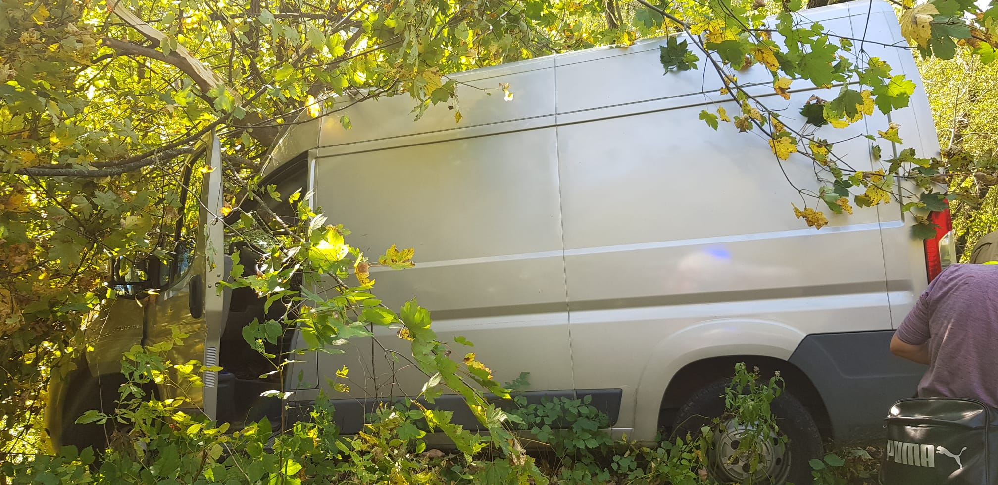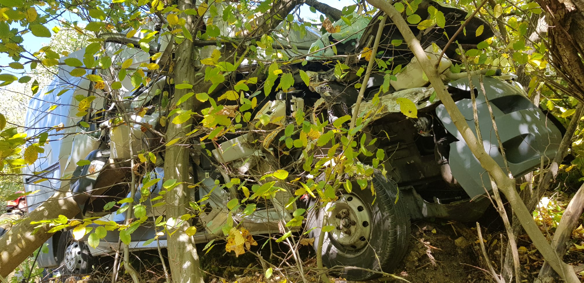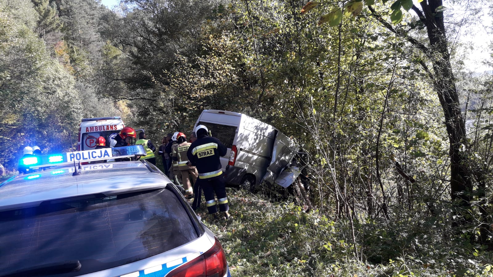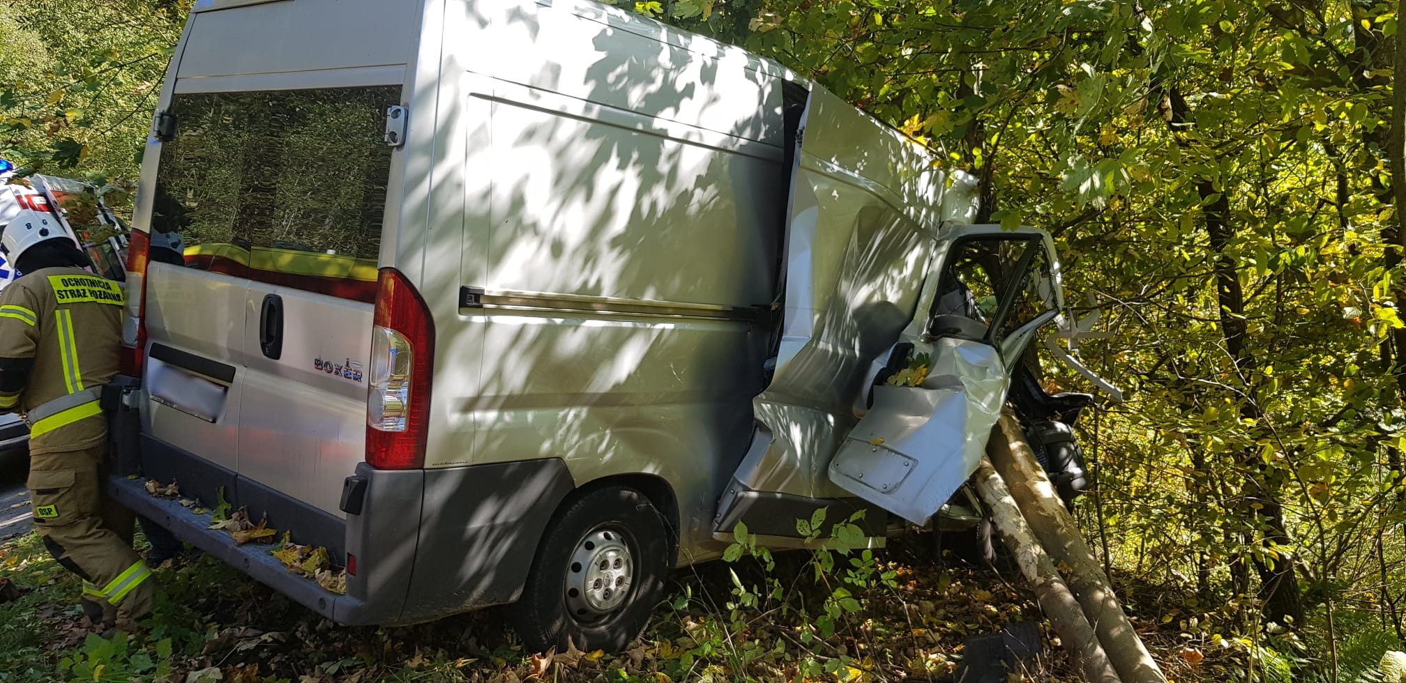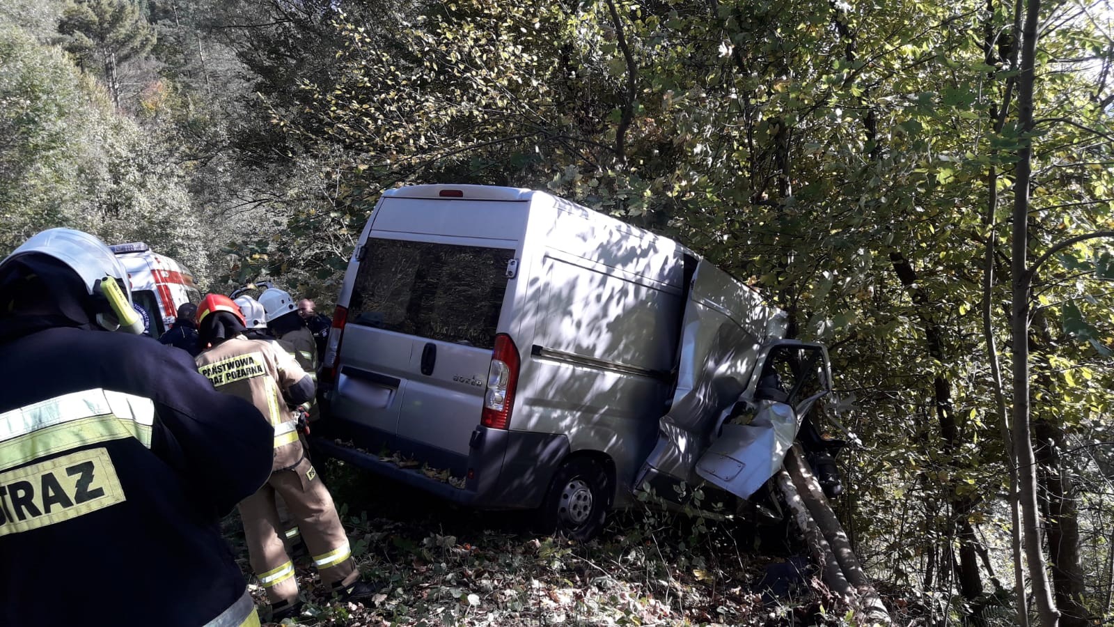 W niedzielę 3 października o godzinie 14.42 zastępy z JRG w Krynicy Zdroju, OSP Muszyna oraz OSP Muszyna Folwark zadysponowane zostały do działań w Leluchowie. Po przybyciu na miejsce zdarzenia ustalono, że samochód marki Peugeot Boxer zjechał z drogi i uderzył w dwa drzewa. Pojazd znajdował się całkowicie poza jezdnią na stromym zboczu drogi poprzecznie do kierunku jazdy. Dalsze przemieszczanie samochodu było zablokowane poprzez drzewa rosnące na nasypie. Pojazdem podróżowało dwie osoby, które opuściły go o własnych siłach i były zaopatrywane przez obecny na miejscu ratowników medycznych Pogotowia Ratunkowego. Działania strażaków polegały na zabezpieczeniu miejsca zdarzenia, odłącznie klem akumulatora oraz kierowanie wahadłowo ruchem drogowym. Osoby uczestniczące w zdarzeniu drogowym zostały przebadane. Kierowca pojazdu pozostał na miejscu a pasażer został zabrany na szczegółowe badania do szpitala. Pojazd został pisemnie przekazany kierowcy, który został pouczony na zaistniałą okoliczność. Na miejscu zdarzenia pozostał patrol Policji, który prowadził czynności dochodzeniowe oraz OSP Muszyna Folwark.