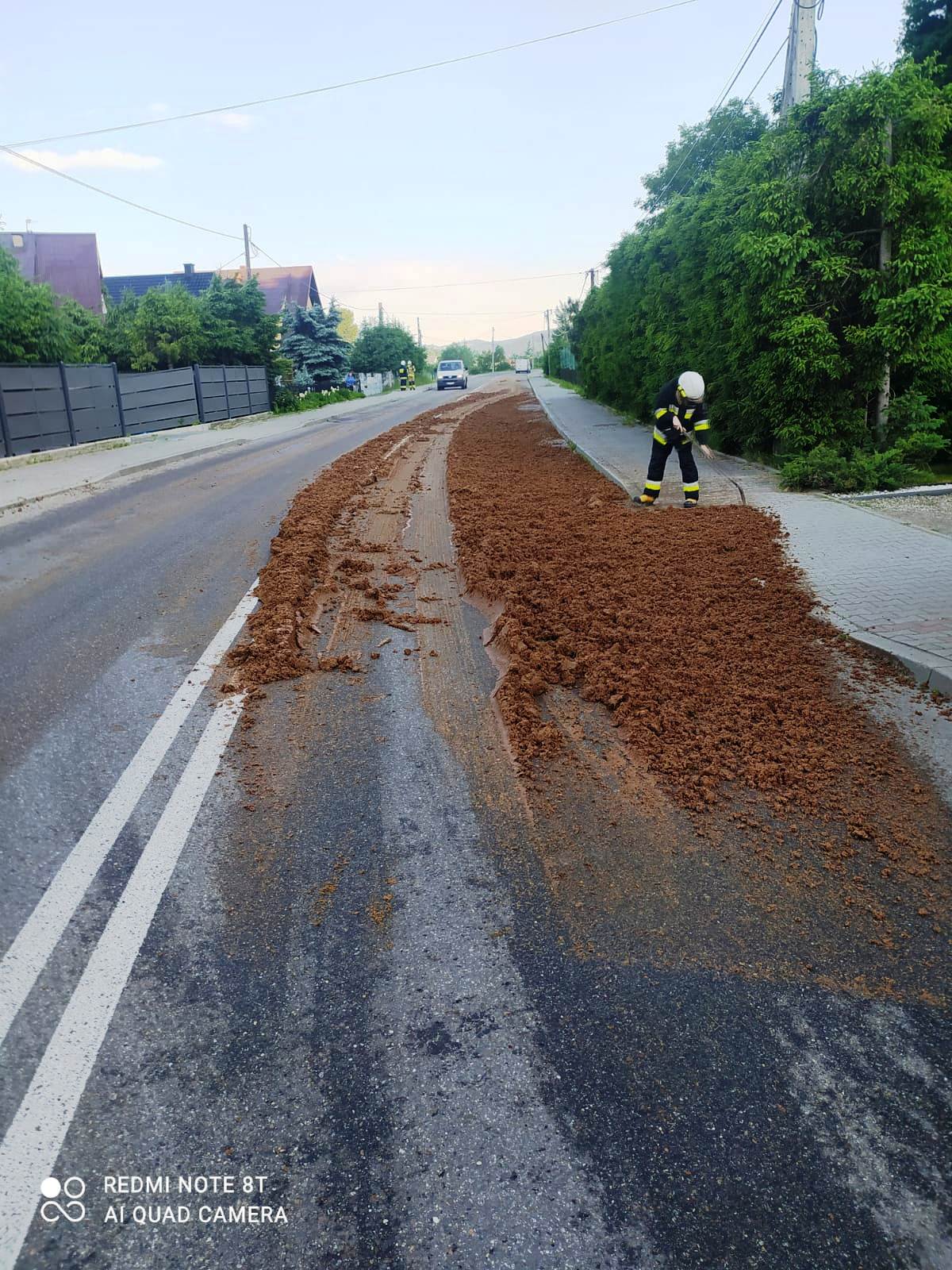 11 czerwca o godzinie 6.25 zastępy z JRG nr 1 w Nowym Sączu oraz OSP Łososina Dolna zadysponowane zostały do działań w Łososinie Dolnej. Po przybyciu na miejsce zdarzenia stwierdzono, że na łuku drogi powiatowej doszło do zsunięcia się przewożonego materiału (wytłoki owocowe) z samochodu ciężarowego Scania. Jeden pas ruchu drogi zanieczyszczony był odpadami na odcinku około pół kilometra. Działania strażaków polegały na zabezpieczeniu miejsca zdarzenia oraz kierowaniu ruchem, który odbywał się wahadłowo. Właściciel firmy przewozowej zorganizował koparkę oraz samochód zastępczy na nieczystości. Po usunięciu wytłoków owocowych cały odcinek drogi zmyto przy użyciu prądów wody. Na ten czas działań droga całkowicie została zamknięta. Na miejsce przybył zarządca drogi, który dopuścił drogę do użytkowania. Działania strażaków trwały dwie i pół godziny.