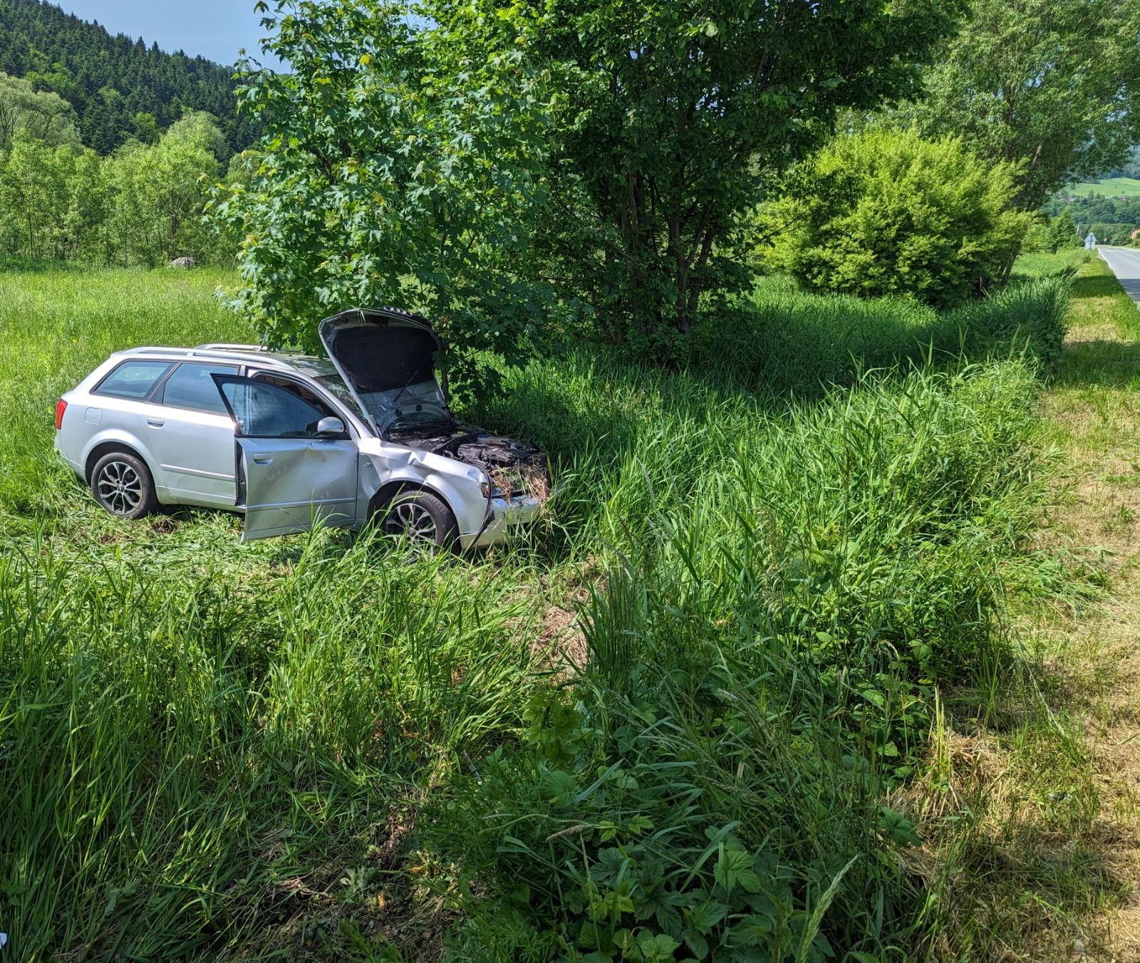 stwierdzono, że samochód osobowy Audi A4 wypadł z drogi i znajdował się na pobliskiej łące. Pojazdem podróżowały dwie osoby, które znajdowały się poza pojazdem. Działania strażaków polegały na zabezpieczeniu miejsca zdarzenia oraz udzieleniu pomocy jednej osobie. Odłączono zasilanie w pojeździe. Kierowano ruchem drogowym na drodze, który odbywał się wahadłowo. OSP Łososina Dolna zabezpieczała miejsce zdarzenia na czas prowadzonych prac dochodzeniowych przez Policję. Po zakończeniu dochodzenia uprzątnięto elementy powypadkowe z jezdni.