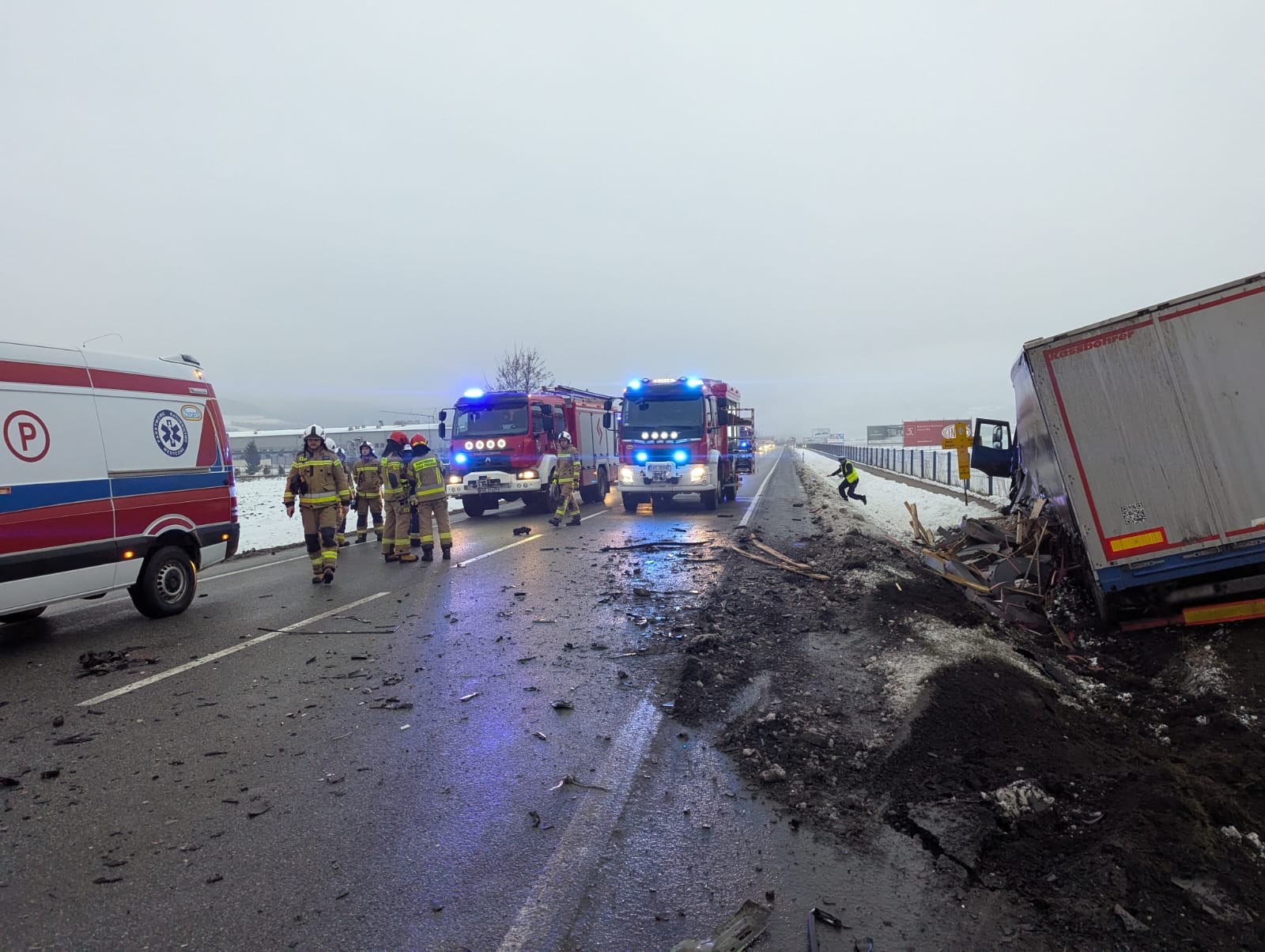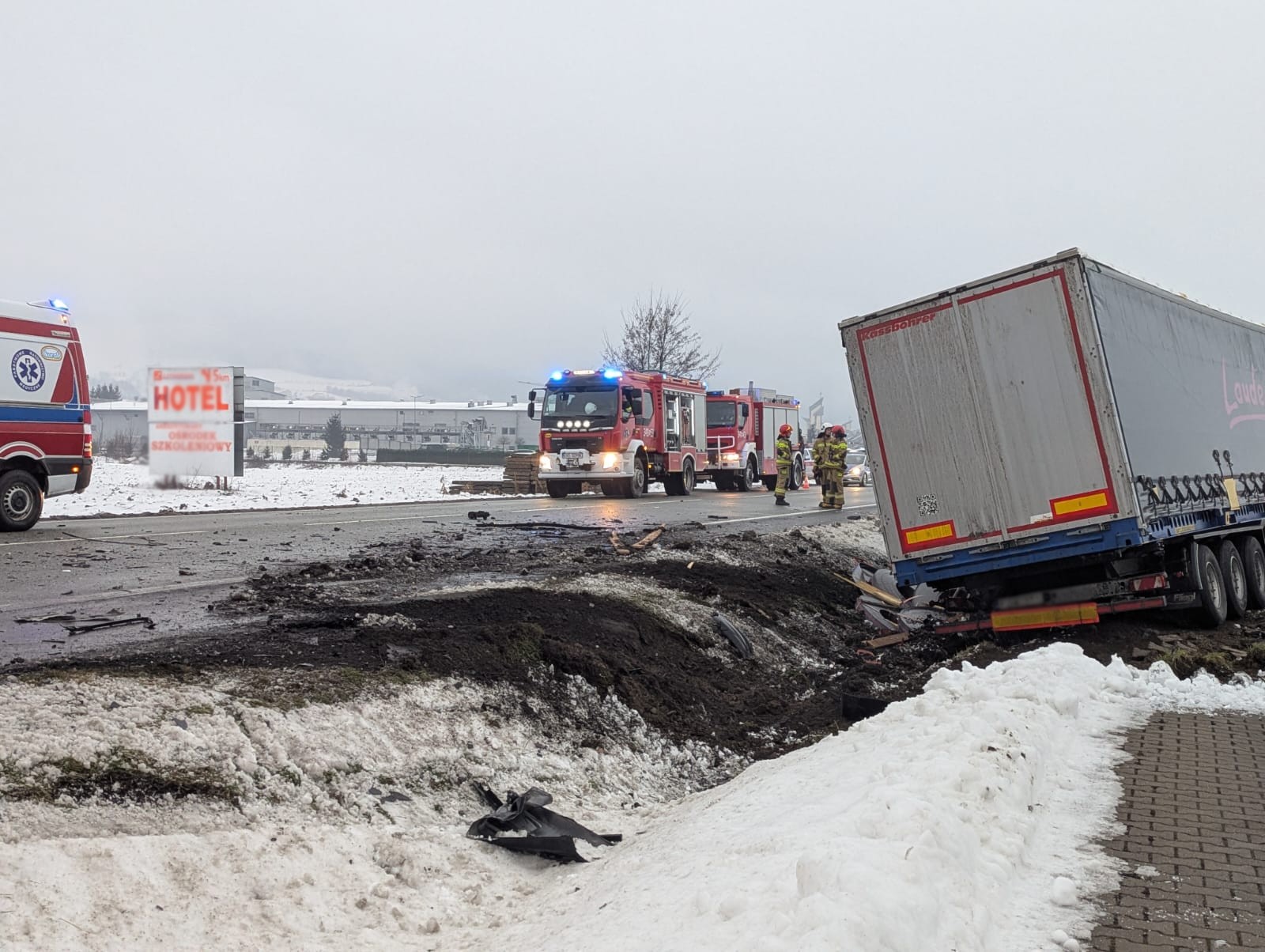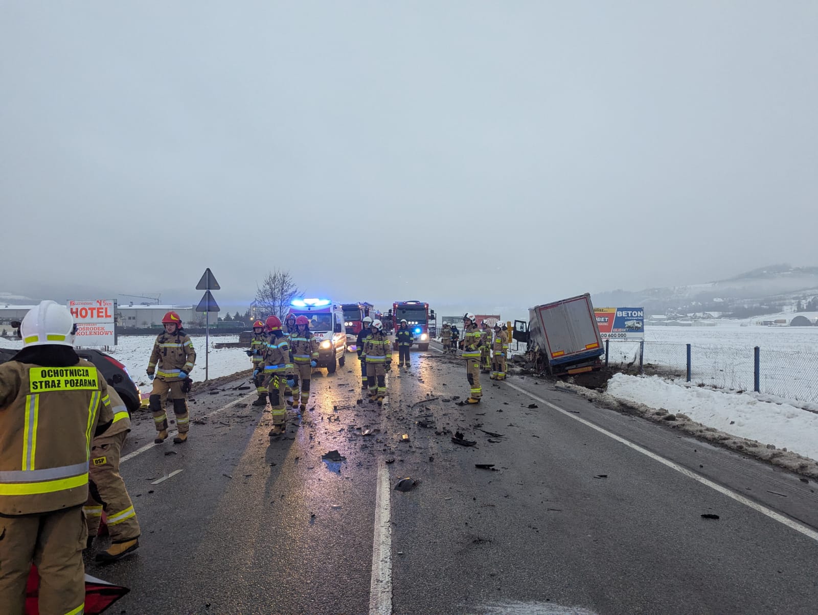 16 stycznia o godzinie 7.02. zastępy z JRG nr 1 w Nowym Sączu, OSP Łososina Dolna, OSP Tęgoborze oraz OSP Tabaszowa zadysponowane zostały do działań w Łososinie Dolnej. Po przybyciu na miejsce zdarzenia ustalono, że na drodze krajowej nr 75, doszło do zderzenia samochodu ciężarowego marki Iveco z naczepą oraz osobowego marki Hyundai. Samochód ciężarowy znajdował się całkowicie poza obrysem jezdni. Pojazd zjechał do przydrożnego rowu oraz częściowo na teren Aeroklubu Podhalańskiego w Łososinie Dolnej. Kierowca opuścił pojazd o własnych siłach i znajdował się w karetce. Samochód osobowy znajdował się częściowo na poboczu drogi oraz skarpie przydrożnego rowu. Osoba kierująca pozostawała w pojeździe. W wyniku obniesionych obrażeń Ratownicy Medyczni odstąpili od udzielania pomocy osobie kierującej samochodem osobowym stwierdzając zgon. Działania strażaków polegały na zabezpieczeniu miejsca zdarzenia oraz odłączeniu zasilania elektrycznego w samochodzie ciężarowym. W samochodzie osobowym akumulator znajdował się poza pojazdem. Ruch drogowy został zamknięty w obu kierunkach. Dalsze działania polegały na rozstawienie parawanu oraz wyznaczeniu tymczasowego objazdu. Czynności dochodzeniowo śledcze prowadziła Policja. Kierujący samochodem ciężarowym został zabrany do szpitala. Wydobyto denata z pojazdu przy pomocy narzędzi hydraulicznych. Przybyłe na miejsce pomoce drogowe zabrały pojazdy uczestniczące w zdarzeniu. Dalsze działania polegały na zmyciu jezdni przy użyciu prądów wody oraz usunięciu pozostałości po zdarzeniu z jezdni. Plamę płynów eksploatacyjnych powodujących śliskość jezdni usunięto poprzez użycie dyspergentu oraz sorbentu. Po udrożnieniu ruchu drogowego w obydwu kierunkach wszystkie zastępy zakończyły działania trwające prawie osiem godzin.