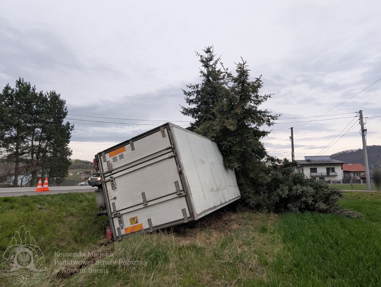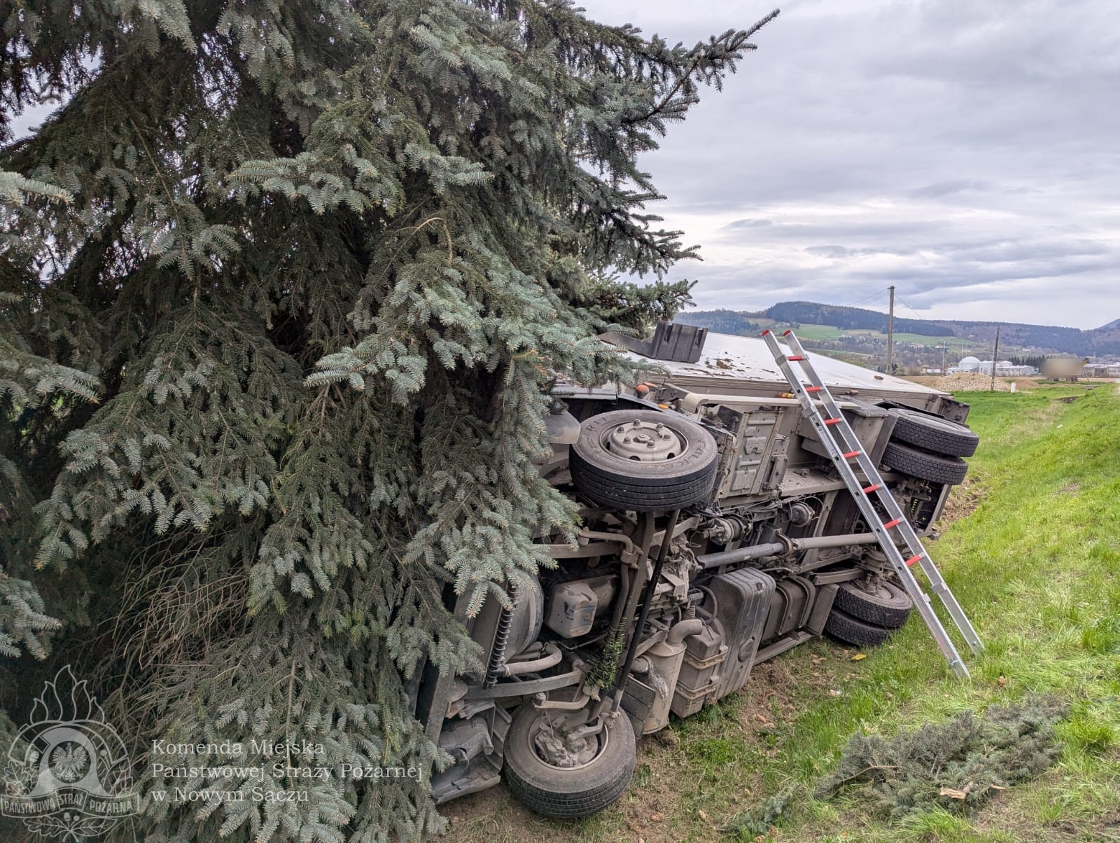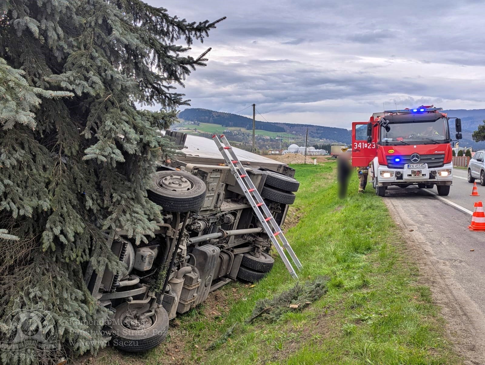 Dnia 15 kwietnia 2025 roku o godzinie 06:32 strażacy z Komendy Miejskiej Państwowej Straży Pożarnej w Nowym Sączu zostali wezwani do zdarzenia drogowego na drodze krajowej DK75 w miejscowości Łososina Dolna. Po przybyciu na miejsce okazało się, że samochód ciężarowy zjechał z jezdni i uderzył w drzewo, po czym znalazł się w pobliskim rowie melioracyjnym na prawym boku.