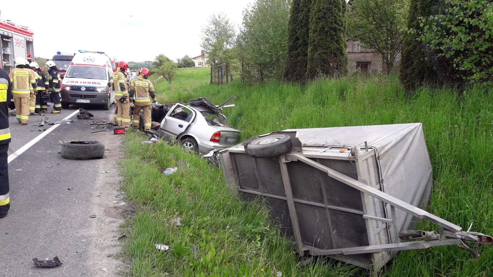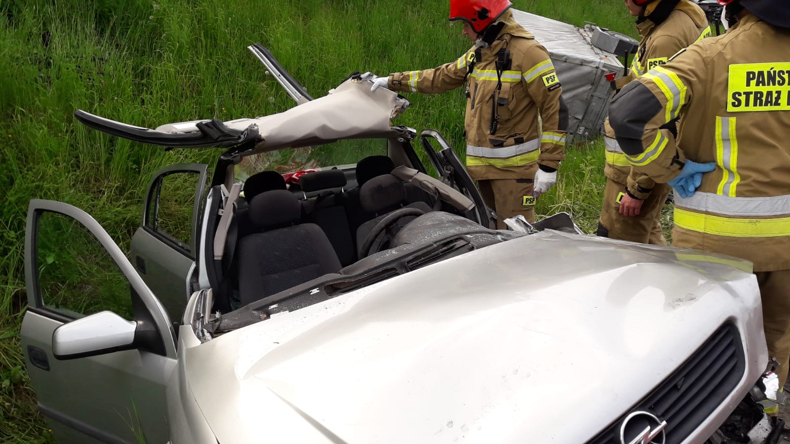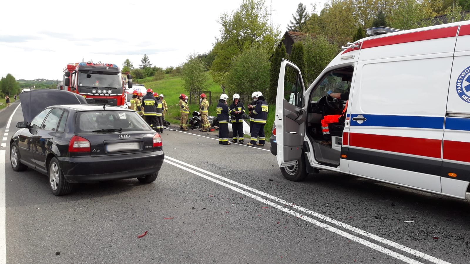 21 maja około godziny 16.21 zastępy z JRG nr 1 w Nowym Sączu, OSP Łososina Dolna oraz OSP Tęgoborze zadysponowane zostały do działań w Łososinie Dolnej. Po przybyciu na miejsce zdarzenia stwierdzono, że na DK75 w doszło do zderzenia trzech pojazdów. Pojazd marki Opel wraz z przyczepą, którym podróżowało dwie osoby znajdował się częściowo w rowie. Jeden z pasażerów znajdował się już poza pojazdem, a drugi zakleszczony w pojeździe znajdował się pod opieką ratowników medycznych Pogotowia ratunkowego. Pojazd marki Hyundai, którym podróżował kierujący znajdował się częściowo w rowie. Kierujący opuścił pojazd przed przybyciem strażaków. Pojazd marki Audi, którym podróżował kierowca znajdował się na pasie jezdni. Z pojazdów nastąpiły wycieki płynów eksploatacyjnych. Droga była całkowicie zablokowana. Działania strażaków polegały na zabezpieczeniu miejsca zdarzenia, stworzeniu dostępu do osoby poszkodowanej znajdującej się w pojeździe marki Opel. W tym celu wykorzystano nożyce hydrauliczne, za pomocą których usunięto dach pojazdu. Ewakuowano osobę poszkodowaną na deskę ortopedyczną i przetransportowano do karetki pogotowia. Odłączono akumulatory w pozostałych pojazdach. Po zakończeniu czynności dochodzeniowych przez Policje, usunięto pojazd Marki Audi na pobocze. Dokonano sorpcji rozlanych płynów eksploatacyjnych oraz usunięto pozostałości pokolizyjne z jezdni. Wprowadzono ruch wahadłowy. Karetki Pogotowia zabrały z miejsca zdarzenia łącznie dwie osoby. Na miejsce zdarzenia przybyła Pomoc Drogowa. Zastępy z JRG 1 Nowy Sącz zakończyły działania, na miejscu pozostały dwie jednostki OSP w celu pomocy w organizacji ruchu drogowego do czasu usunięcia pojazdów z miejsca zdarzenia przez Pomoc Drogową. Działania strażaków trwały dwie i pół godziny.