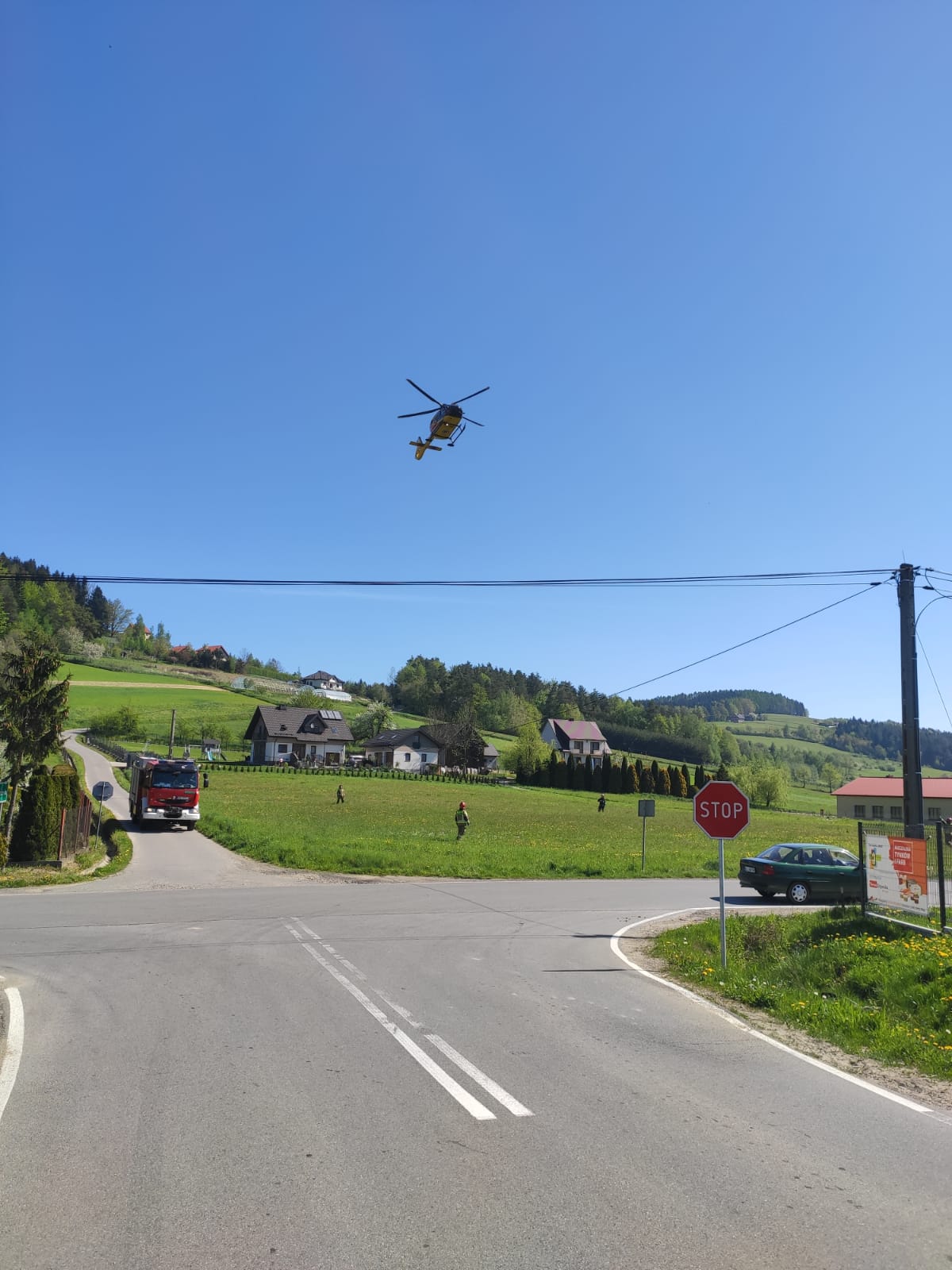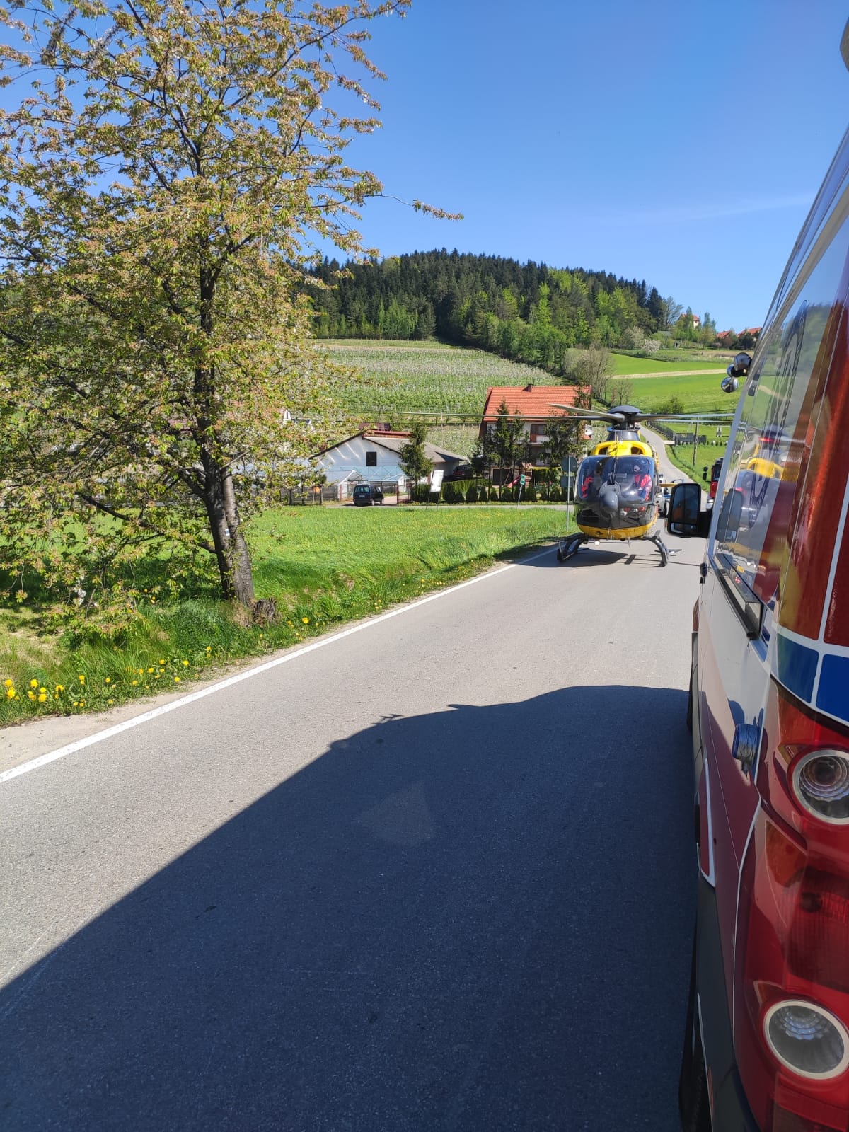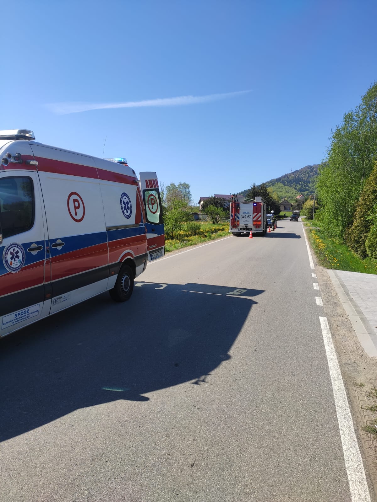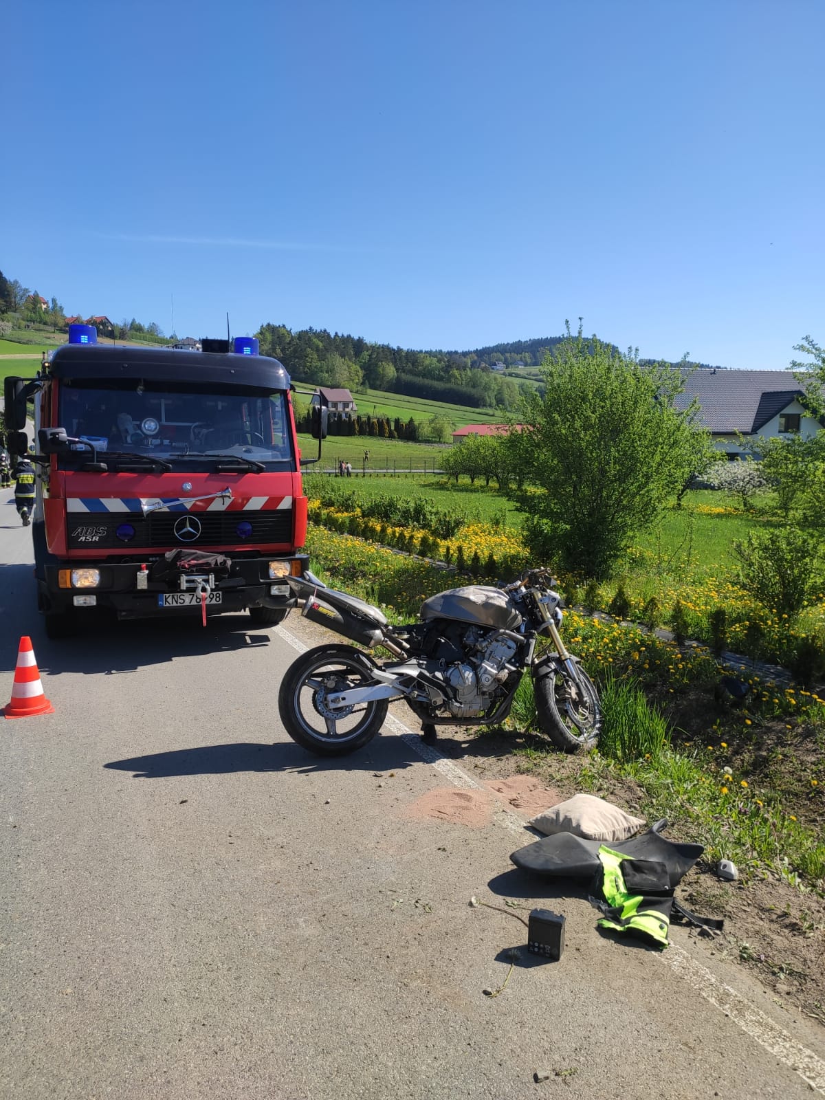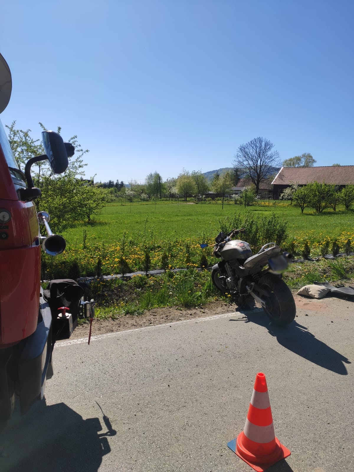12 maja około godziny 9.19 zastępy z JRG nr 1 w Nowym Sączu oraz OSP Tęgoborze zadysponowane zostały do działań w Łyczance. Po przybyciu na miejsce zdarzenia stwierdzono, że w zdarzeniu udział brał jeden pojazd tj. motocykl Honda Hornet. Jednośladem jechał sam kierujący, który w chwili przybycia na miejsce pierwszego zastępu straży znajdował się poza jezdnią i był poszkodowany. Uszkodzony motocykl znajdował się na jednym pasie drogi powodując utrudnienia w ruchu innych pojazdów. Działania zastępów straży polegały na zabezpieczeniu miejsca zdarzenia oraz udzieleniu poszkodowanemu kwalifikowanej pierwszej pomocy. Rozłączono instalację elektryczną w uszkodzonym jednośladzie. Dalsze działania zastępów straży polegały na pomocy ratownikom medycznym w transporcie wstępnie zabezpieczonego pacjenta do przybyłej karetki Pogotowia Ratunkowego. Wstrzymano ruchu w miejscu wypadku. Zorganizowano lądowisko dla śmigłowca LPR oraz zabezpieczono jego start i lądowanie. Kierowano ruchem drogowym podczas wykonywania czynności przez funkcjonariuszy Policji, który odbywał się wahadłowo. Przemieszczono uszkodzony motocykl poza drogę. Kierujący został przetransportowany do szpitala. Działania strażaków trwały prawie dwie godziny.