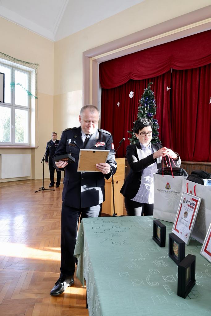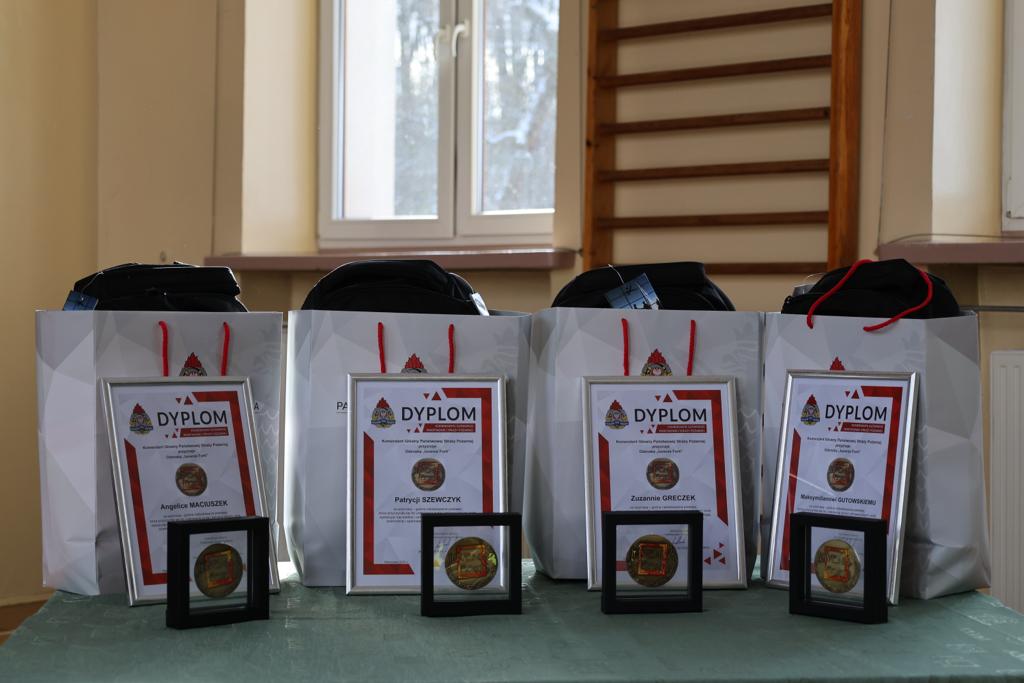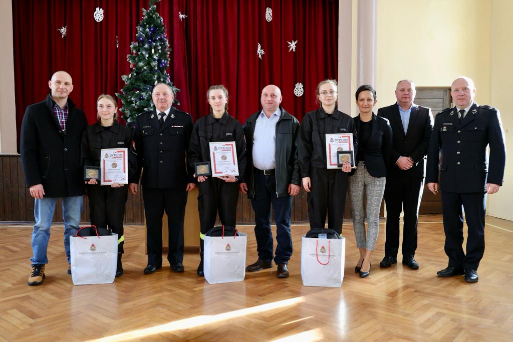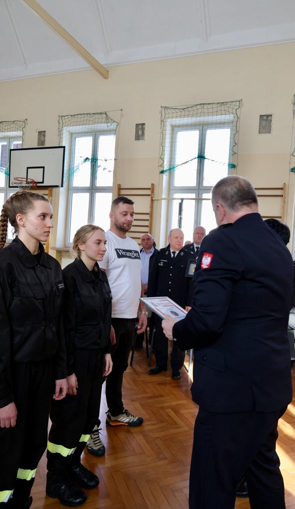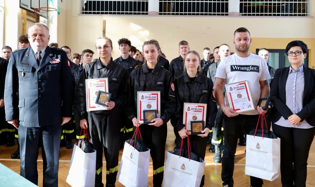 12 stycznia w Zespole Szkół im. Władysława Orkana w Marcinkowicach podczas uroczystej zbiórki, Komendant Miejski PSP w Nowym Sączu st.bryg. Paweł Motyka wręczył w imieniu Komendanta Głównego PSP odznaki „Iuvenis Forti” czwórce oczniów szkoly tj. Zuzannie Greczek, Patrycji Szewczyk, Angelice Maciuszek oraz Maksymilianowi Gutowskiemu. 31 października 2023 roku trzy uczennice klasy pożarniczej i uczeń klasy policyjnej oczekiwali w godzinach prannych na autobus do szkoły. W pewnej chwili z budynku zlokalizowanego na ulicy 1 Maja w Nowym Sączu oderwała się połać tynku, która spadła na głowę mężczyzny siedzącego w pobliżu przystanku autobusowego. Mężczyzna upadł na ziemię. W wyniku zdarzenia doznał urazu głowy. Uczniowie przystapili bez chwili wahania do udzielenia pierwszej pomocy osobie poszkodowanej, udzielając wsparcia psychicznego, stabilizując kręgosłup w odcinku szyjnym, zatamowali krwotok z ran cietych oraz założyli opatrunki wykorzystując nieszablonowe metody tamowania krwanienia. Prowadzone przez uczniów działania trwały do czasu przybycia do miejsca zdarzenia karetki Pogotowia Ratunkowego oraz zastępu straży pożarnej. Uczennice klasy pożarniczej wykonywały czynności ratunkowe a uczeń klasy policyjnej wzorowo przekazał zgłoszenie do WCPR Kraków. W imieniu Maksymilina Gutowskiego odznakę odebrał tata, gdyż Maksymilian przebywa na zgrupowaniu sportowym.