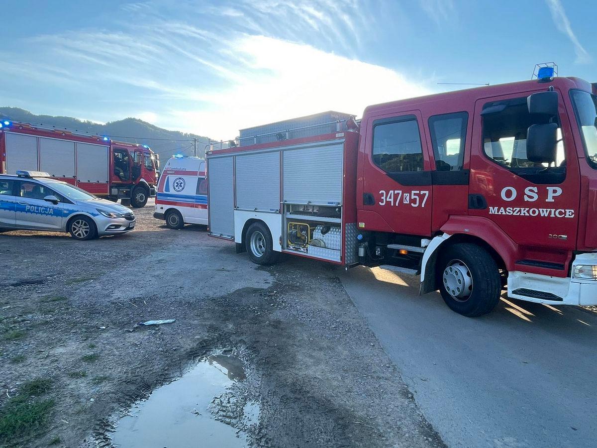 9 sierpnia o godzinie 18.28 zastępy z JRG nr 2 w Nowym Sączu oraz OSP Maszkowice zadysponowane zostały do działań w Maszkowicach. Po przybyciu na miejsce zdarzenia ustalono, że doszło do zdarzenia drogowego z udziałem samochodu osobowego i motocykla. Samochód osobowy znajdował się na poboczu. Motocykl znajdował się na jezdni. Samochodem osobowym podróżował sam kierujący, który opuścił pojazd o własnych siłach i nie uskarżał się na żadne dolegliwości. Motocyklem podróżował kierujący, który w wyniku zdarzenia doznał obrażeń. Przed przybyciem na miejsce zastępów straży pożarnej osoby postronne udzieliły pomocy mężczyźnie. Działania zastępów straży polegały na zabezpieczeniu miejsca zdarzenia oraz odpięciu klem akumulatorów w pojazdach. Oceniono stan osoby poszkodowanej oraz udzielono mu wsparcia.. Na miejsce przybyła karetka Pogotowia ratunkowego, załodze której przekazano osobę poszkodowaną. Osoba poszkodowana została zabrana do szpitala. Po zakończeniu czynności dochodzeniowych przez Policję przemieszczono pojazdy na pobocze drogi oraz uprzątnięto pozostałości po kolizji. Działania strażaków trwały ponad dwie godziny.
