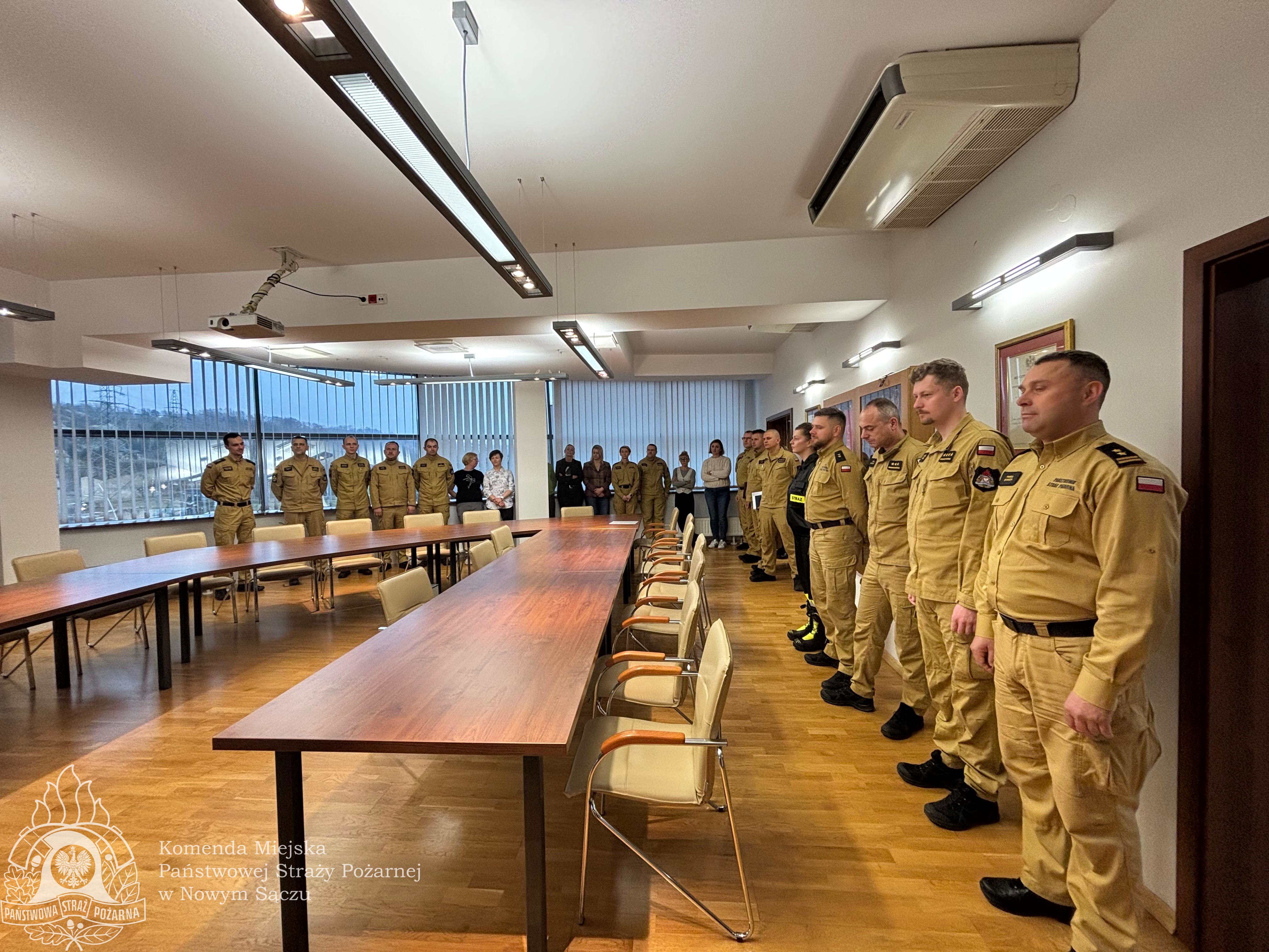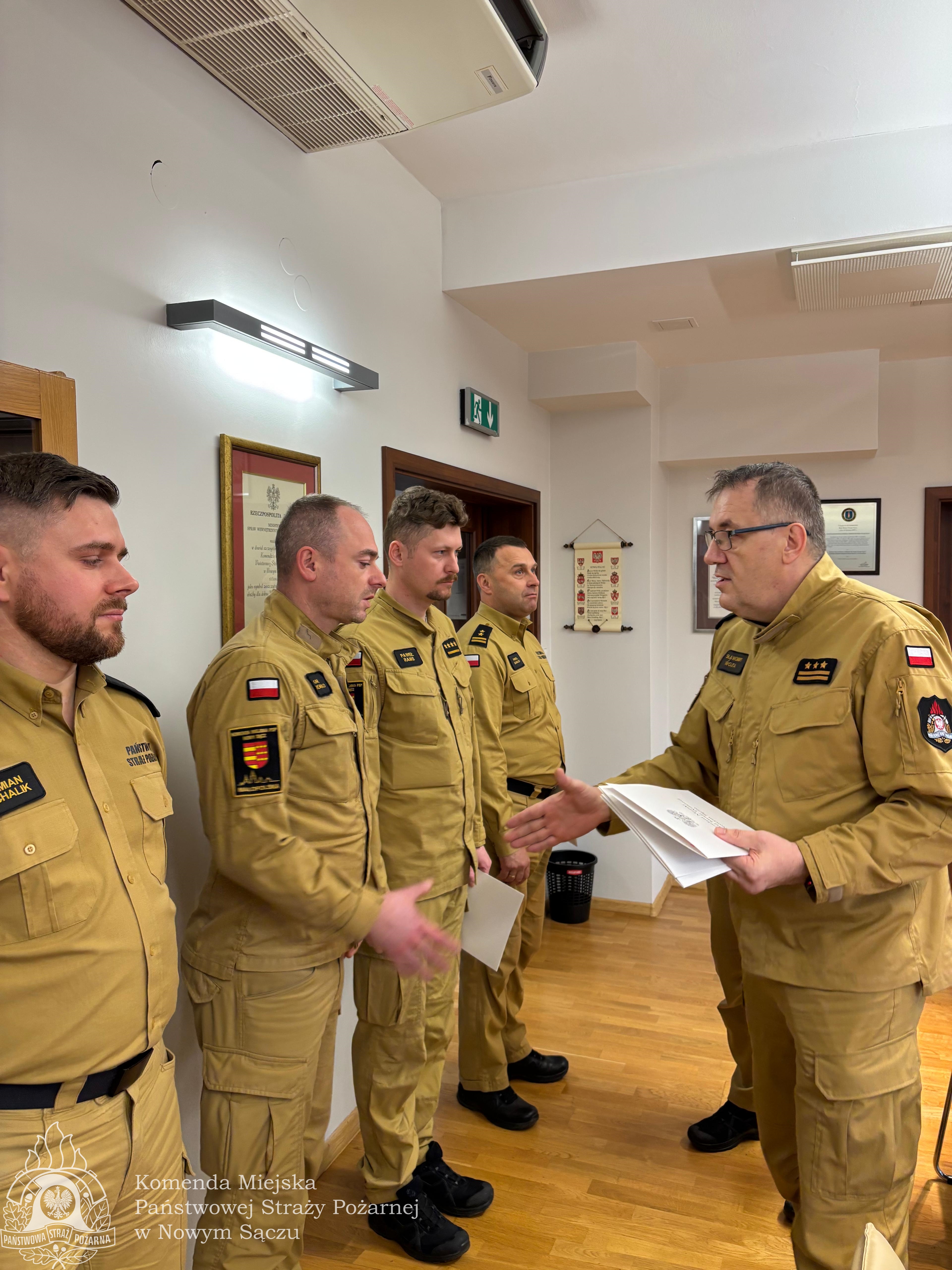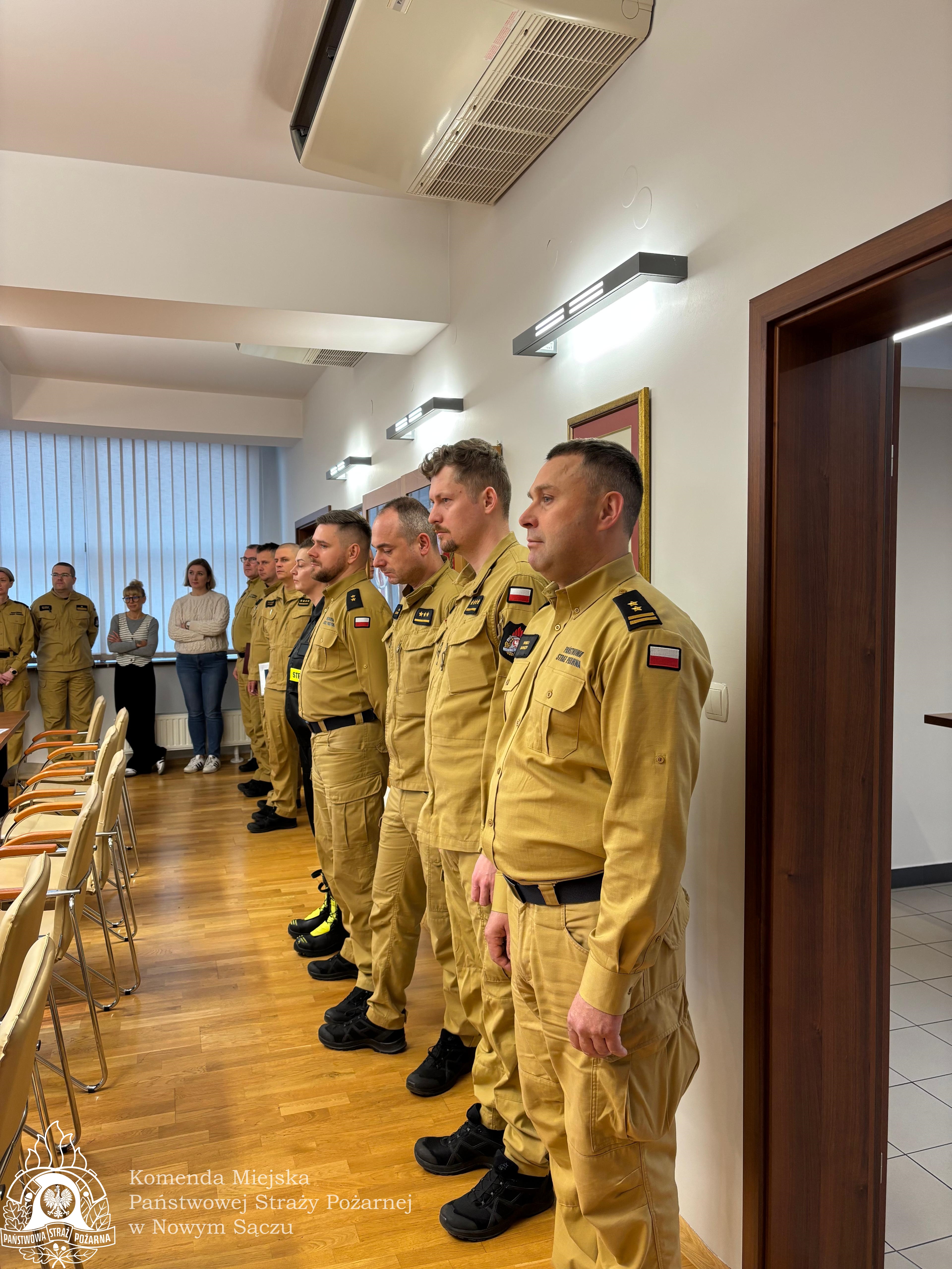 1 kwietnia 2025 r. w siedzibie Komendy Miejskiej Państwowej Straży Pożarnej w Nowym Sączu odbyła się zbiórka, podczas której Komendant Miejski PSP st. bryg. Sławomir Wojta wraz z zastępcą bryg. Arturem Kloze dokonał mianowania funkcjonariuszy na nowe stanowiska służbowe oraz przyjął nowego strażaka do służby przygotowawczej.