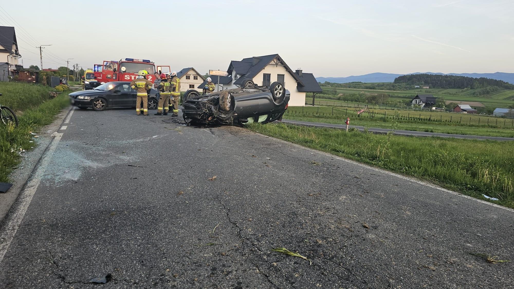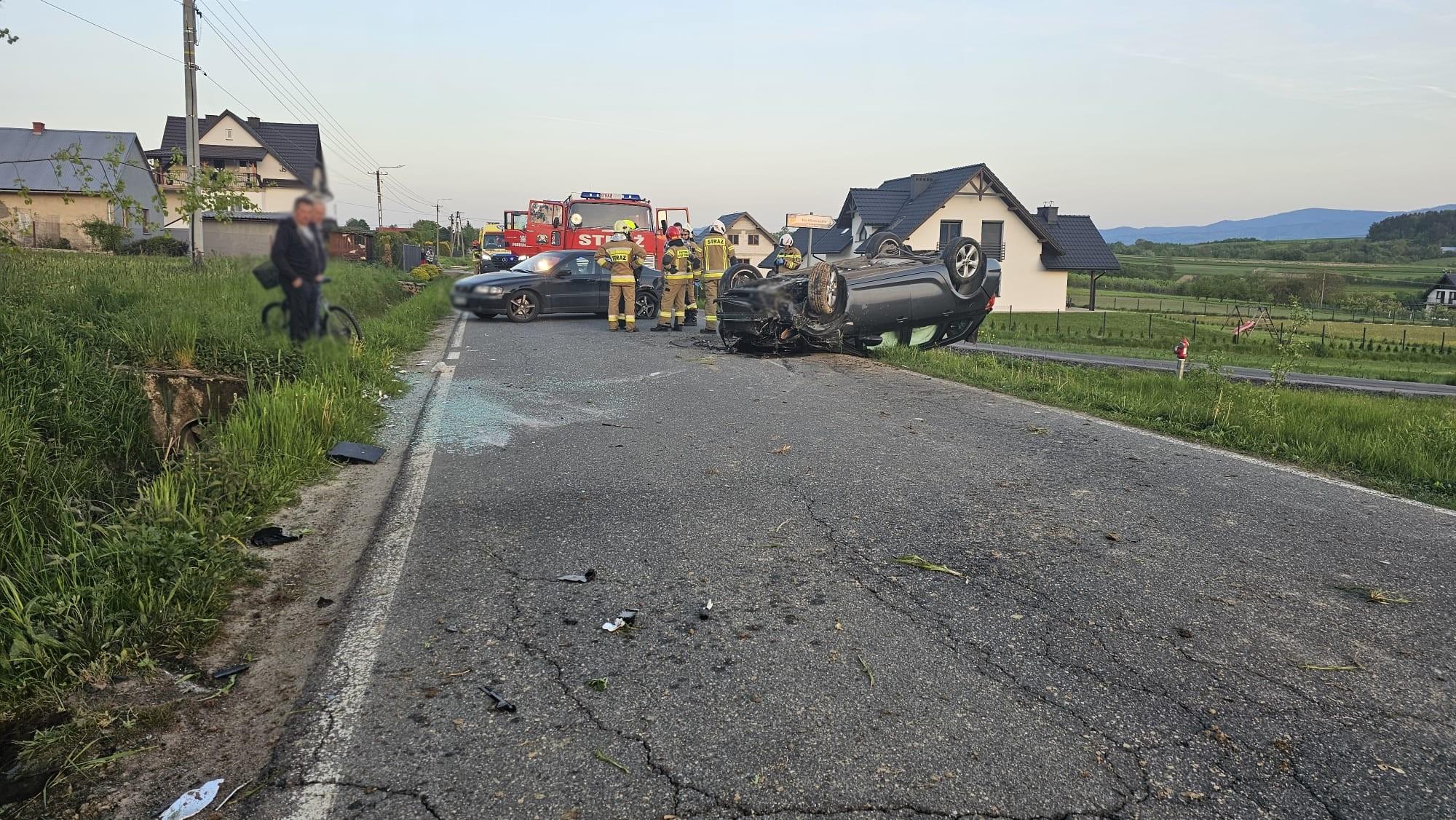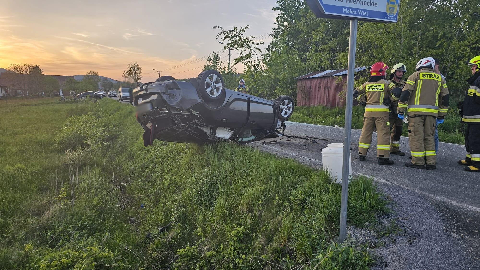 29 kwietnia o godzinie 19.11 zastępy z JRG nr 1 w Nowym Sączu, OSP Mokra Wieś oraz OSP Podegrodzie zadysponowane zostały do działań w Mokrej Wsi. Po przybyciu na miejsce zdarzenia ustalono, że na drodze powiatowej doszło do zderzenia samochodu Opel Astra oraz Volvo S60. Po zderzeniu Opel uderzając w przepust dachował. Samochodem jechał sam kierujący, który opuścił pojazd o własnych siłach. Kierujący uskarżał się na dolegliwości bólowe. Pojazd znajdował się na dachu częściowo wisząc nad przydrożnym rowem. Volvo znajdowało się na kołach bokiem do kierunku jazdy i blokował jezdnię. Samochodem Volvo podróżowały dwie osoby, nie uskarżały się one na dolegliwości bólowe. Nastąpił wyciek płynów eksploatacyjnych z samochodu Opel. Działania strażaków polegały na zabezpieczenie miejsca zdarzenia oraz udzieleniu pomocy osobie poszkodowanej. Osobę poszkodowaną przekazano przybyłej na miejsce załodze karetki Pogotowia ratunkowego. Odpięto klemy akumulatorów w samochodach. Ruch drogowy kierowano na objazdy. Oświetlono teren działań. Na miejscu zdarzenia pozostały zastępy OSP w celu zabezpieczenia terenu działań na czas prowadzonych czynności przez Policję oraz w celu usunięcia samochodów i pozostałości z jezdni. Działania strażaków trwały ponad pięć godzin.