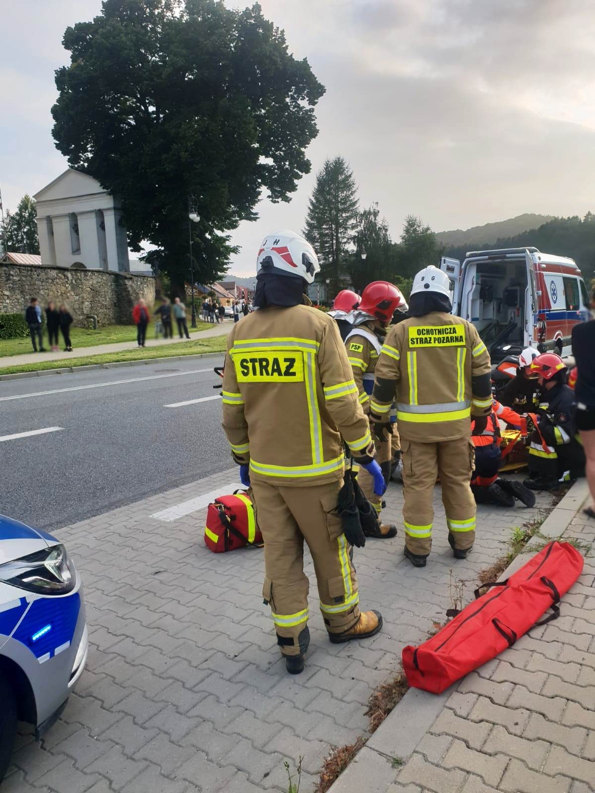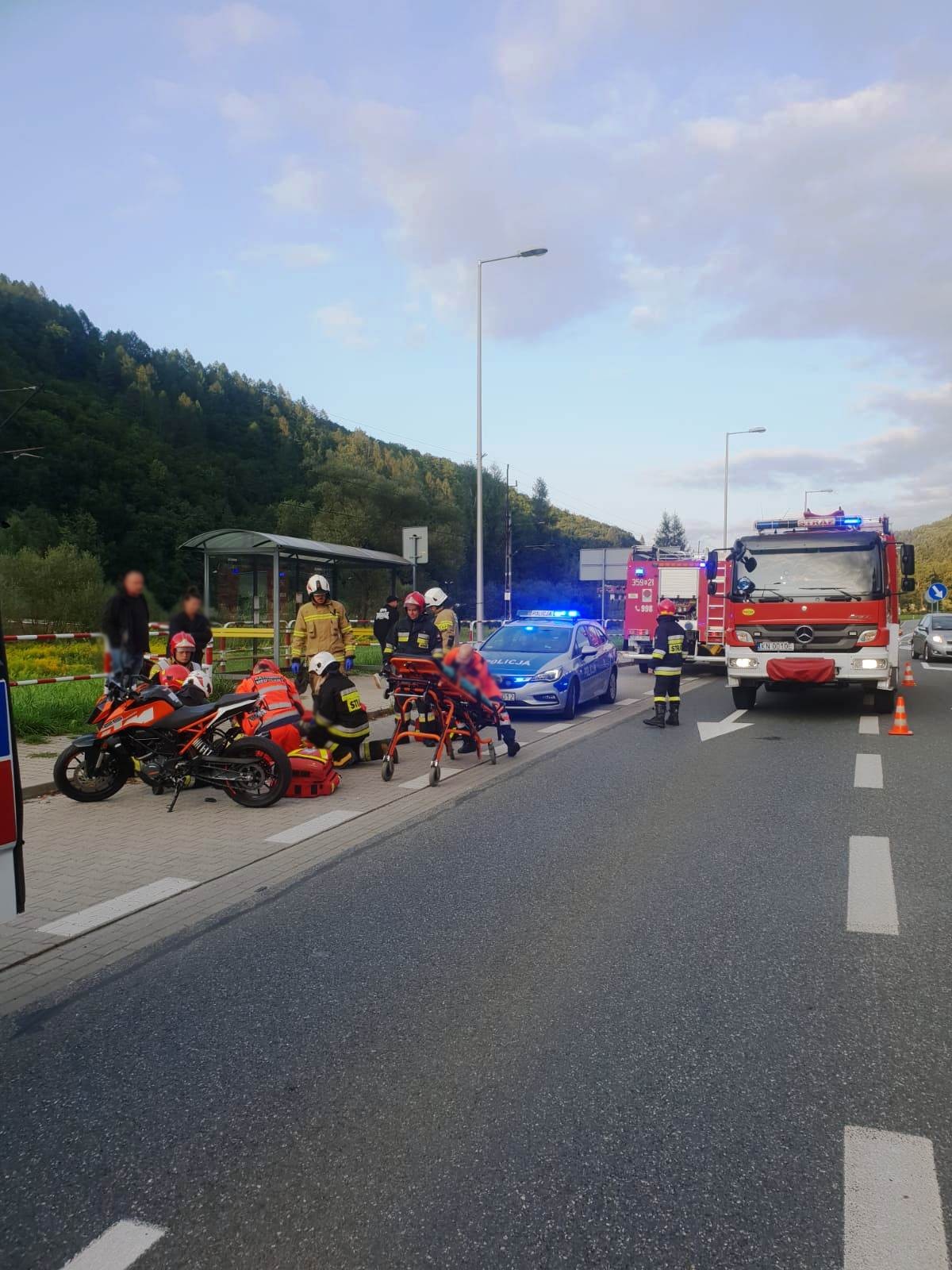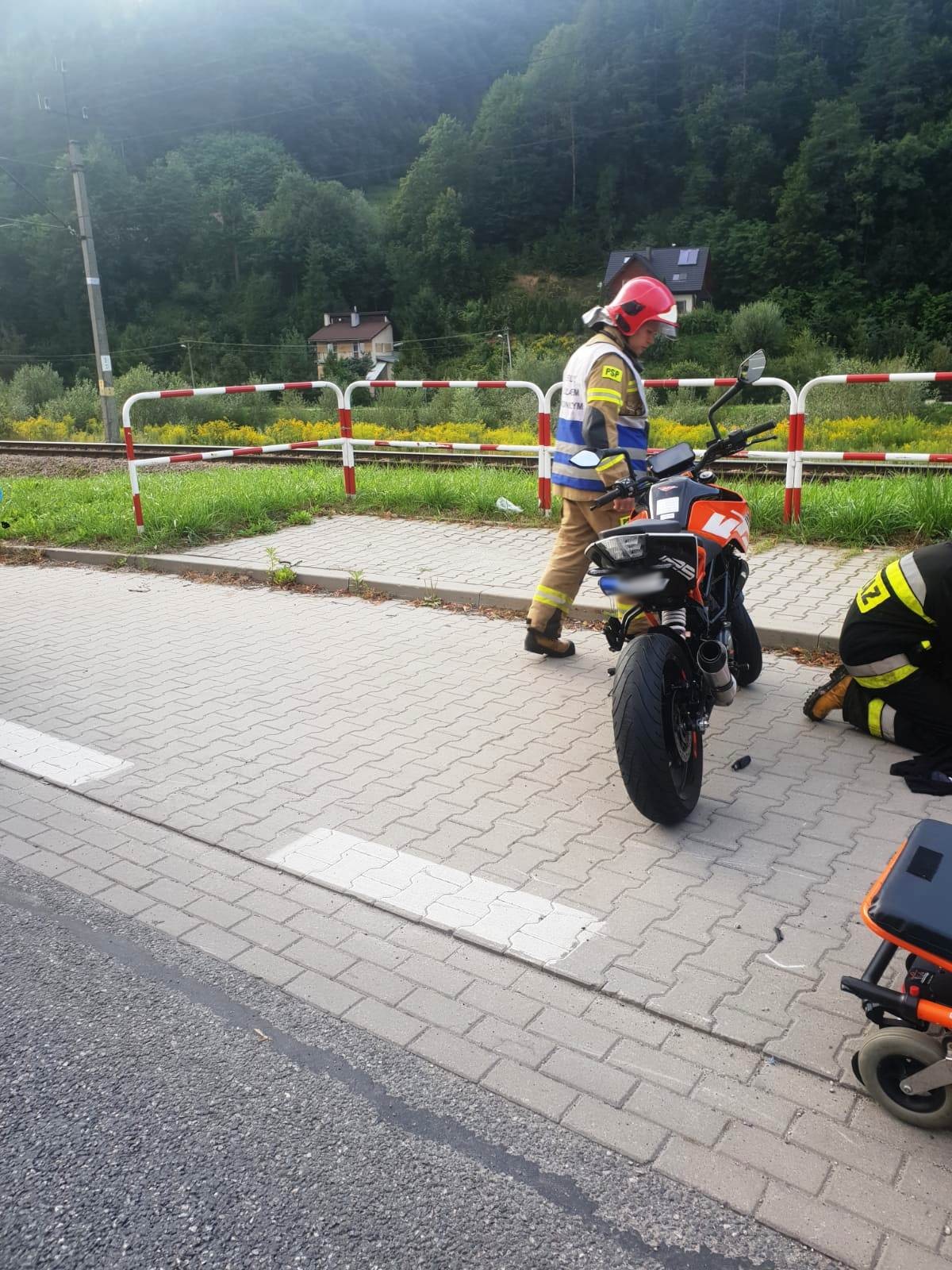 25 sierpnia o godzinie 18.24 zastępy z JRG w Krynicy Zdroju oraz OSP Muszyna zadysponowane zostały do działań na ulicę Grunwaldzką w Muszynie. Po przybyciu na miejsce zdarzenia ustalono, że na drodze wojewódzkiej doszło do zderzenia samochodu osobowego marki KIA SPORTAGE z motocyklem KTM DUKE. Pojazdami podróżowały łącznie trzy osoby tj. samochodem osobowym marki dwie osoby dorosłe a motocyklem jedna osoba w wieku 17 lat. Pojazdy uczestniczące w zdarzeniu oraz kierujący motocyklem znajdowali się poza jezdnią na zatoczce autobusowej. Pasażerowie samochodu osobowego nie uskarżali się na żadne dolegliwości, natomiast kierujący motocyklem był przytomny, leżał na wznak i uskarżał się na dolegliwości. Działania strażaków polegały na zabezpieczeniu miejsca zdarzenia oraz udzieleniu pomocy poszkodowanemu motocykliście. Motocyklistę przekazano przybyłej załodze karetki Pogotowia Ratunkowego. Dalsze działania polegały na podniesieniu motocykla i sprawdzeniu czy nie doszło do wycieków. Strażacy kierowali wahadłowo ruchem drogowym oraz udzielili pomocy ratownikom Pogotowia ratunkowego w zaopatrzeniu oraz transporcie osoby poszkodowanej do karetki. Karetka Pogotowia zabrała osobę poszkodowaną do szpitala. Z uwagi na to że zdarzenie miało miejsce poza drogą i nie występowały wycieki, strażacy po godzinie zakończyli swoje działania. Na miejscu w celu prowadzenia czynności dochodzeniowych pozostał patrol Policji.