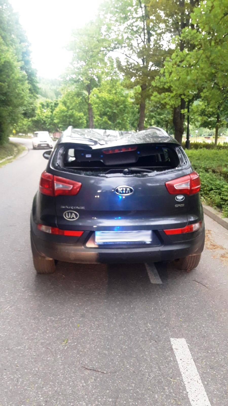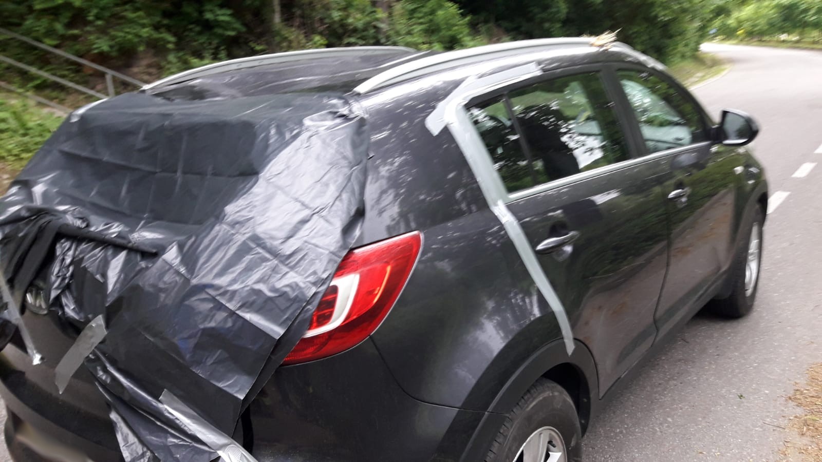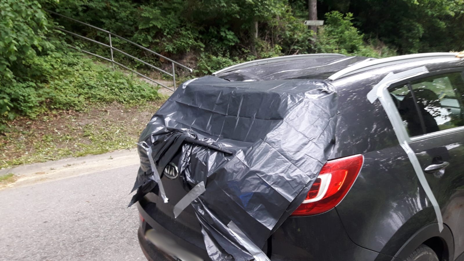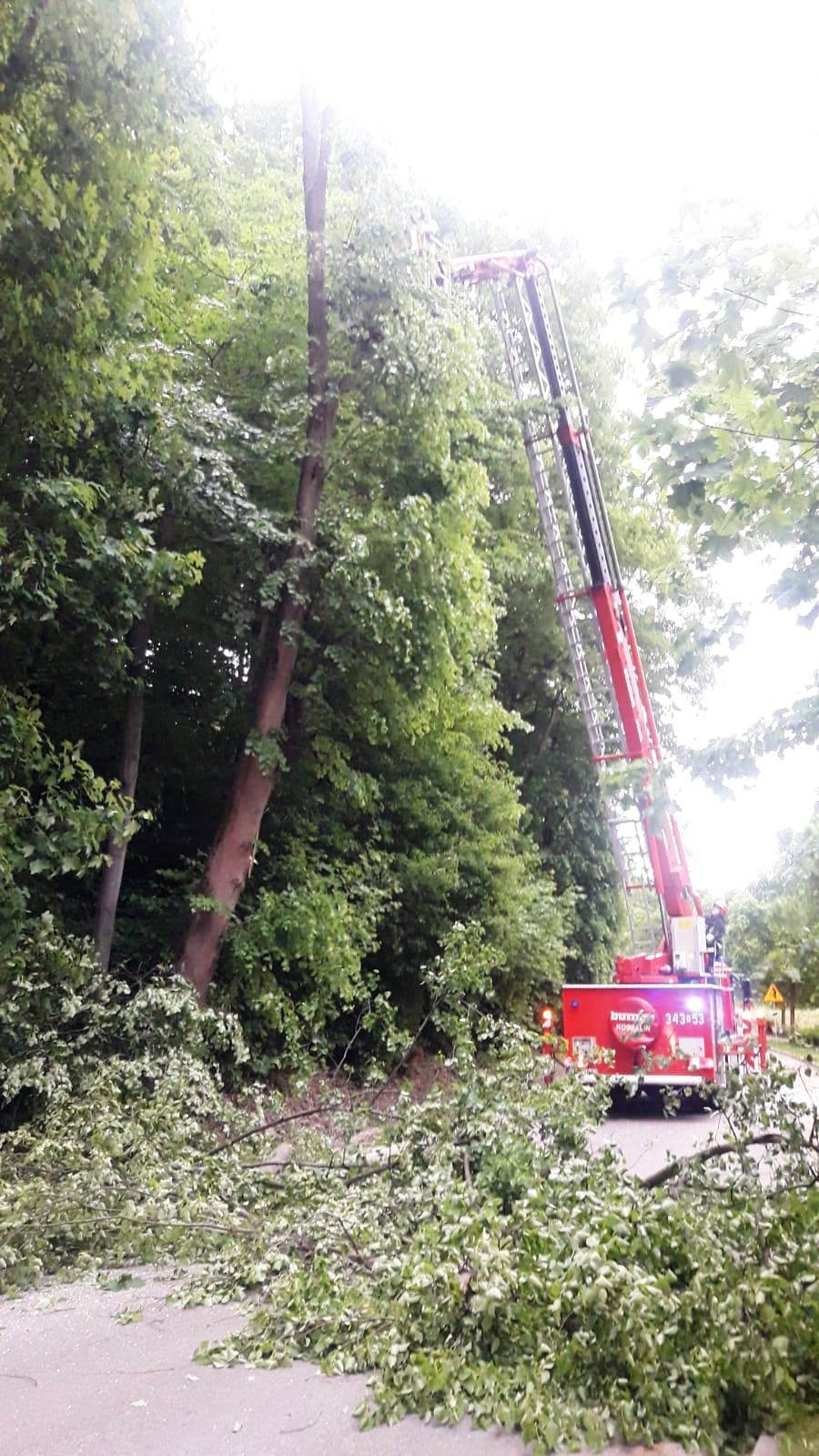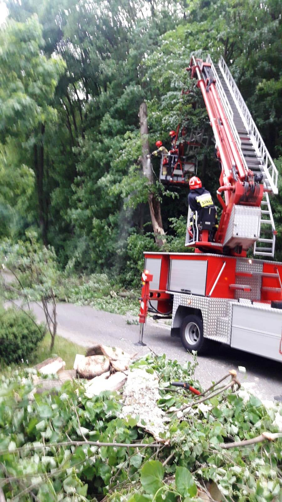 27 maja o godzinie 17.14 zastępy z JRG w Krynicy Zdroju oraz OSP Muszyna zadysponowane zostały do działań w Muszynie na ulicę Zdrojową. Po przybyciu na miejsce zdarzenia ustalono, że w wyniku silnych podmuchów wiatru rozszczepieniu i złamaniu uległa lipa. Odłamana odnoga drzewa spadła na jezdnie uderzając w przejeżdżający tam w tym momencie samochód osobowy marki KIA. Pojazdem podróżowało cztery osoby obywatele Ukrainy w tym dwie dorosłe kobiety i dwoje dzieci w wieku 7 i 10 lat. Osoby podróżujące pojazdem nie uskarżały się na żadne dolegliwości i nie potrzebowały pomocy. Po przybyciu na miejsce zdarzenia strażakow rozstawiono samochód podnośnik hydrauliczny. Do kosza udała się rota strażaków w odpowiednim zabezpieczeniu i rozpoczęto wycinkę drzewa począwszy od górnych jego warstw. Po zakończeniu wycinki drzewa pocięte części usunięto poza obrys drogi. Z uwagi na wydłużający się czas oczekiwania na pomoc drogową obywateli Ukrainy oraz pogarszające się warunki atmosferyczne zabezpieczono uszkodzony pojazd na wypadek opadów poprzez zafoliowane rozbitej szyby w klapie bagażnika oraz zaklejeniu taśmą. Na tym działania strażaków trwające ponad półtorej godziny zakończono.