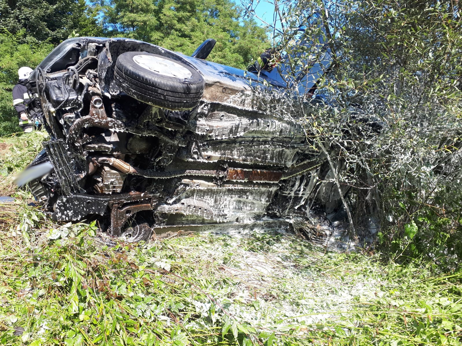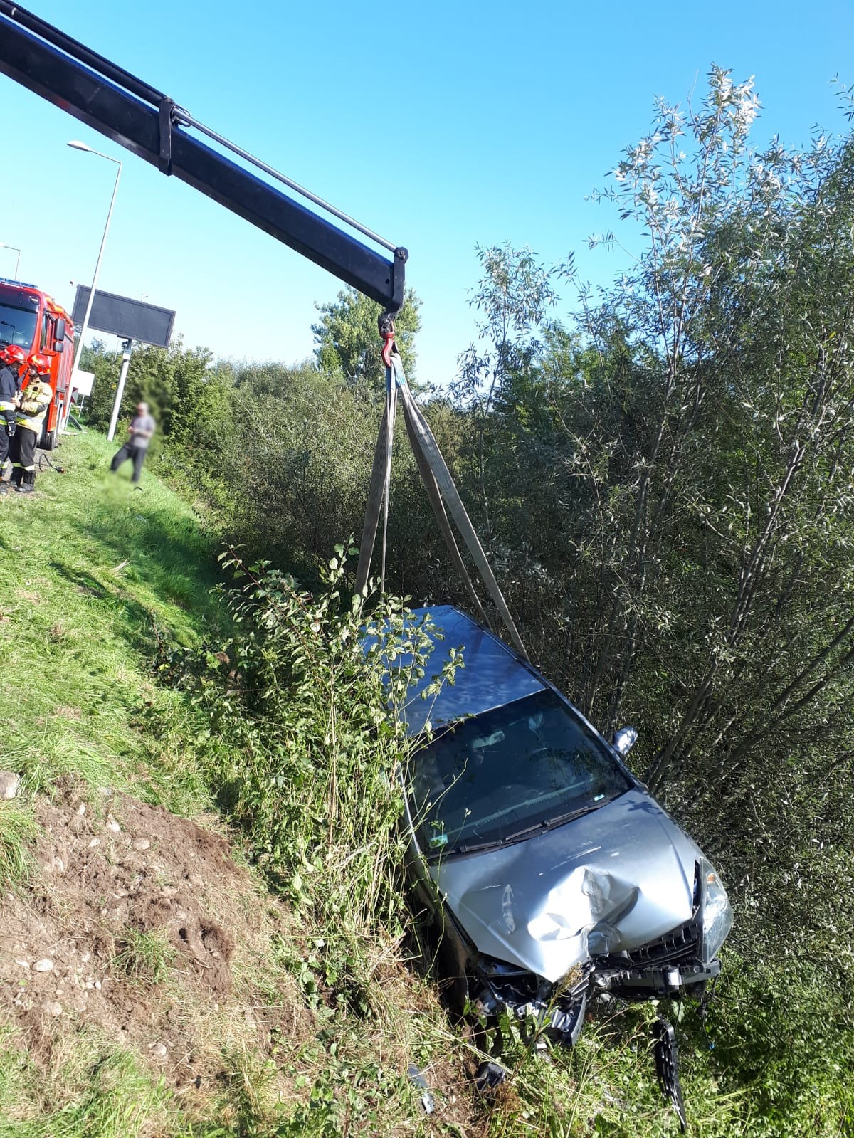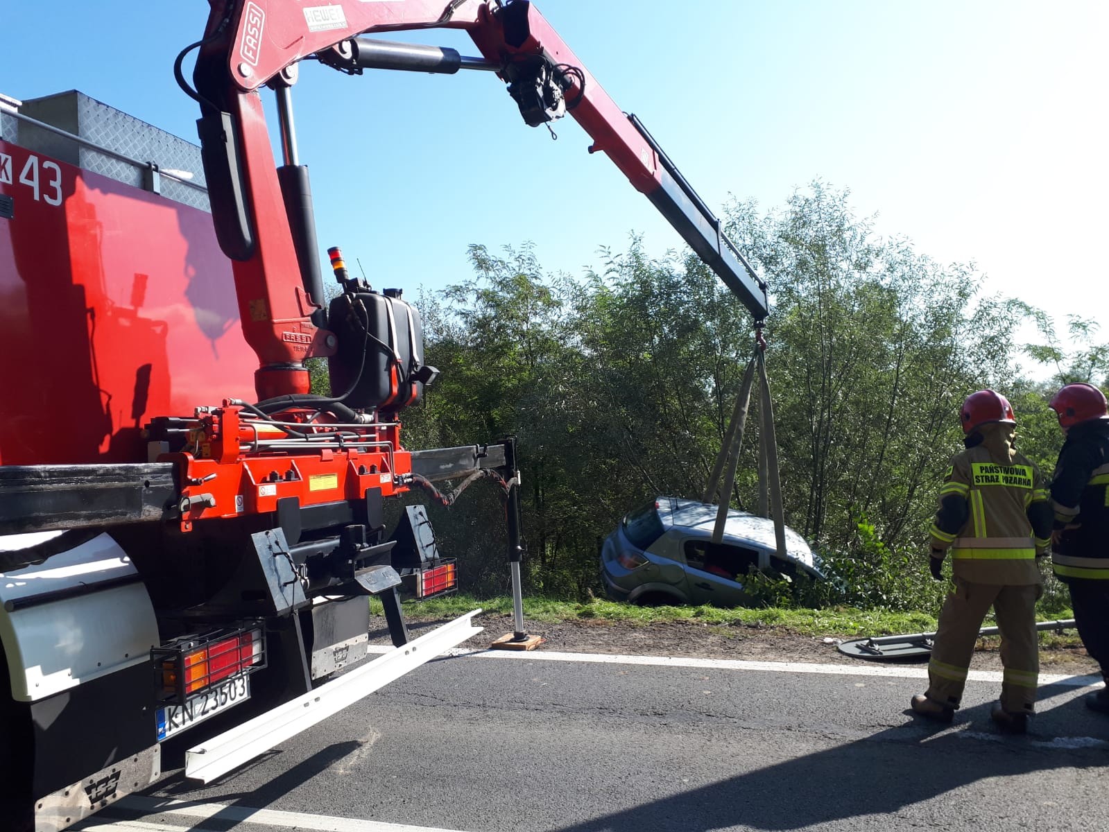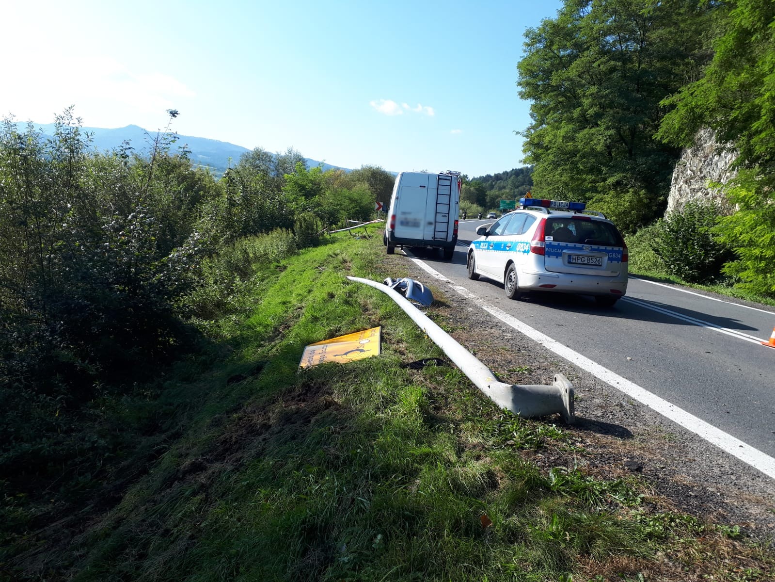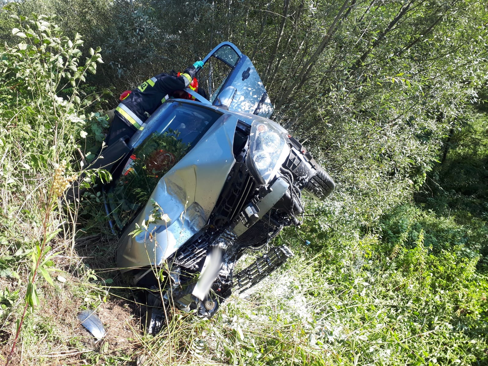 26 września o godzinie 10.18 zastępy z JRG nr 2 w Nowym Sączu, OSP Naszacowice oraz OSP Podegrodzie zadysponowane zostały do działań w Naczacowicach. Po przybyciu na miejsce zdarzenie ustalono, że samochód marki Opel Astra, którym podróżowała sama kierująca na łuku drogi wypadł z jezdni, uderzył w latarnię oraz znaki drogowe zatrzymując się na drzewach na skarpie. Poszkodowana kobieta znajdowała się na zewnątrz pojazdu pod opieką świadków będących na miejscu zdarzenia. Ruch na drodze odbywał się wahadłowo. Działania zastępów straży polegały na zabezpieczeniu miejsca zdarzenia, odłączeniu klem akumulatora, zakręceniu zaworu butli z gazem oraz kierowaniu wahadłowo ruchem drogowym. Dalsze działania polegały na udzieleniu pomocy osobie poszkodowanej oraz zadysponowaniu na miejsce zdarzenia karetki Pogotowia ratunkowego. Sprawdzono napięcie na wystającym z ziemi przewodzie elektrycznym - napięcia nie stwierdzono. Zabezpieczono taśmą wystający przewód. Sprawdzono pojazd pod kątem wycieków płynów eksploatacyjnych. Stwierdzono duży wyciek benzyny oraz wycieki innych płynów eksploatacyjnych. Rozwinięto linię gaśniczą i podano prąd piany ciężkiej na podwozie samochodu oraz na obszar wokół pojazdu. Dokonano sorpcji rozlanych płynów eksploatacyjnych. Z uwagi na brak możliwości ograniczenia wycieku benzyny podjęto decyzję o zadysponowaniu samochodu na miejsce ciężkiego samochodu ratownictwa technicznego z JRG nr 1 w Nowym Sączu. Pracownicy Pogotowia Energetycznego odłączyli zasilanie do uszkodzonej latarni. Na czas wydobycia pojazdu, wstrzymano ruch pojazdów w obu kierunkach. Samochód został wydobyty na pobocze drogi. Po przebadaniu kobiety przez ratowników Pogotowia Ratunkowego poszkodowana została na miejscu zdarzenia. Na miejsce przybył samochód Pomocy Drogowej, który zabrał uszkodzony pojazd. Uprzątnięto znaki, latarnię oraz pozostałości powypadkowe i pozostawiono je w bezpiecznym miejscu na poboczu drogi. Działania strażaków trwały ponad dwie godziny. Na miejscu zdarzenia pozostał patrol Policji, który prowadził czynności wyjaśniające okoliczności zdarzenia.
