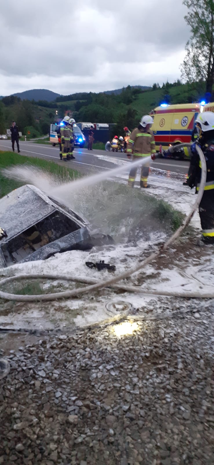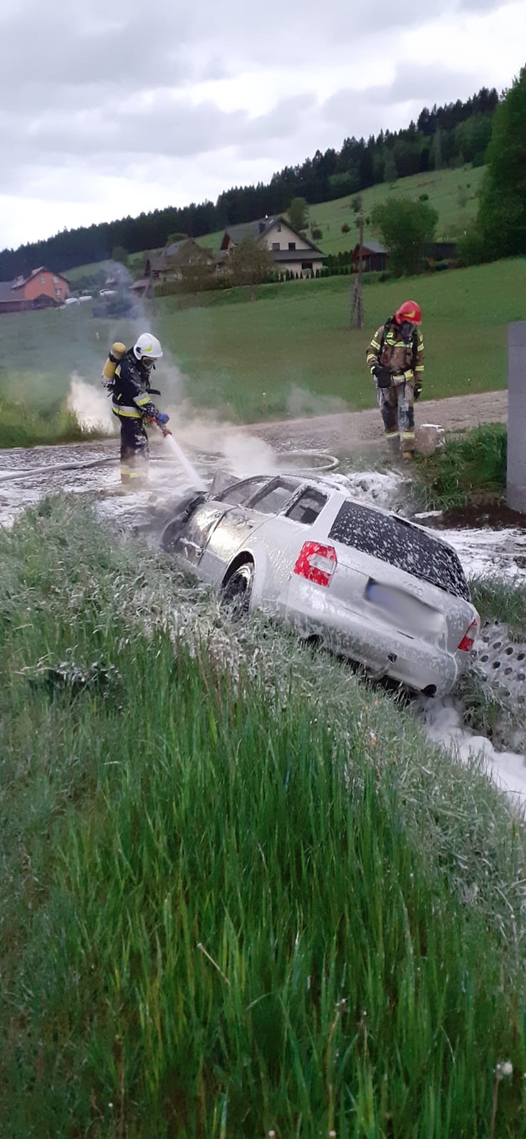 22 maja o godzinie 4.21 zastępy z JRG w Krynicy Zdroju, OSP Łabowa oraz OSP Nowa Wieś zadysponowane zostały do działań w Nowej Wsi. Po przybyciu na miejsce zdarzenia ustalono, że samochód osobowy marki Audi A4 wypadł z drogi i uderzył w przydrożny przepust. W wyniku tego zdarzenia doszło do pożaru pojazdu. Samochodem podróżowało dwóch mężczyzn w wieku 19 lat. Podróżującym w opuszczeniu pojazdu pomocy udzieliły osoby postronne przed przybyciem na miejsce strażaków. W chwili przybycia pierwszego zastępu pożar samochodu był już rozwinięty i obejmował przednią część pojazdu, a osoby poszkodowane w pozycji leżącej i siedzącej znajdowały się na poboczu. Działania strażaków polegały na zabezpieczeniu miejsca zdarzenia, udzieleniu pomocy osobom poszkodowanym oraz ugaszeniu pożaru. Obu poszkodowanych przekazano przybyłym załogom karetek Pogotowia Ratunkowego. Równocześnie strażacy gasili pianą samochód. Obydwie osoby zostały przewiezione do szpitala. Po zabraniu poszkodowanych do szpitala przestawiono samochody służb ratowniczych i udrożniono ruch. Na prośbę Policji na miejscu zdarzenia pozostał zastęp OSP Nowa Wieś w celu pomocy w czynnościach dochodzeniowych.