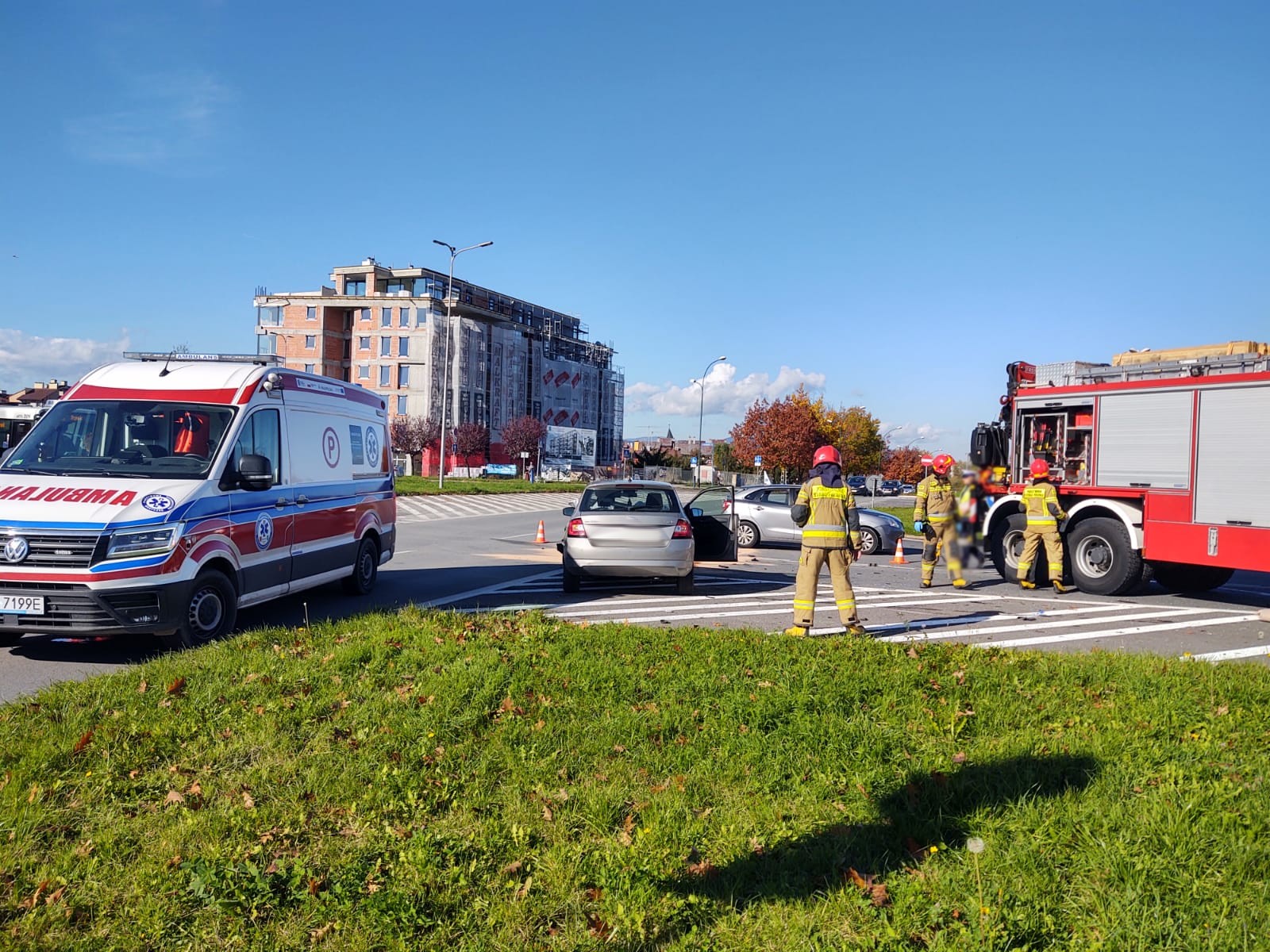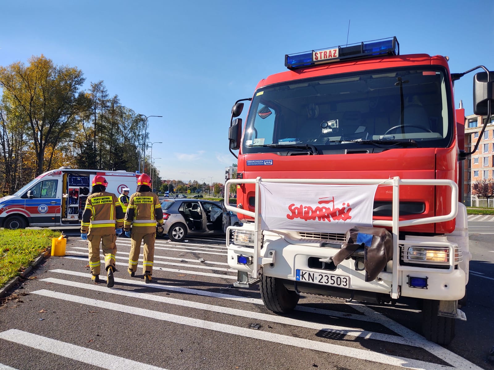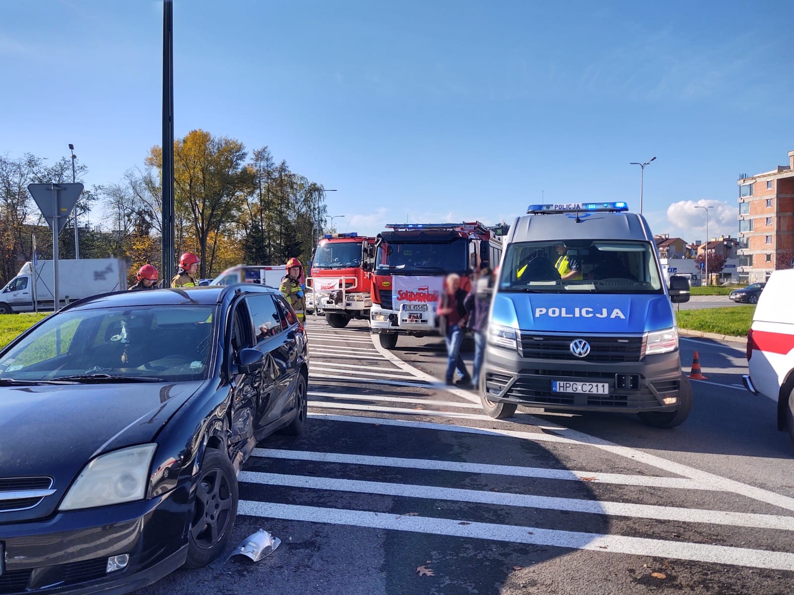 26 października o godzinie 11.36 zastępy z JRG nr 1 w Nowym Sączu zadysponowane zostały do działań w Nowym Sączu na Aleje Piłsudskiego. Po przybyciu na miejsce zdarzenia stwierdzono, że na skrzyżowaniu o ruchu okrężnym zderzyły się dwa samochody osobowe tj. Skoda Fabia i Opel Vectra. Samochodami podróżowało łącznie cztery osoby. W wyniku zdarzenia poszkodowane zostały trzy osoby. Jedna osoba poszkodowana pozostawała w samochodzie, dostęp do niej był swobodny. Z uszkodzonej Skody nastąpił wyciek płynów silnikowych. Obydwa uczestniczące w zdarzeniu pojazdy znajdowały się na wyłączonej z ruchu części jezdni. Przód Skody nieznacznie wystawał na jeden z dwóch pasów ruchu. Działania zastępów straży pożarnej polegały na zabezpieczeniu miejsca zdarzenia, ocenie stanu poszkodowanych i udzieleniu im kwalifikowanej pierwszej pomocy. Osoby poszkodowane zostały przekazane przybyłym załogom karetek Pogotowia Ratunkowego. Dalsze działania zastępu polegały na kontynuowaniu zabezpieczenia miejsca zdarzenia, całkowitym usunięciu uszkodzonej Skody na wyłączoną z ruchu część jezdni, sorpcji rozlanych płynów silnikowych oraz usunięciu z jezdni elementów powypadkowych. Osoby poszkodowane zostały przetransportowane do szpitala w Nowym Sączu.