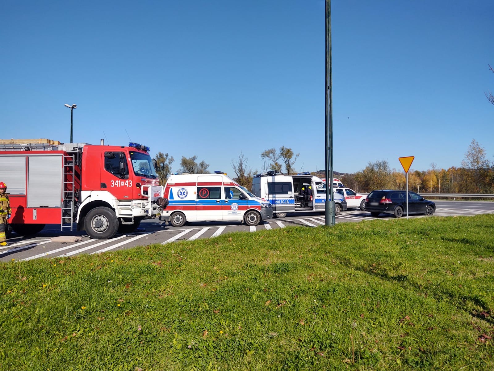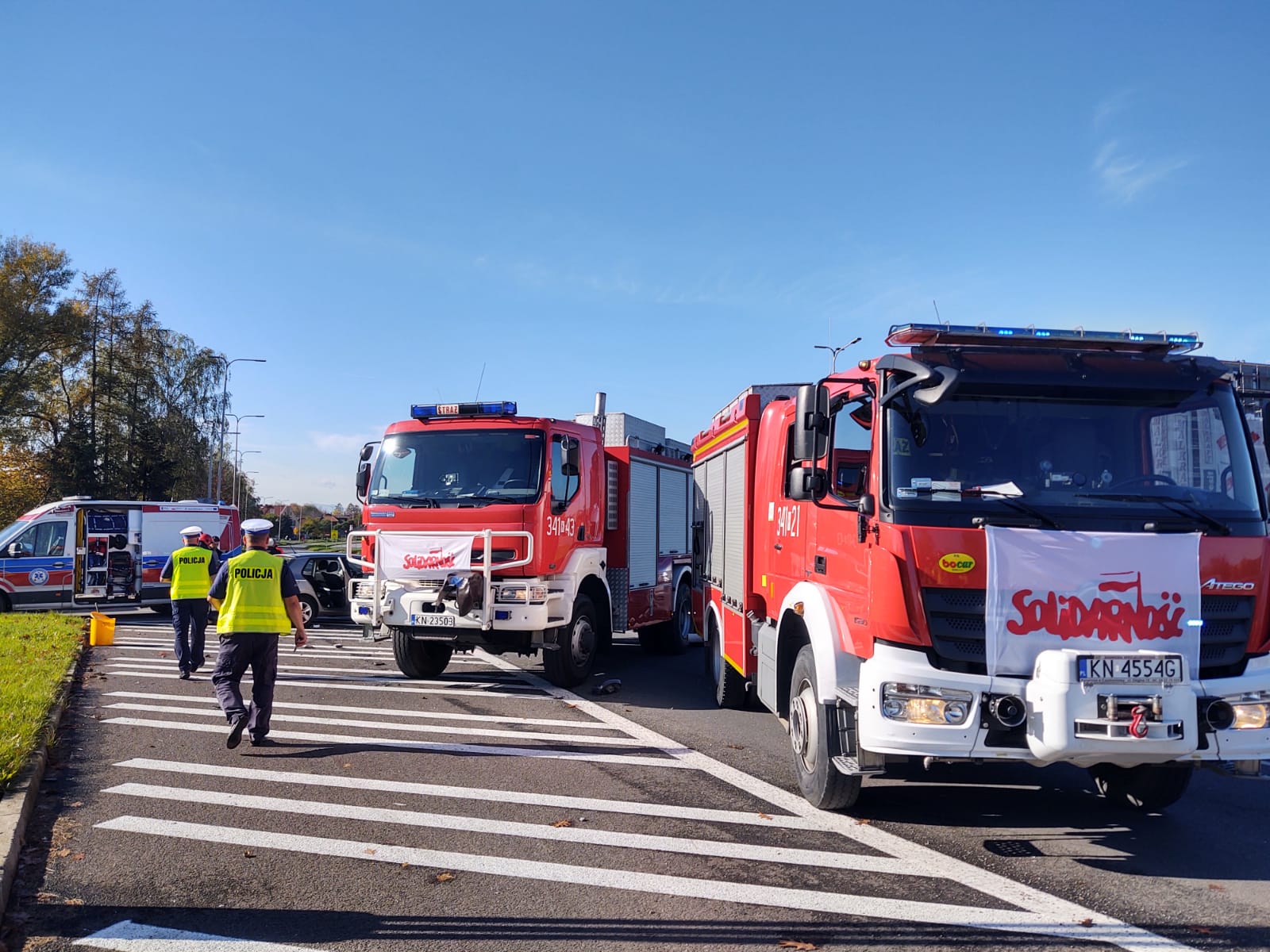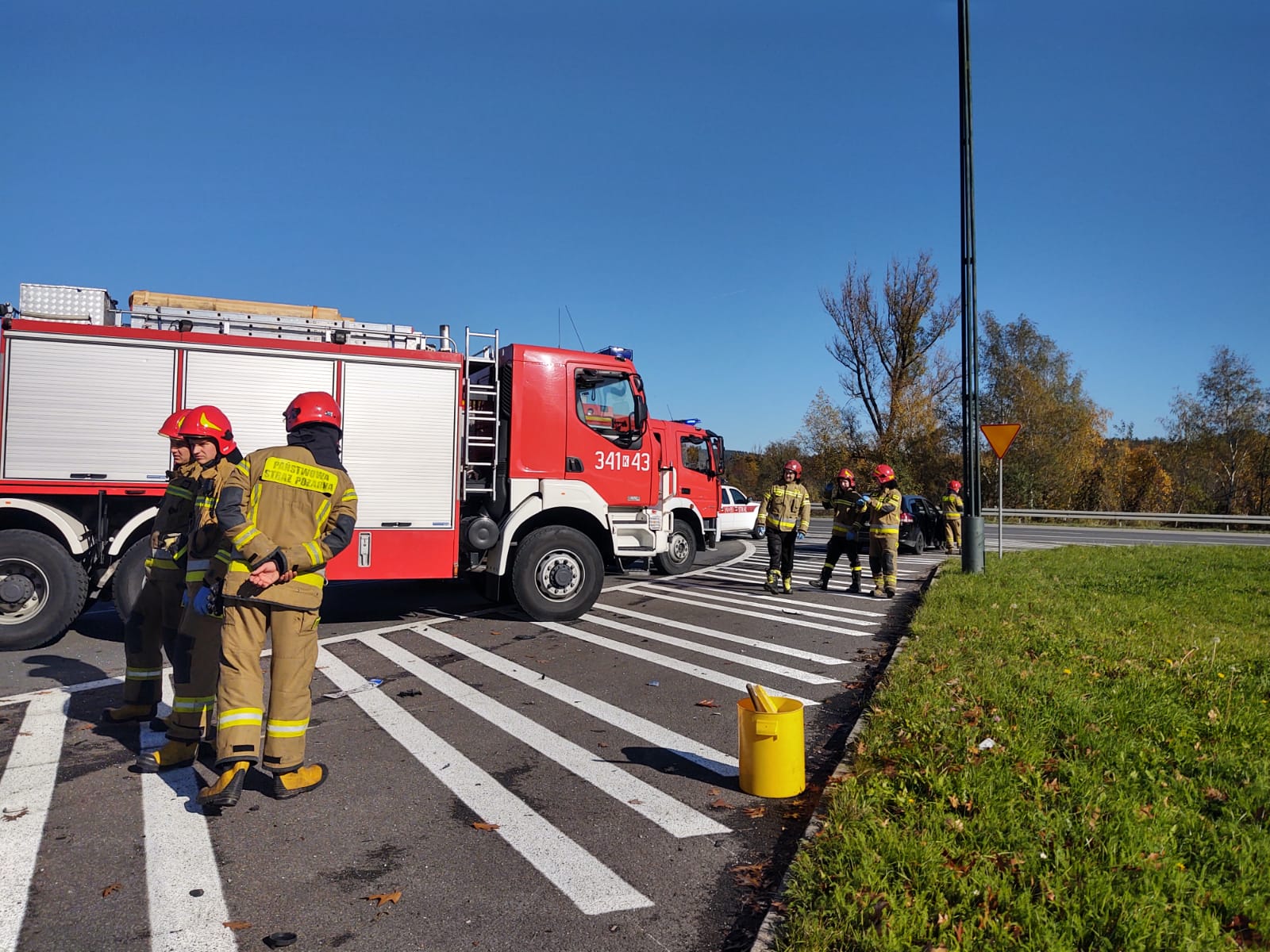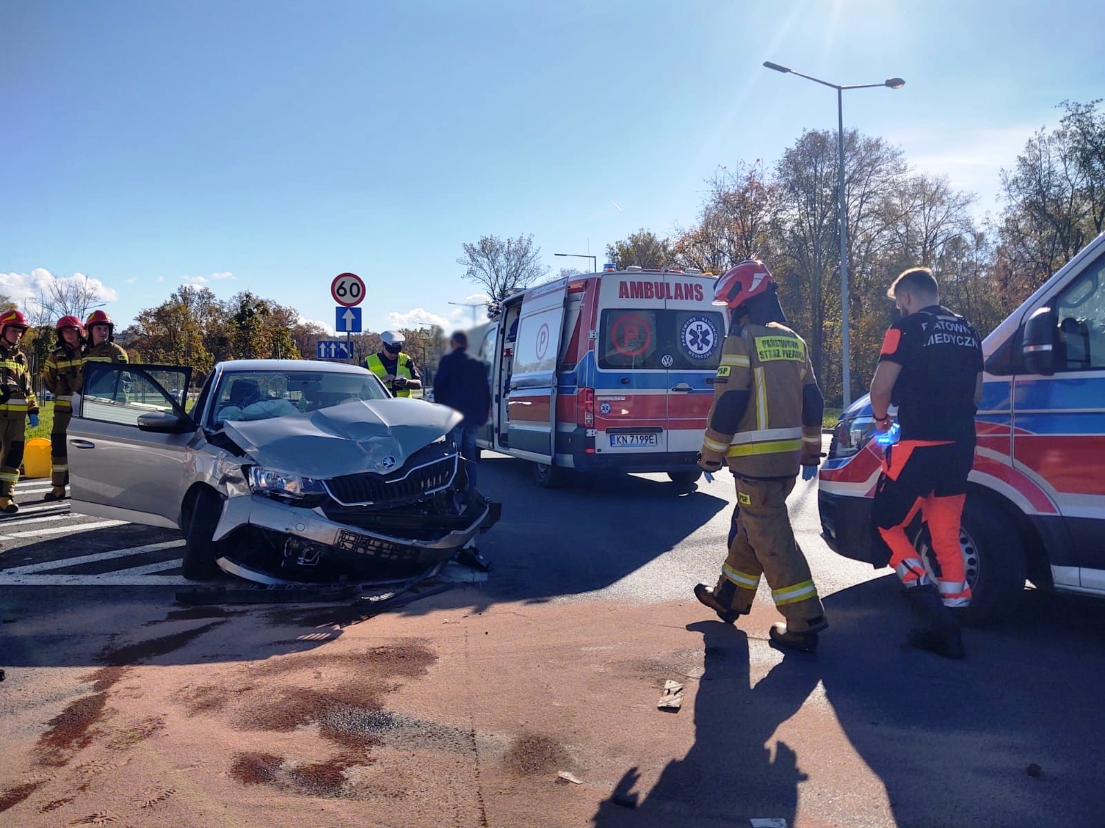 26 października o godzinie 11.36 zastępy z JRG nr 1 w Nowym Sączu zadysponowane zostały do działań w Nowym Sączu na Aleje Piłsudskiego. Po przybyciu na miejsce zdarzenia stwierdzono, że na skrzyżowaniu o ruchu okrężnym zderzyły się dwa samochody osobowe tj. Skoda Fabia i Opel Vectra. Samochodami podróżowało łącznie cztery osoby. W wyniku zdarzenia poszkodowane zostały trzy osoby. Jedna osoba poszkodowana pozostawała w samochodzie, dostęp do niej był swobodny. Z uszkodzonej Skody nastąpił wyciek płynów silnikowych. Obydwa uczestniczące w zdarzeniu pojazdy znajdowały się na wyłączonej z ruchu części jezdni. Przód Skody nieznacznie wystawał na jeden z dwóch pasów ruchu. Działania zastępów straży pożarnej polegały na zabezpieczeniu miejsca zdarzenia, ocenie stanu poszkodowanych i udzieleniu im kwalifikowanej pierwszej pomocy. Osoby poszkodowane zostały przekazane przybyłym załogom karetek Pogotowia Ratunkowego. Dalsze działania zastępu polegały na kontynuowaniu zabezpieczenia miejsca zdarzenia, całkowitym usunięciu uszkodzonej Skody na wyłączoną z ruchu część jezdni, sorpcji rozlanych płynów silnikowych oraz usunięciu z jezdni elementów powypadkowych. Osoby poszkodowane zostały przetransportowane do szpitala w Nowym Sączu.