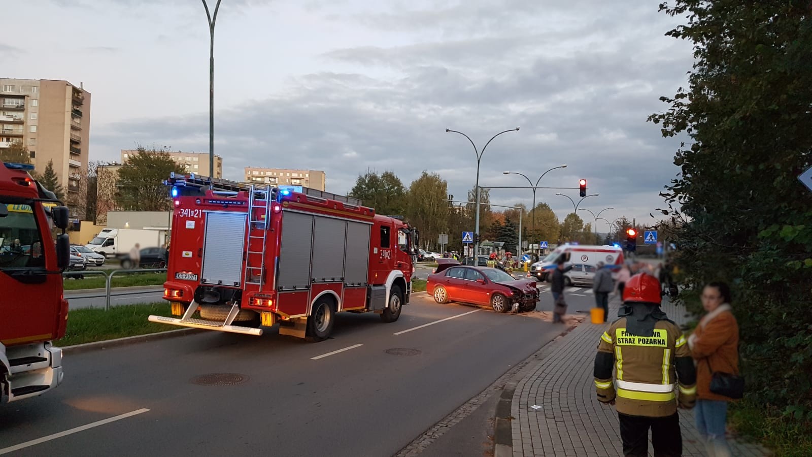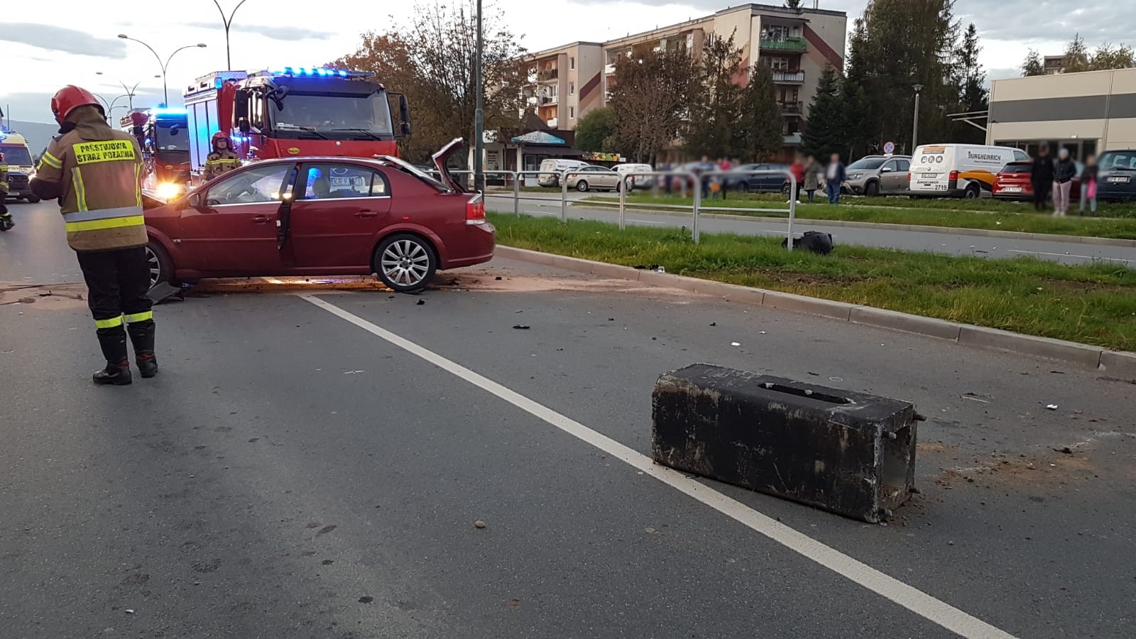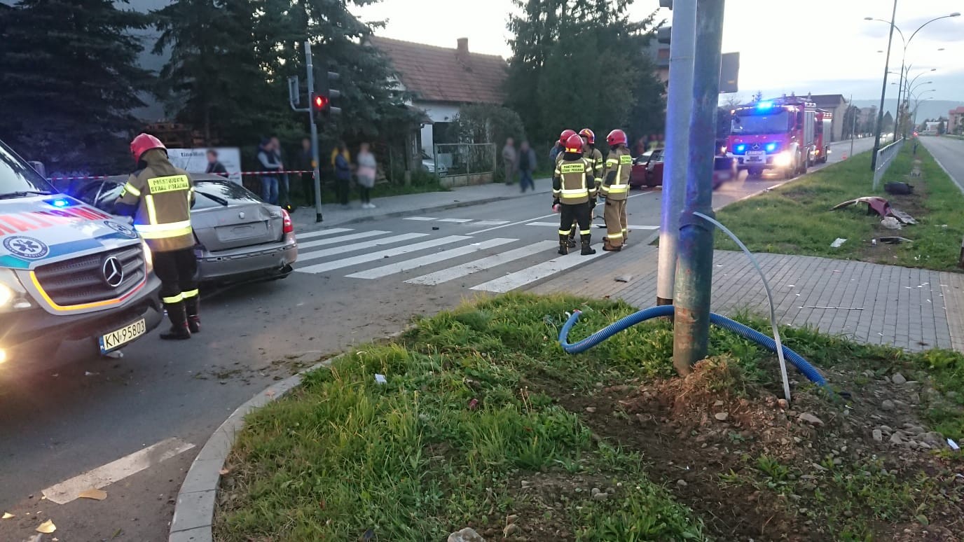 15 października o godzinie 17.30 zastępy z JRG nr 1 w Nowym Sączu zadysponowane zostały do działań w Nowym Sączu na ulicę Sucharskiego. Po przybyciu na miejsce zdarzenia ustalono że na dwupasmowej drodze doszło do zderzenia czołowo-bocznego samochodów osobowych marki Skoda Octavia oraz Opel Vectra. Pojazdem marki Opel podróżowały trzy osoby tj. dwie osoby dorosłe i dziecko, które opuściły pojazd o własnych siłach i nie uskarżali się na żadne dolegliwości. Po zderzeniu Opel przejechał przez pas zieleni na przeciwny kierunek jezdni po drodze uszkodził podstawę nowo stawianej latarni drogowej. Samochód całkowicie blokował ruch drogowy. Z pojazdu nastąpił wyciek płynów eksploatacyjnych. Skodą podróżował sam kierujący, który w wyniku zderzenia wypadł z samochodu i znajdował się nieprzytomny na chodniku. Skoda przejechała na drugą stronę skrzyżowania po drodze uszkadzając latarnię uliczną i blokując całkowicie ruch drogowy. Na miejsce zdarzenia równocześnie z zastępami straży dotarła karetka Pogotowia ratunkowego. Z uwagi na leżące elementy na jezdni, kierunek drogi na którym doszło do zderzenia był nieprzejezdny. Działania zastępów straży pożarnej polegały na zabezpieczeniu miejsca zdarzenia oraz udzieleniu pomocy ratownikom medycznym Pogotowia ratunkowego w przeniesieniu poszkodowanego do karetki. Odłączono akumulatory w uszkodzonych pojazdach. Dokonano sorpcji rozlanych płynów eksploatacyjnych. Na miejsce zdarzenia zadysponowano osobę odpowiedzialną na terenie miasta za oświetlenie uliczne. Zabezpieczono miejsca zdarzenia podczas prowadzonych czynności policji i biegłego sądowego. Uprzątnięto pozostałości po zdarzeniu z jezdni. Zepchnięto pojazdy na pobocze jezdni. Poszkodowany został zabrany do szpitala. W trakcie prowadzonych działań na miejsce zdarzenia dotarła druga karetka, której ratownicy przebadali pasażerów samochodu marki Opel. Po badaniu pozostali oni na miejscu zdarzenia. Działania strażaków trwały godzinę.
