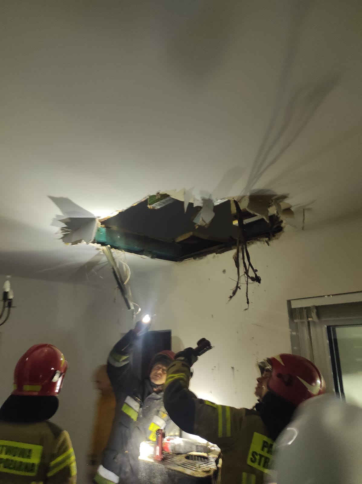 18 grudnia o godzinie 2.44 zastępy z JRG nr 2 w Nowym Sączu oraz OSP Biegonice zadysponowane zostały do działań w Nowym Sączu na ulicę Grunwaldzką. Po przybyciu na miejsce zdarzenia ustalono, że doszło do pożaru ukrytego zlokalizowanego wewnątrz konstrukcji stropodachu w murowanym budynku mieszkalnym. Zamieszkująca rodzina opuściła budynek przed przybyciem zastępów Straży Pożarnej. Działania strażaków polegały na zabezpieczeniu miejsca zdarzenia oraz odłączeniu instalacji elektrycznej w budynku. Wygaszono kominek. Po zlokalizowaniu miejsca pożaru wykonano dostęp do wnętrza stropodachu przy użyciu pilarki spalinowej oraz elektrycznej piły szablastej. Pulsacyjnie podawano wodę w miejsce pożaru. Wycięto nadpalone żarzące się elementy konstrukcji a następnie wyniesiono je na zewnątrz oraz dokładne przelano prądem wody. Z uwagi na panujące duże zadymienie na poddaszu budynku strażacy pracowali w aparatach ochrony układu oddechowego. Przy użyciu kamery termowizyjnej skontrolowano strop i poddasze budynku a pomieszczenia budynku sprawdzono czujnikami na obecność gazów niebezpiecznych. Działania strażaków trwały półtorej godziny. Prawdopodobną przyczyną pożaru była wada urządzenia grzewczego na paliwo stałe.