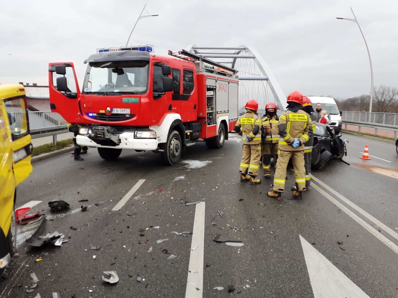 23 listopada około godziny 14.05 zastępy z JRG nr 1 w Nowym Sączu zadysponowane zostały do działań w Nowym Sączu na ulicy Legionów. Po przybyciu na miejsce zdarzenia stwierdzono, że w zdarzeniu udział brały dwa samochody tj. Toyota i Fiat Doblo. Kolizja samochodów miała miejsce na moście o czterech pasach ruchu. W każdym z pojazdów podróżowali sami kierujący. Uczestnicy zdarzenia opuścili swoje pojazd o własnych siłach przed przybyciem zastępów straży pożarnej. Jedna osoba uskarżała się na dolegliwości. W wyniku zdarzenia zablokowane było trzy pasy jezdni. Z obydwu pojazdów nastąpił wyciek płynów eksploatacyjnych. Działania zastępów straży pożarnej polegały na zabezpieczeniu miejsca zdarzenia, rozłączeniu instalacji elektrycznej w obydwu samochodach oraz sorpcji rozlanych płynów eksploatacyjnych wyciekłych z uszkodzonych pojazdów. Przemieszczono za pomocą wciągarki samochodowej uszkodzoną Toyote na jeden pas jezdni. Udzielono pomocy przybyłym na miejsce pracownikom Pomocy Drogowej w umieszczeniu uszkodzonych pojazdów na lawecie. Usunięto z jezdni elementy powypadkowe. Kierujący Fiatem Doblo po przebadaniu na miejscu zdarzenia został przewieziony do szpitala. Działania strażaków trwały półtorej godziny.