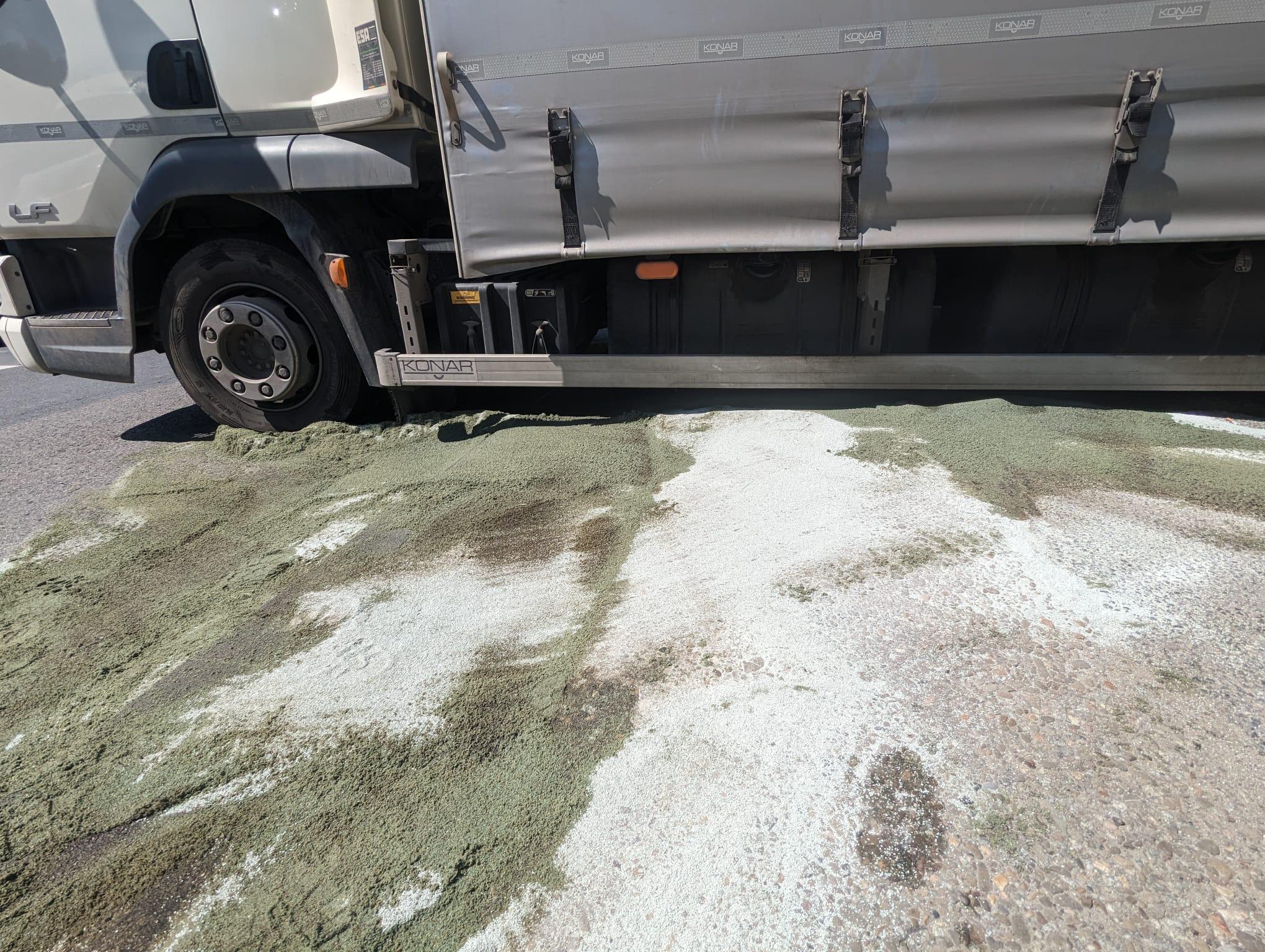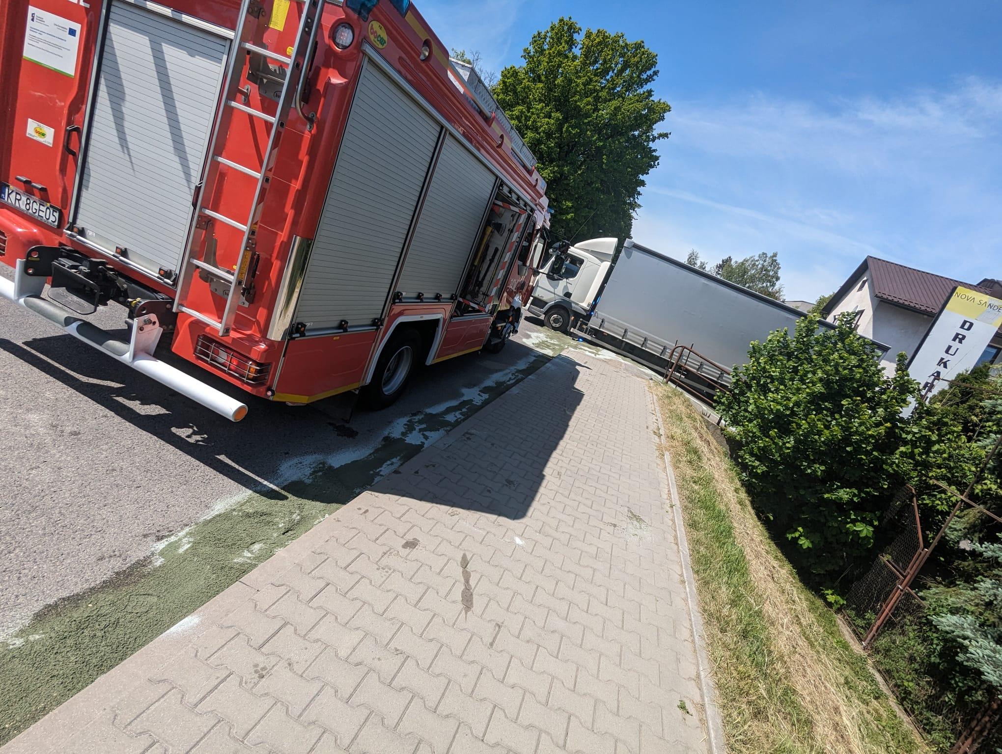 Nowy Sącz, ul. Lwowska-wyciek paliwa z uszkodzonego zbiornika samochodu ciężarowego
