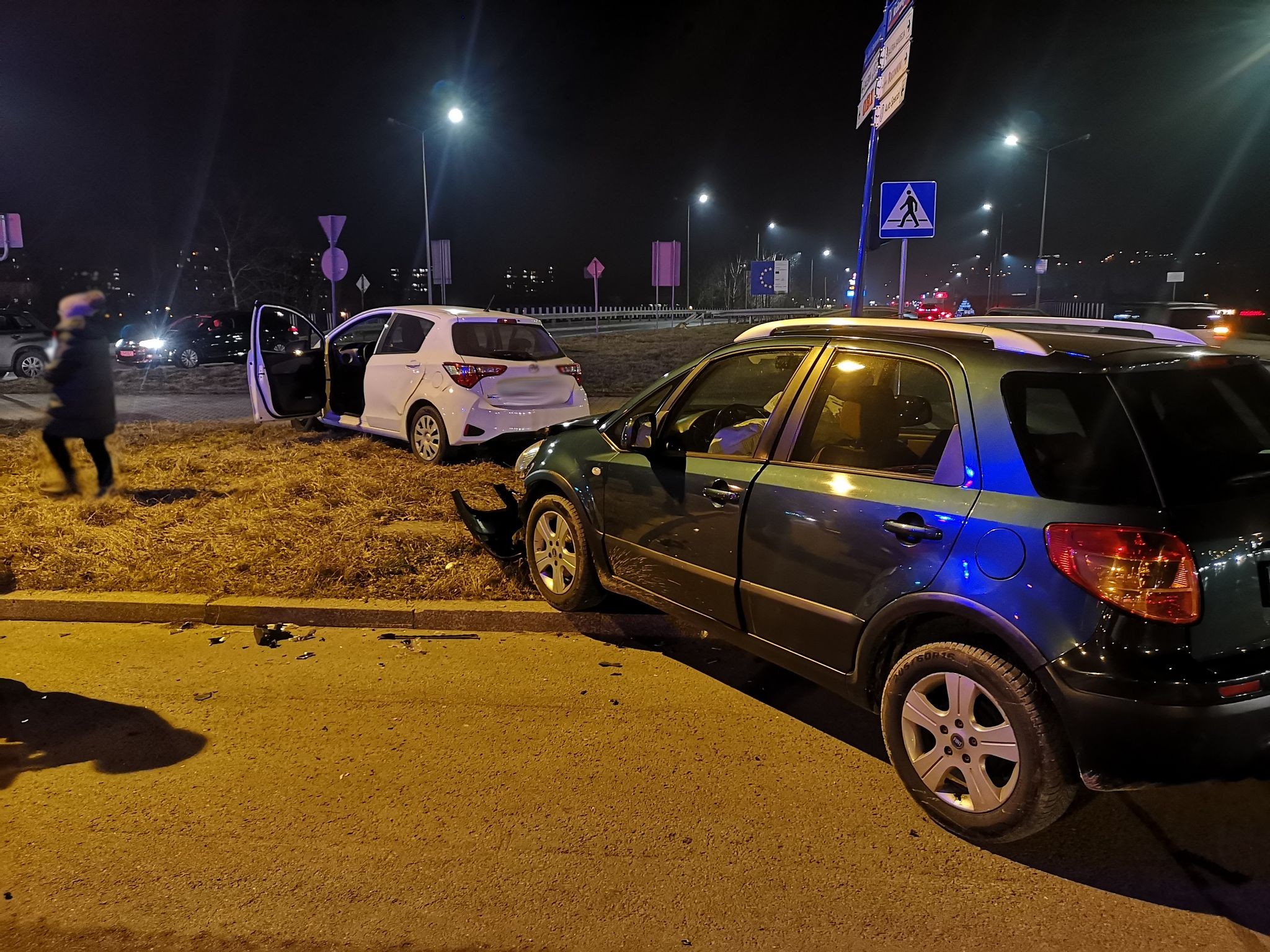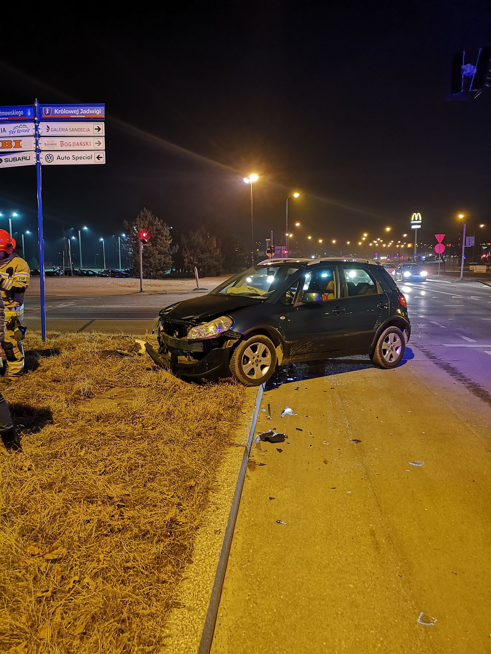 14 marca o godzinie 19.11 zastęp z JRG nr 1 w Nowym Sączu zadysponowane zostały do działań w Nowym Sączu na ulicę Prażmowskiego. Po przybyciu na miejsce zdarzenia stwierdzono, że na Rondzie Solidarności doszło do zderzenia dwóch samochodów osobowych tj. Toyota oraz Fiat. Uszkodzone pojazdy znajdowały się na pasie zieleni oraz na jednym pasie jezdni. W trakcie rozpoznania na miejsce zdarzenia dojechała karetka Pogotowia ratunkowego. Samochodami podróżowało cztery osoby. Osoba kierująca samochodem Toyota, została poszkodowana a pomocy udzielili jej ratownicy medyczni Pogotowia ratunkowego. Powstały niewielkie wycieki płynów eksploatacyjnych. Działania strażaków polegały na zabezpieczeniu miejsca zdarzenia oraz rozłączeniu instalacji elektrycznej w obydwu pojazdach. Dokonano sorpcji rozlanych płynów silnikowych i eksploatacyjnych. Przemieszczono uszkodzone pojazdy na pobocze a z jezdni elementy powypadkowe. Do szpitala zabrana została jedna osoba. Działania strażaków trwały ponad godzinę.