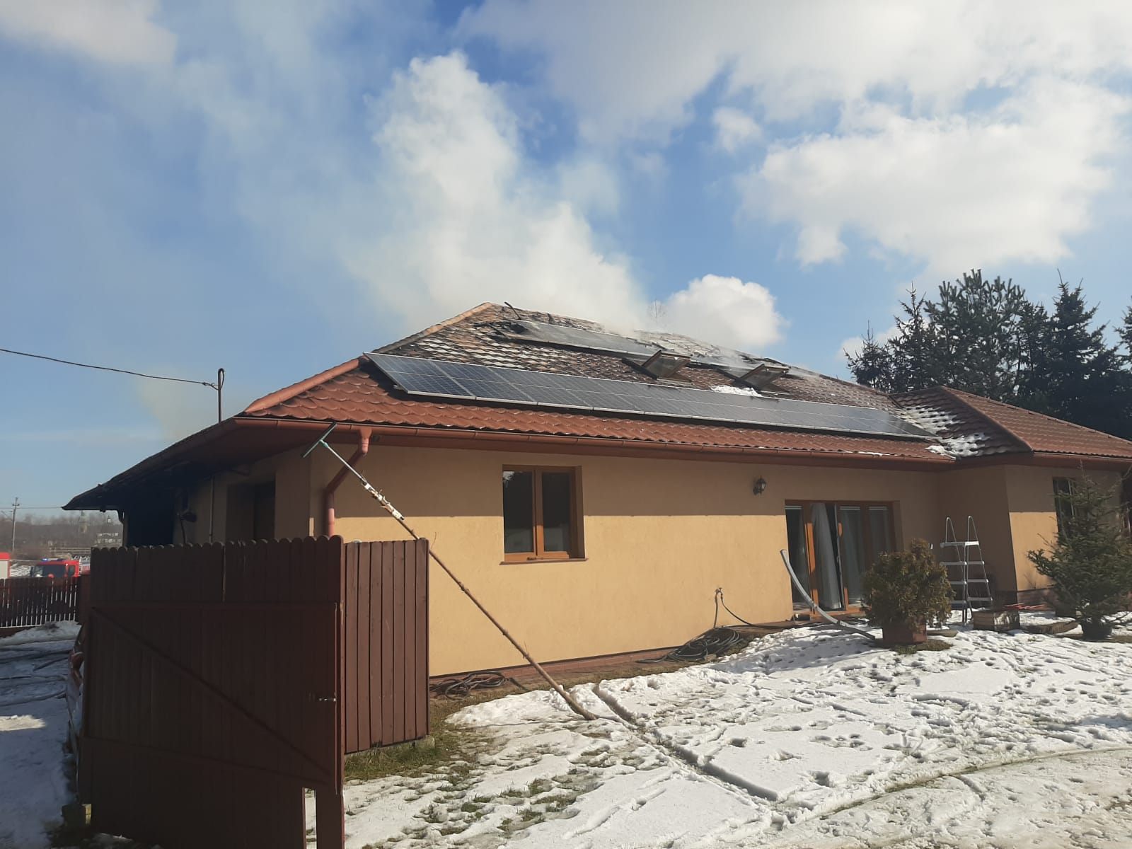 20 lutego około godziny 12.06 zastępy z JRG nr 1 w Nowym Sączu oraz OSP Mystków zadysponowane zostały do działań na ulicę Starowiejską. Po przybyciu na miejsce zdarzenia ustalono, że pożarem objęty był garaż znajdując się w budynku mieszkalnym. Mieszkańcy opuścili dom przed przyjazdem zastępów straży. Zasilanie w energię elektryczną odłączone przed przybyciem strażaków przez właściciela. Na dachu budynku znajdowała się instalacja fotowoltaiczna. Falownik i centrala do obsługi paneli znajdowały się w pomieszczeniu garażu objętym pożarem. Działania strażaków polegały na zabezpieczeniu miejsca zdarzenia. Ustalono, że jedna osoba została poszkodowana. Na miejsce zadysponowano karetkę Pogotowia ratunkowego, której załoga udzieliła pomocy osobie poszkodowanej oraz zabrała ją do szpitala. Podano dwa prądy piany ciężkiej do wnętrza garażu. Wprowadzono trzeci prąd wody na poddasze w części użytkowej. Przystawiono drabiny do dachu obiektu w celu wykonania otworów rewizyjnych w pokryciu dachu celem dotarcia do źródła ognia w pomieszczeniu strychu. Odłączono wtyczki od sekcji paneli, które nie zostały uszkodzone. Po zlokalizowaniu pożaru wykonano niezbędne prace rozbiórkowe części konstrukcji dachu, zdemontowano płyty na stropie, całość przelano wodą i sprawdzono kamerą termowizyjną. Sprawdzono pomieszczenia domu na obecność stężeń gazów niebezpiecznych nie stwierdzając zagrożenia. Panele fotowoltaiczne przysłonięto plandekami. Część dachu, która została uszkodzona została przykryta plandekami. Działania strażaków trwały ponad trzy i pół godziny. Przyczyna pożaru jest nieustalona.