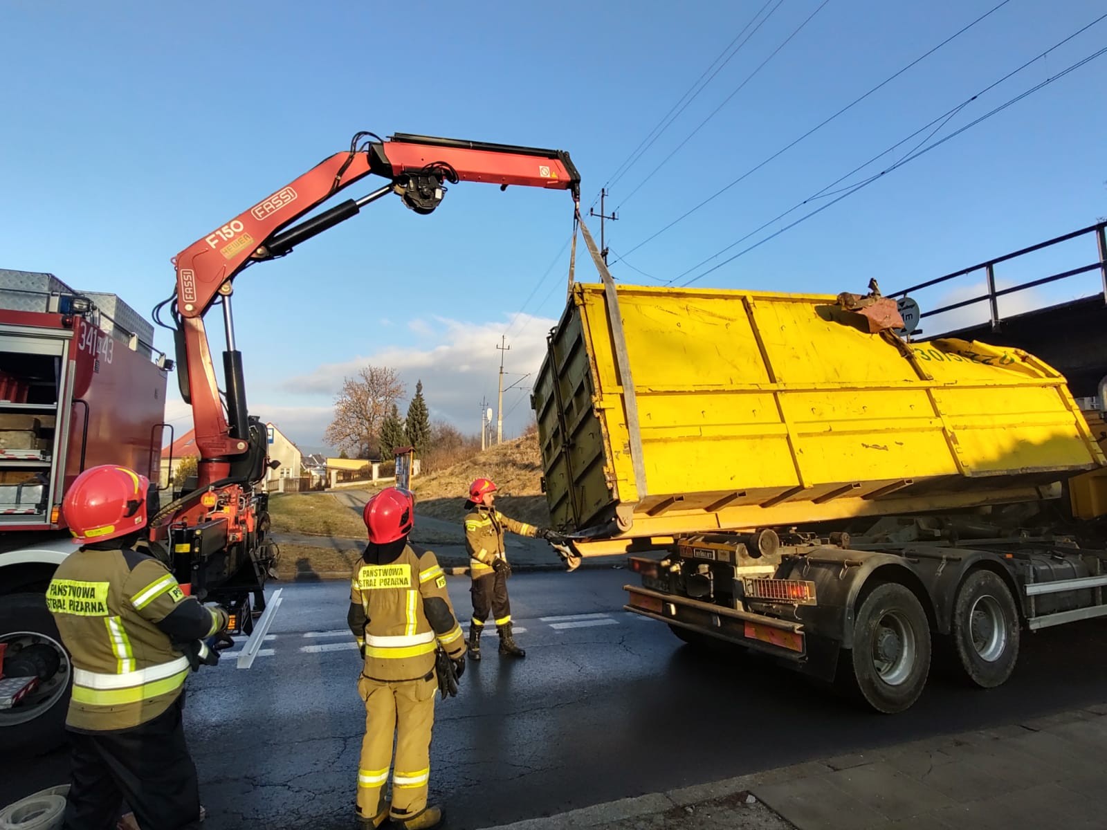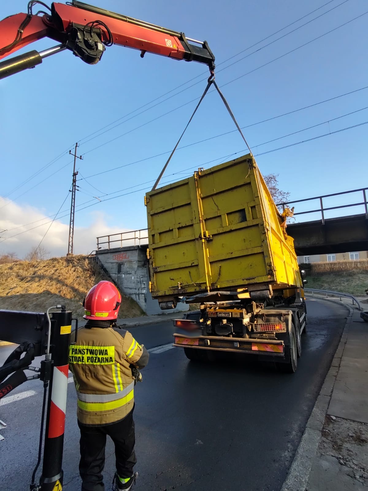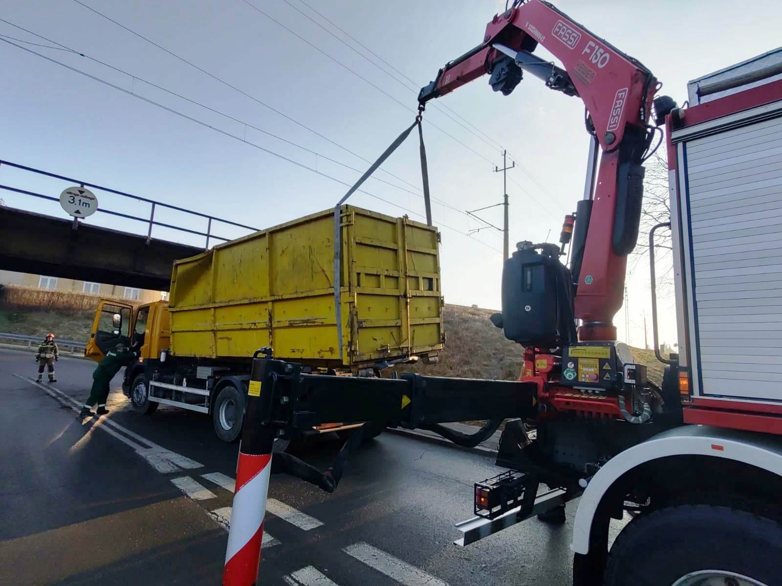 14 stycznia o godzinie 8.40 zastępy z JRG nr 1 w Nowym Sączu zadysponowane zostały do działań w Nowym Sączu na ulicę Kunegundy. Po przybyciu na miejsce zdarzenia ustalono, że samochód ciężarowy uderzył kontenerem o wiadukt. Pojazdem podróżował sam kierowca, który nie uskarżał się na żadne dolegliwości i opuścił pojazd o własnych siłach. Kontener w wyniku uderzenia uszkodził podzespoły odpowiedzialne za utrzymanie ładunku przez co się przemieścił i znajdował się w pozycji pochylonej częściowo poza samochodem. Jeden pas ruchu był zablokowany. Na drodze znajdowały się elementy samochodu. Działania strażaków polegały na zabezpieczeniu miejsca zdarzenia, wstrzymaniu ruchu pojazdów w obu kierunkach oraz zabezpieczeniu kontenera przy użyciu ciężkiego samochodu ratownictwa technicznego. Następnie uniesiono kontener i ustawiono go na szyny pojazdu. Po zakończonych czynnościach dochodzeniowych Policji, pojazd zjechał na pobliskie pobocze. Dalsze działania Straży polegały na usunięciu pozostałości samochodu z drogi na pobocze. Działania strażaków trwały czterdzieści minut.