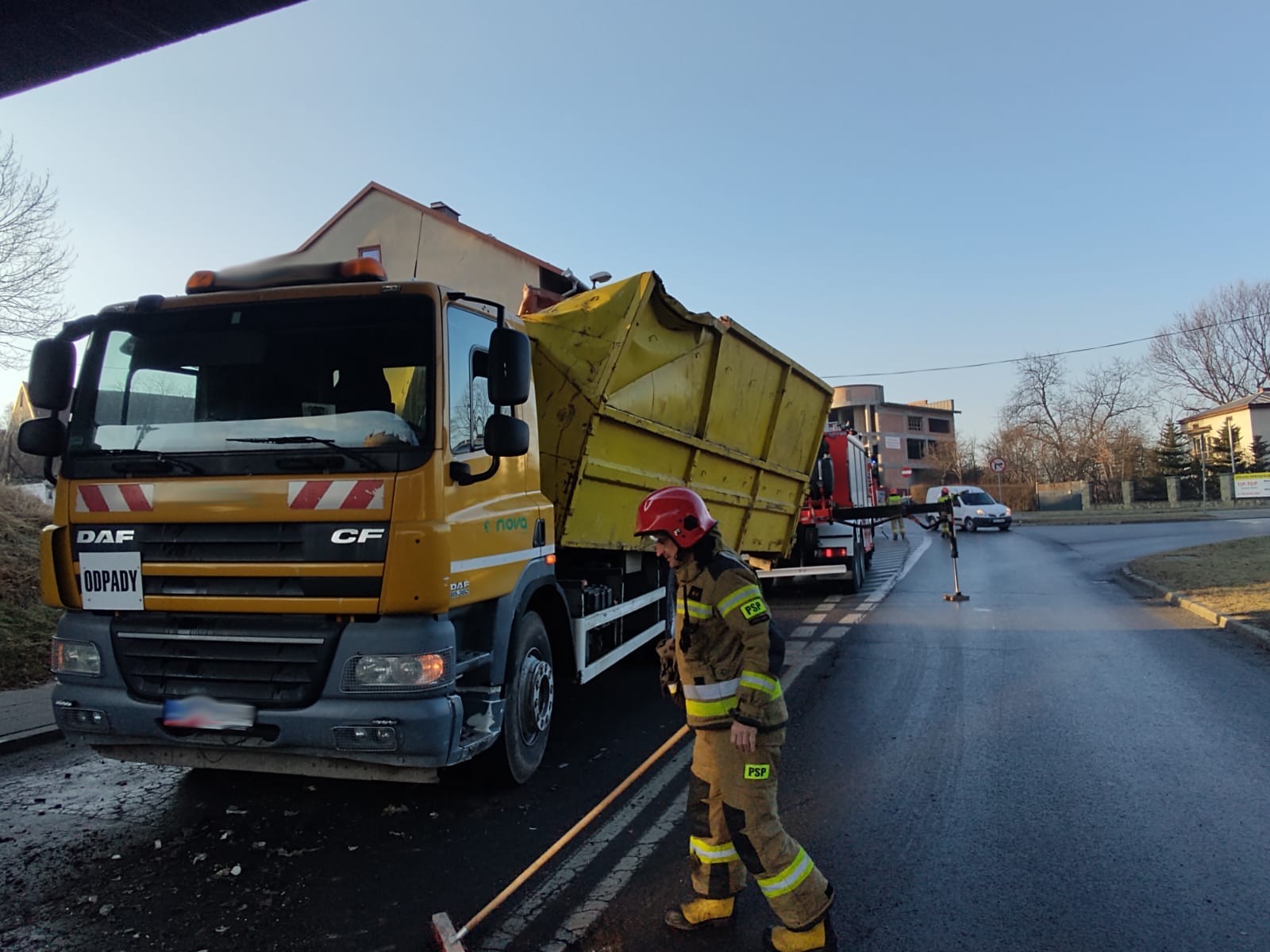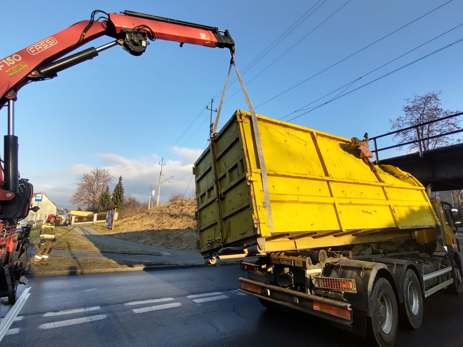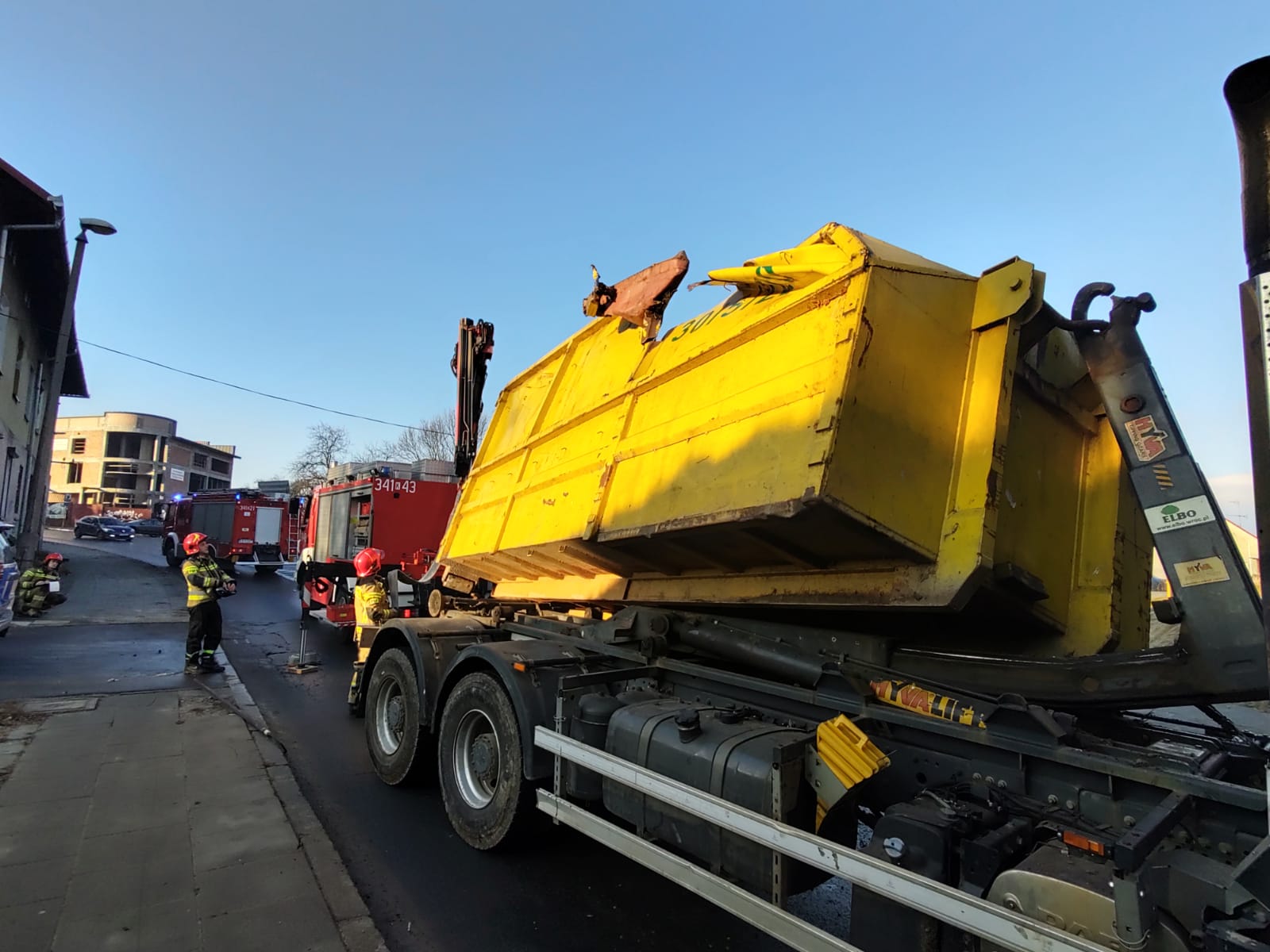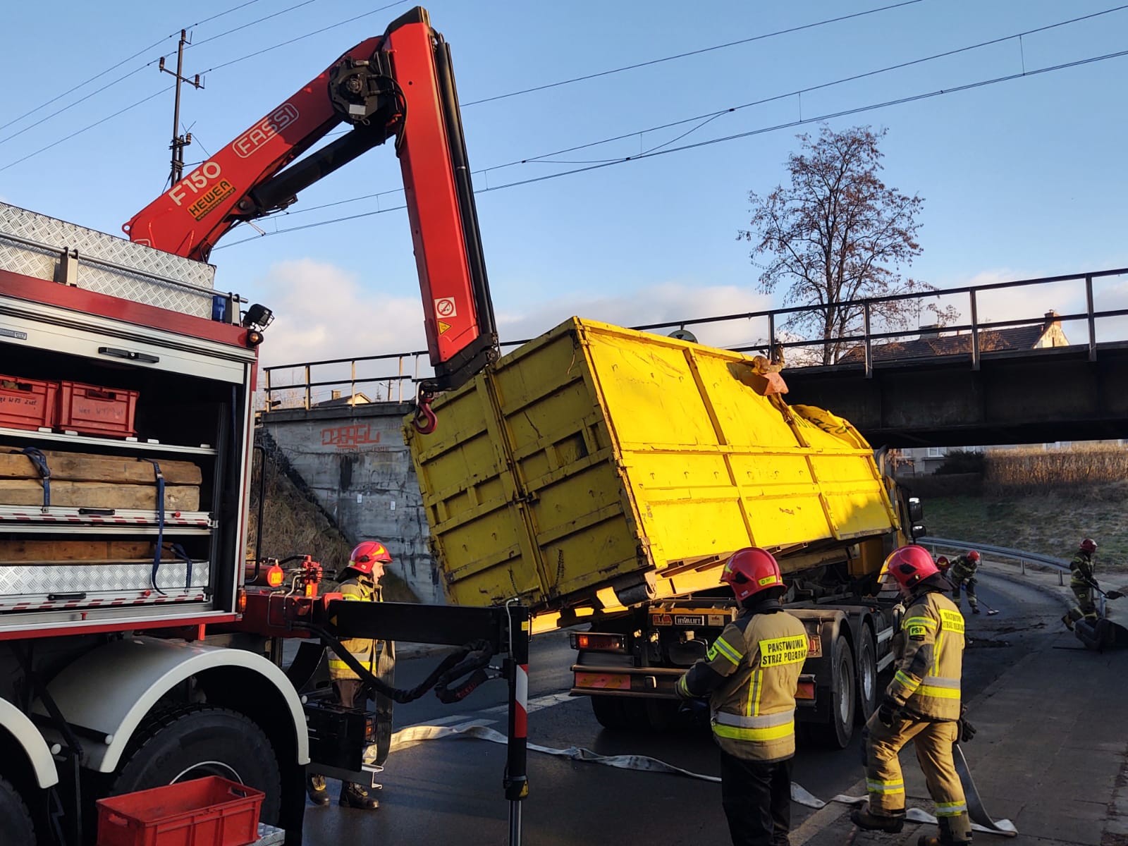 14 stycznia o godzinie 8.40 zastępy z JRG nr 1 w Nowym Sączu zadysponowane zostały do działań w Nowym Sączu na ulicę Kunegundy. Po przybyciu na miejsce zdarzenia ustalono, że samochód ciężarowy uderzył kontenerem o wiadukt. Pojazdem podróżował sam kierowca, który nie uskarżał się na żadne dolegliwości i opuścił pojazd o własnych siłach. Kontener w wyniku uderzenia uszkodził podzespoły odpowiedzialne za utrzymanie ładunku przez co się przemieścił i znajdował się w pozycji pochylonej częściowo poza samochodem. Jeden pas ruchu był zablokowany. Na drodze znajdowały się elementy samochodu. Działania strażaków polegały na zabezpieczeniu miejsca zdarzenia, wstrzymaniu ruchu pojazdów w obu kierunkach oraz zabezpieczeniu kontenera przy użyciu ciężkiego samochodu ratownictwa technicznego. Następnie uniesiono kontener i ustawiono go na szyny pojazdu. Po zakończonych czynnościach dochodzeniowych Policji, pojazd zjechał na pobliskie pobocze. Dalsze działania Straży polegały na usunięciu pozostałości samochodu z drogi na pobocze. Działania strażaków trwały czterdzieści minut.