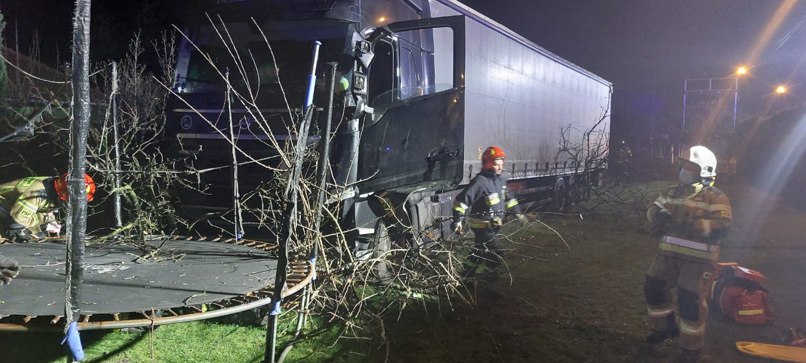 30 grudnia o godzinie 19.26 zastępy z JRG nr 2 w Nowym Sączu oraz OSP Biegonice zadysponowane zostały do działań w Nowym Sączu na ulicę Węgierską. Po przybyciu na miejsce zdarzenia ustalono, że samochód ciężarowy Volvo na zakręcie zjechał z drogi, uszkodził latarnię uliczną, przejechał przez ogrodzenie z siatki, wjechał do ogrodu posesji łamiąc trzy drzewa owocowe i zatrzymał się na trawniku w odległości około 8 m od budynku mieszkalnego. W chwili przybycia zastępów straży pożarnej kierowca samochodu ciężarowego znajdował się wewnątrz pojazdu. Działania zastępów straży pożarnej polegały na zabezpieczeniu miejsca zdarzenia oraz udzieleniu kwalifikowanej pierwszej pomocy kierowcy. Przybyła załoga karetka Pogotowia ratunkowego przejęła poszkodowanego. Kierowca został ewakuowany z samochodu ciężarowego do karetki i zabrany do szpitala. Równocześnie wyłączono wyłączniki prądu w samochodzie ciężarowym. Miejsce prowadzonych działań oświetlono za pomocą najaśnic. Sprawdzono kabinę samochodu ciężarowego oraz wnętrze naczepy i nie stwierdzono innych osób poszkodowanych.Działania strażaków trwały godzinę.