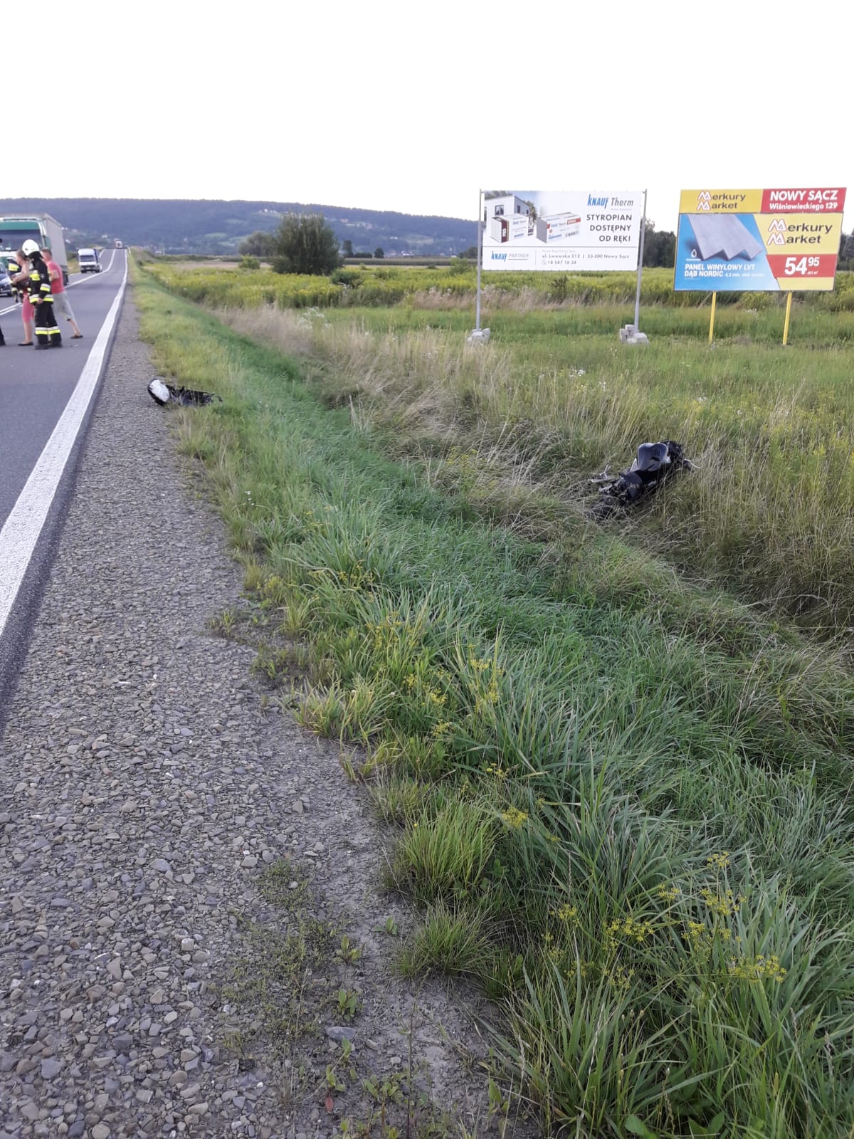 10 sierpnia o godzinie 18.46 zastępy z JRG nr 2 w Nowym Sączu, OSP Podrzecze oraz OSP Niskowa zadysponowane zostały do działań w Podrzeczu. Po przybyciu na miejsce zdarzenia ustalono, że doszło do wypadku, w którym uczestniczył motocykl. Pojazdem podróżowały dwie osoby, które wymagały pomocy medycznej. Pojazd znajdował się na poboczu, osoby poszkodowane na skraju jezdni po przeciwnej stronie. Działania zastępów straży polegały na zabezpieczeniu miejsca zdarzenia, zamknięciu ruchu w obu kierunkach na czas prowadzonych działań oraz udzieleniu pomocy osobom poszkodowanym. Sprawdzono pojazd pod kątem wycieku paliwa, którego nie stwierdzono. Odłączono klemy od akumulatora w motocyklu. Osoby poszkodowane zostały przekazane przybyłym załogom karetek Pogotowia Ratunkowego. Po przekazaniu osób poszkodowanych wdrożono ruch wahadłowy dla innych pojazdów. Karetki Pogotowia Ratunkowego przetransportowały osoby poszkodowane do szpitala. Po zakończonych czynnościach dochodzeniowych przez Policję i usunięciu elementów motocykla z jezdni udrożniono ruch na drodze. Działania zastępów straży trwały godzinę.