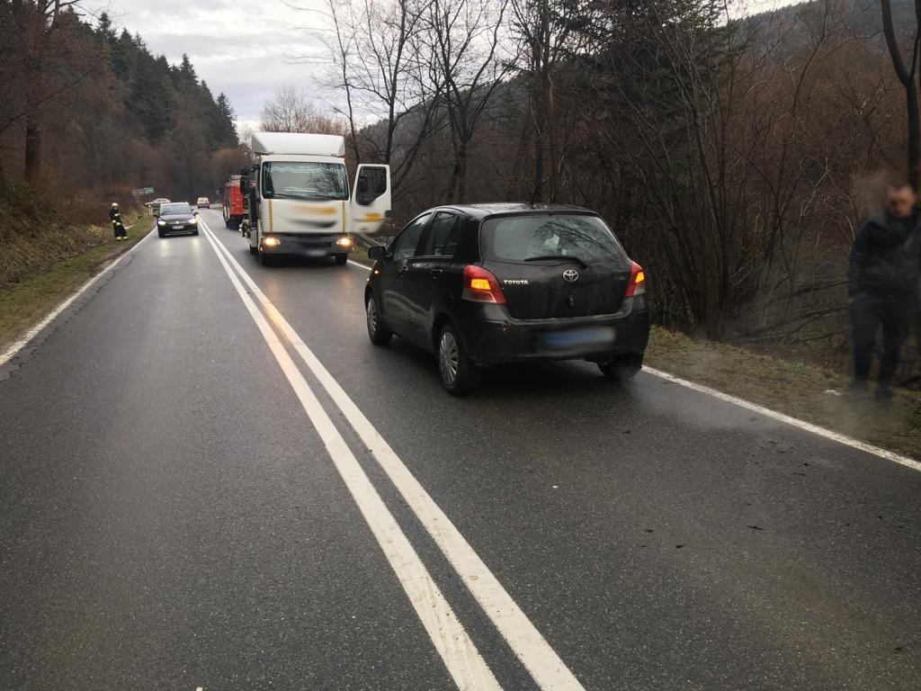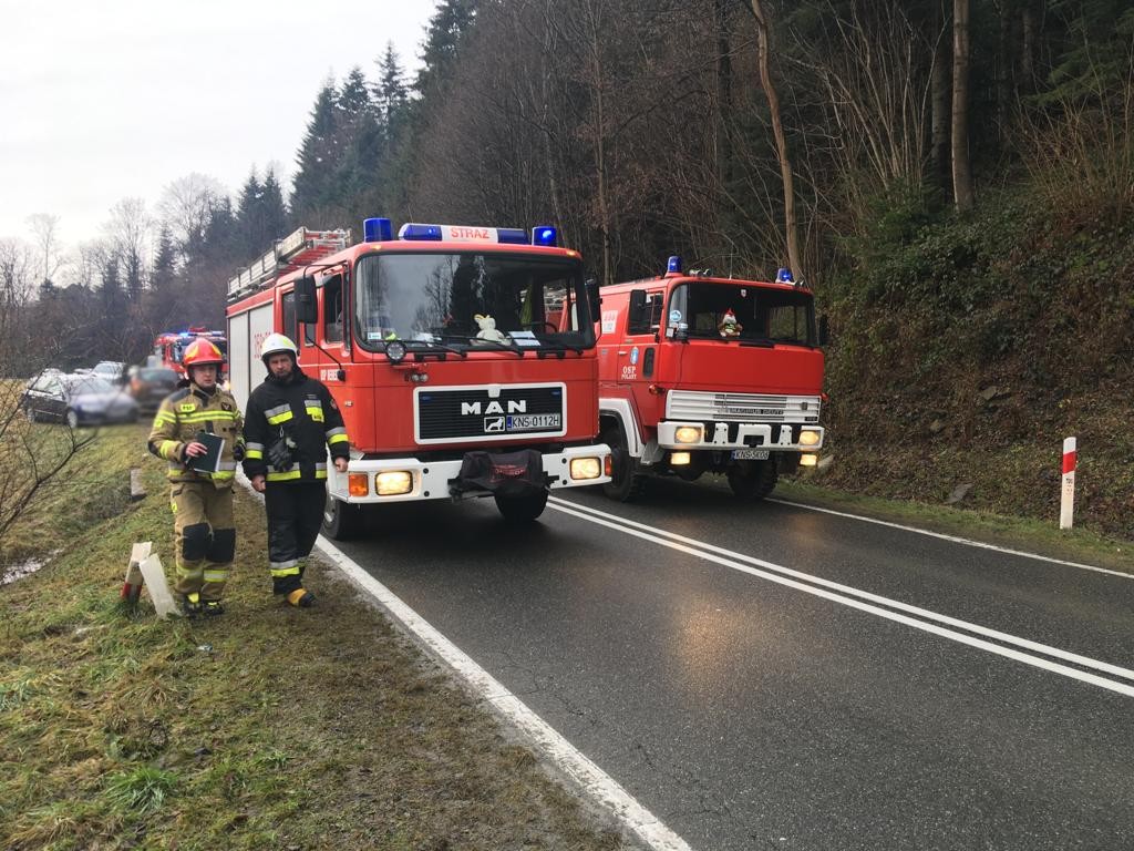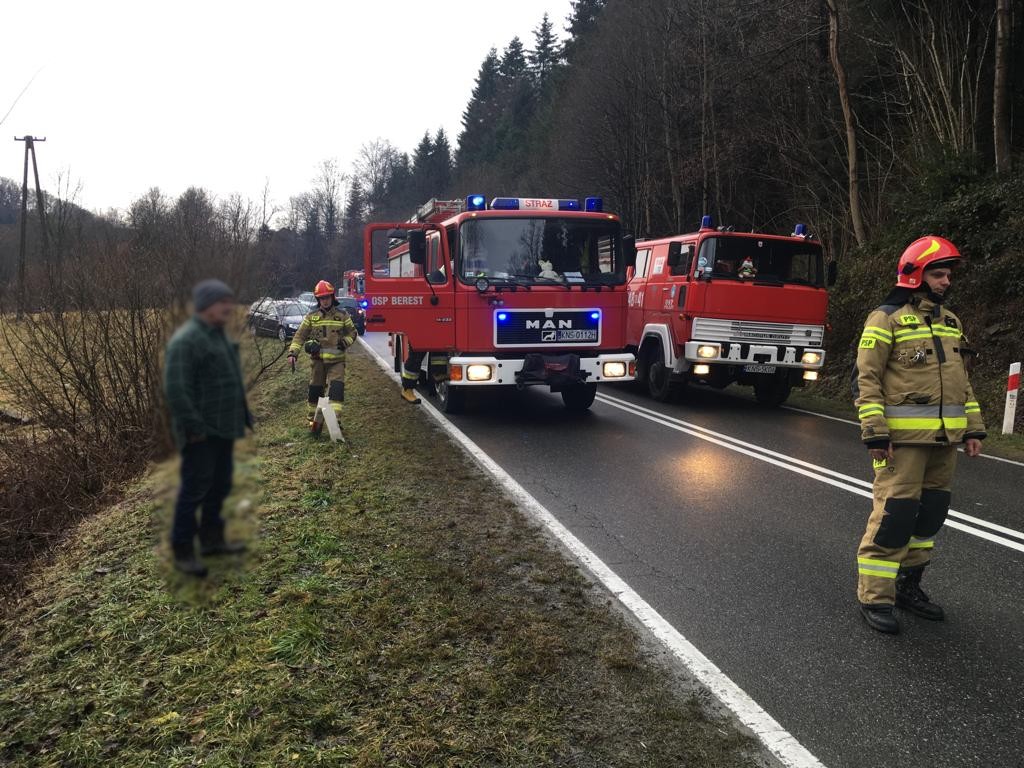 4 stycznia o godzinie 8.35 zastępy z JRG w Krynicy Zdroju, OSP Polany oraz OSP Berest zadysponowane zostały do działań w Polanach. Po przybyciu na miejsce zdarzenia ustalono, że z drogi wojewódzkiej nr 981 wypadł samochód osobowy marki Toyota Yaris. Samochodem podróżowała jedna osoba, która nie uskarżał się na żadne dolegliwości. Na jezdni znajdowały się plamy płynów eksploatacyjnych. Działania strażaków polegały na zabezpieczeniu miejsca zdarzenia oraz wahadłowym kierowaniu ruchem drogowym. Zneutralizowano plamy płynów eksploatacyjnych za pomocą dyspergentu. Strażacy współdziałali z pomocą drogową wezwaną na miejsce zdarzenia przez osobę kierującą pojazdem. Pomoc drogowa wyciągneła pojazd na drogę. Uszkodzenia pojazdu pozwalały na dalsze kontynuowanie jazdy. Na miejscu zdarzenia pozostała Policja wraz z właścicielem samochodu. Działania strażaków trwały około czterdziestu minut.