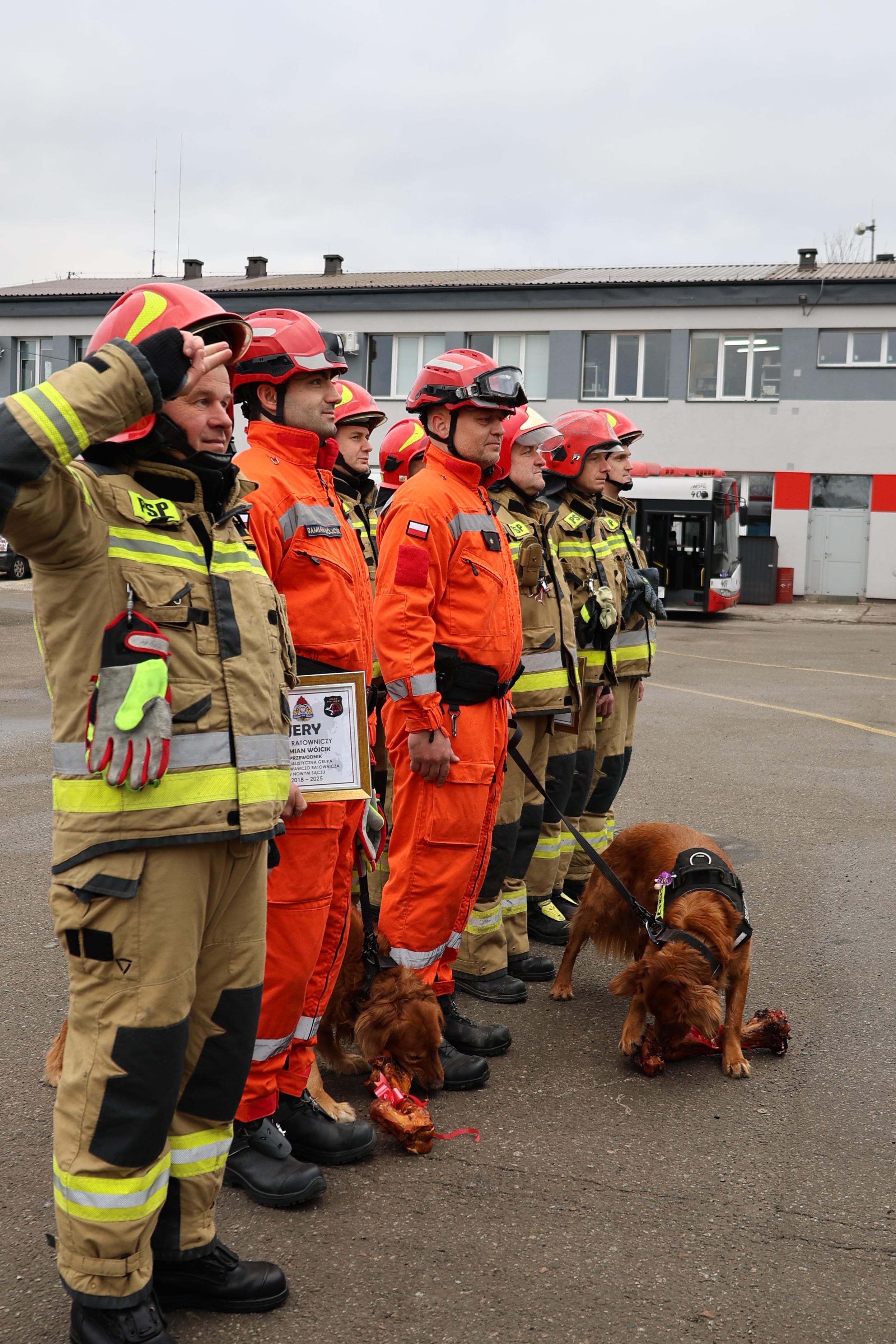 W dniu 3 marca 2025 r. w tymczasowej siedzibie JRG-2, w obecności Komendanta Miejskiego PSP w Nowym Sączu odbyła się zmiana służby, na której pożegnano psy ratownicze Jaggera oraz Jerrego, które zakończyły służbę w PSP.