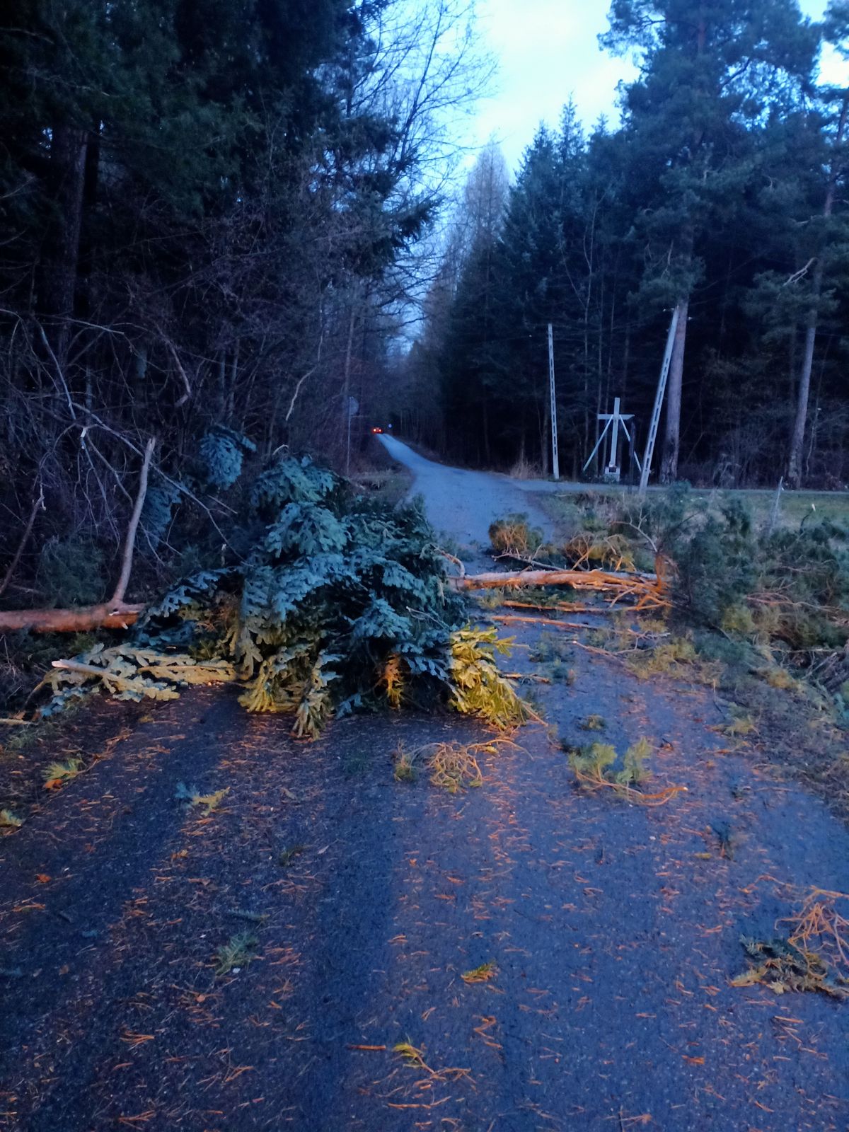 Łososina Dolna – złamany słup energetyczny blokuje drogę,