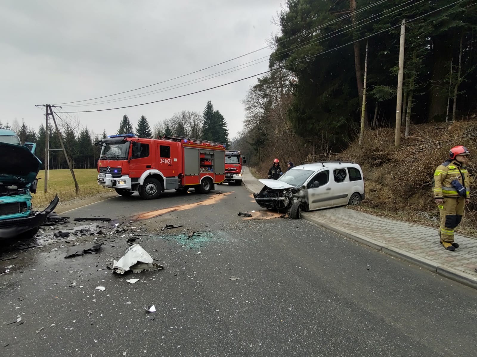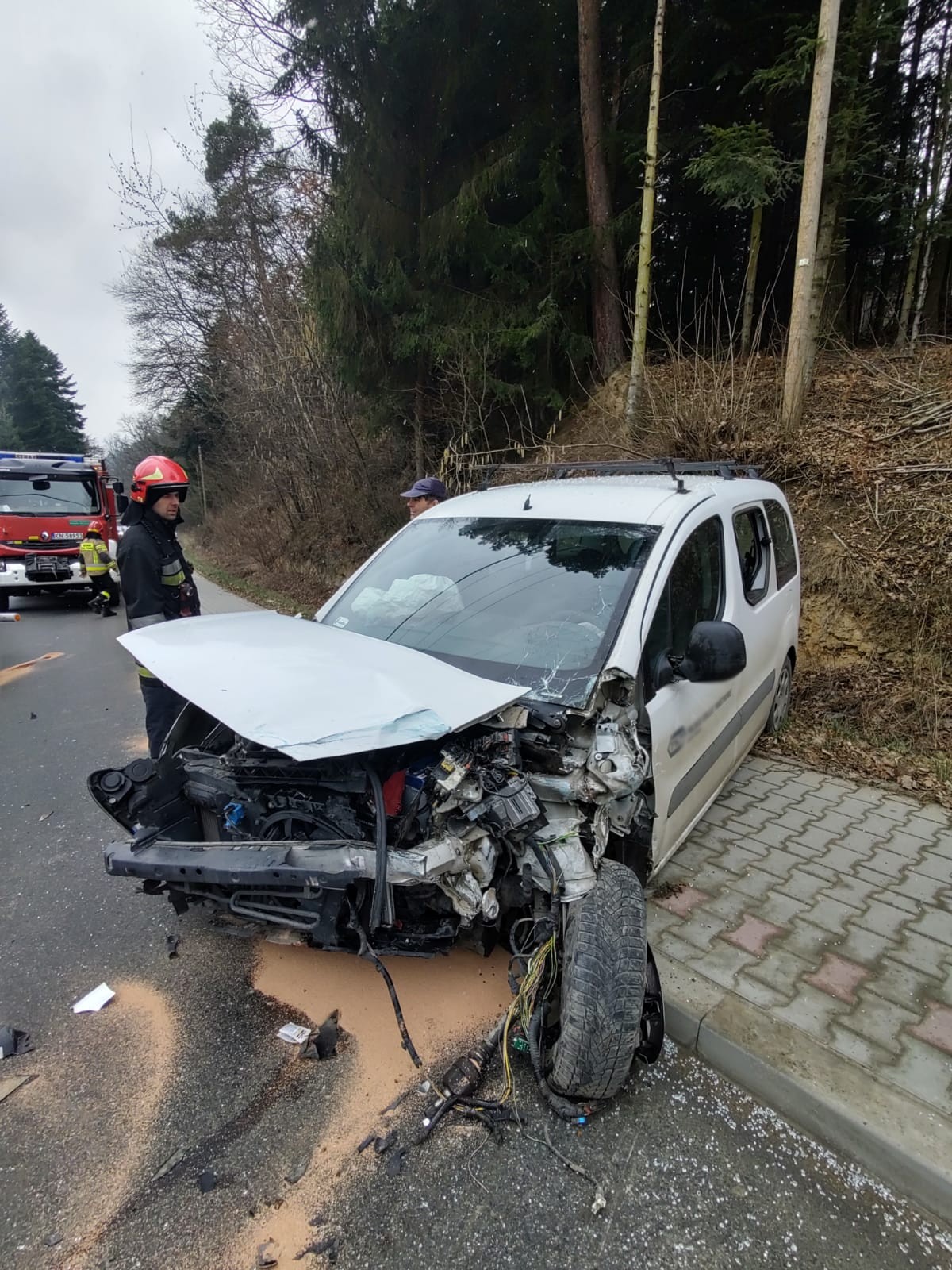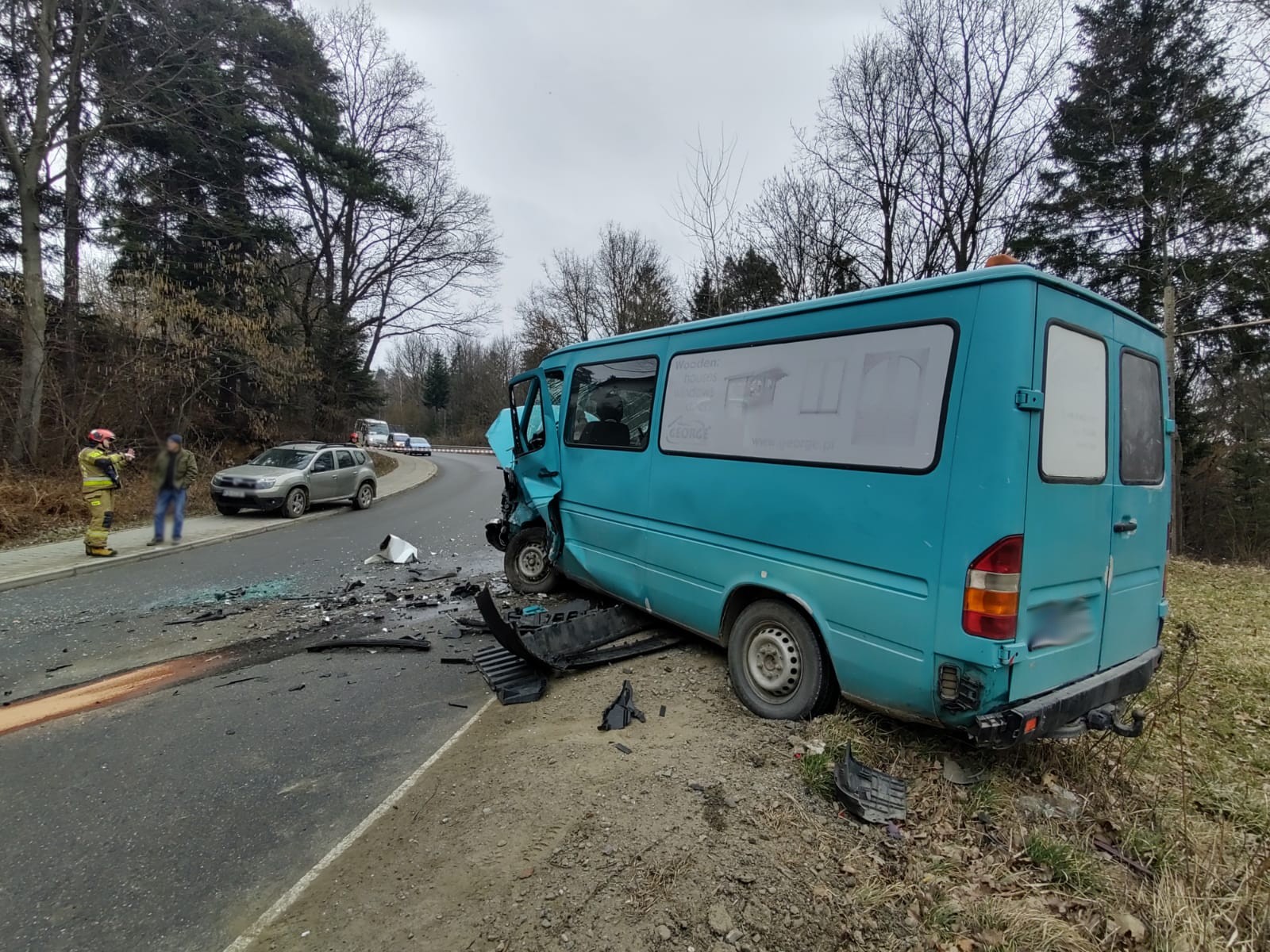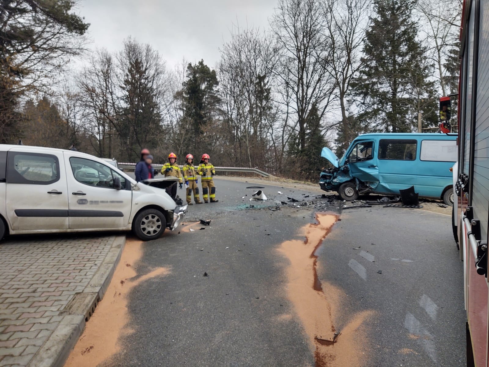 4 marca o godzinie 12.51 zastępy z JRG nr 1 w Nowym Sączu zadysponowane zostały do działań w Rdziostowie. Po przybyciu na miejsce zdarzenia ustalono, że doszło do zderzenia trzech samochodów osobowych marki Peugeot Tepee, Mercedes Sprinter (bus dostawczy) i VW Golf IV. Samochodami podróżowało łącznie cztery osoby. Wszyscy uczestnicy zdarzenia opuścili pojazdy o własnych siłach. Jedna osoba uskarżała się na dolegliwości. Droga zablokowana była w obu kierunkach. Nastąpił wyciek płynów eksploatacyjnych na jezdnie. Działania zastępów straży polegały na zabezpieczeniu miejsca zdarzenia oraz udzieleniu pomocy osobie poszkodowanej. Odłączono akumulator w samochodzie Peugeot. Dokonano sorpcji rozlanych płynów eksploatacyjnych na jezdni. Na miejsce zdarzenia przybyły dwie karetki. Po przebadaniu osoby uczestniczące w zdarzeniu pozostały na miejscu zdarzenia. Samochód Peugeot został ściągnięty na pobocze przy użyciu wciągarki zamontowanej na wyposażeniu samochodu pożarniczego. Dalsze czynności polegały na wprowadzeniu ruchu wahadłowego. VW Golf został odholowany przez drugi samochód osobowy, natomiast Mercedes Sprinter został zabrany z miejsca zdarzenia przez pomoc drogową. Po zakończonych czynnościach dochodzeniowych przez Policję, usunięto uszkodzone elementy karoserii. Na miejscu pozostał patrol Policji oraz uczestnicy zdarzenia. Działania strażaków trwały dwie godziny.