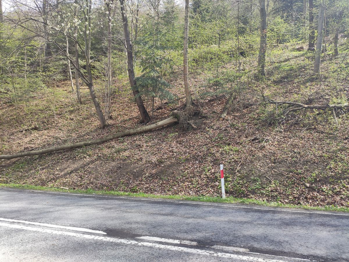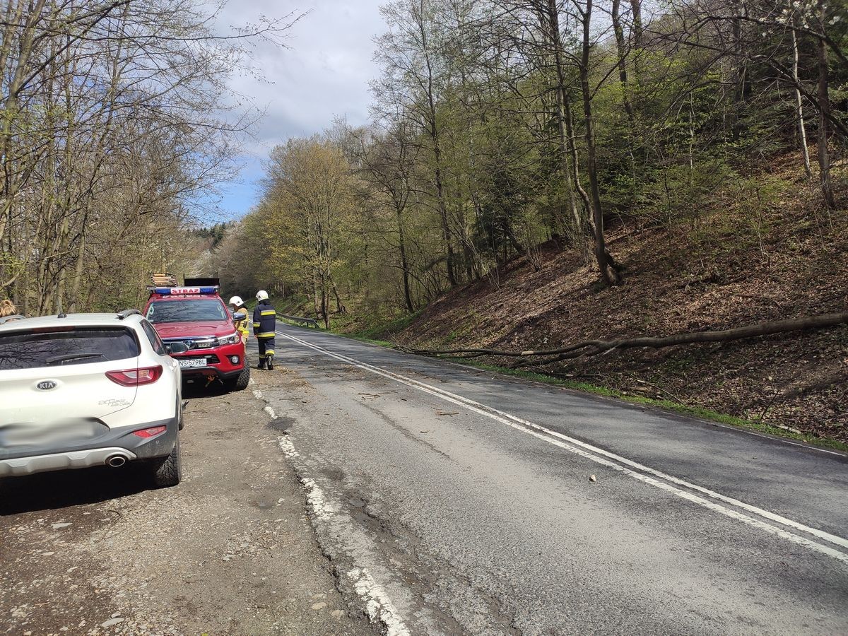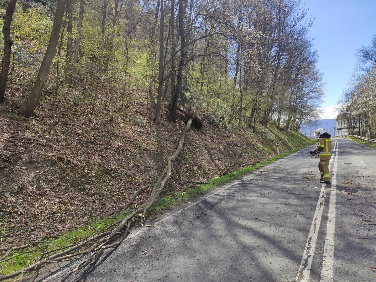 ustalono, że na drodze wojewódzkiej drzewo przewróciło się przed nadjeżdżającym samochodem marki KIA. Podróżującym nic się nie stało natomiast uszkodzony został przedni zderzak samochodu. Swym usytuowaniem drzewo stwarzało zagrożenie dla nadjeżdżających pojazdów. Samochód znajdował się na poboczu drogi.Działania przybyłego zastępu OSP polegały na zabezpieczeniu miejsca zdarzenia, odcięciu korony drzewa wystającej na jezdnię, uprzątnięciu drobnych gałązek oraz trocin z drogi.