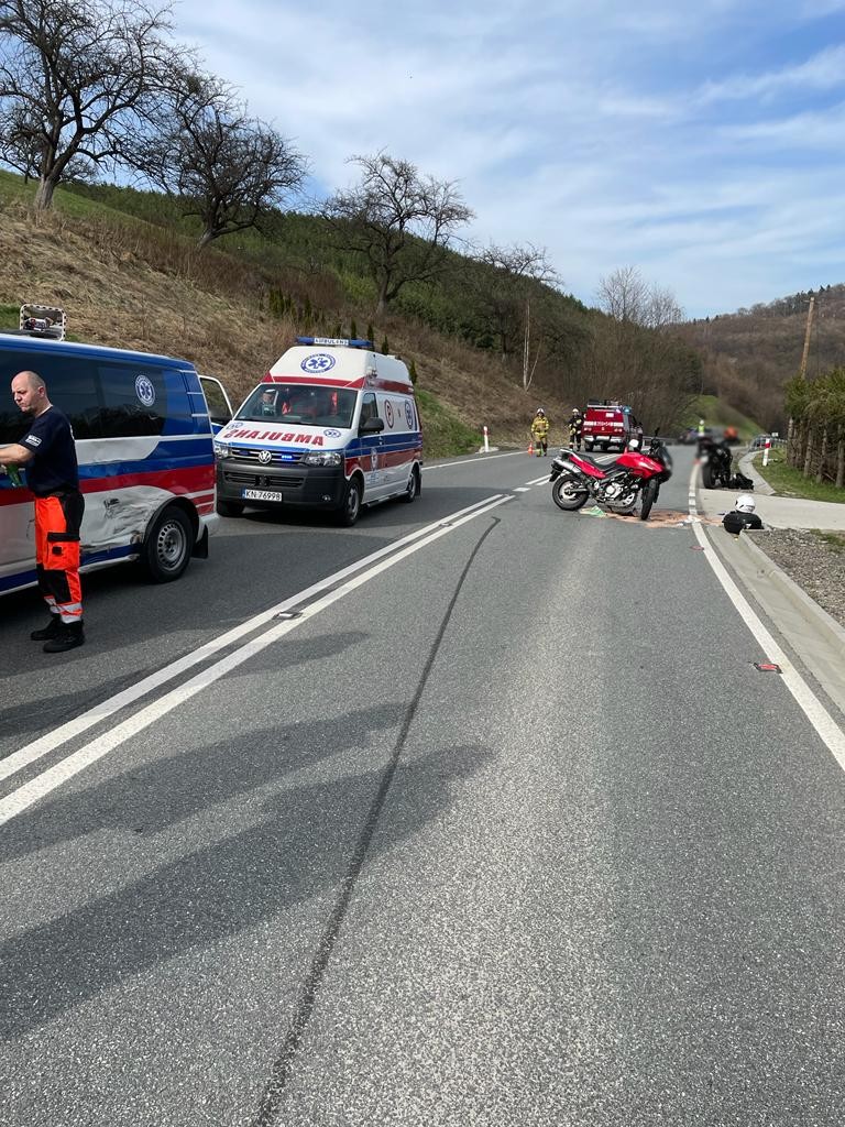 14 kwietnia o godzinie 15.14 zastępy z JRG nr 1 w Nowym Sączu oraz OSP Gródek nad Dunajcem zadysponowane zostały do Siennej. Po przybyciu na miejsce zdarzenia ustalono, że na drodze wojewódzkiej nr 975 doszło do zderzenia karetki transportowej oraz motocykla. Samochodem podróżowało dwóch ratowników medycznych i nie uskarżali się na żadne dolegliwości zdrowotne. Jednośladem podróżował sam kierujący, który leżał na jezdni, był przytomny i pod opieką medyczną ratowników uczestniczących w zdarzeniu. Droga była całkowicie zablokowana. Z motocykla nastąpił wyciek oleju silnikowego. Działania strażaków polegały na zabezpieczeniu miejsca zdarzenia, rozłączeniu akumulatora w motocyklu, udzieleniu pomocy załodze Pogotowia ratunkowego w przełożeniu poszkodowanego na nosze typu deska oraz transporcie do karetki. Poszkodowany został przetransportowany do szpitala. Na drodze został wprowadzony ruch wahadłowy. Po zakończonych czynnościach dochodzeniowych prowadzonych przez policję przemieszczono jednoślad na pobocze oraz usunięto rozlany olej z jezdni poprzez sorpcję. Karetka biorąca udział w zdarzeniu zjechała na pobliską zatoczkę. Działania strażaków trwały ponad godzinę.