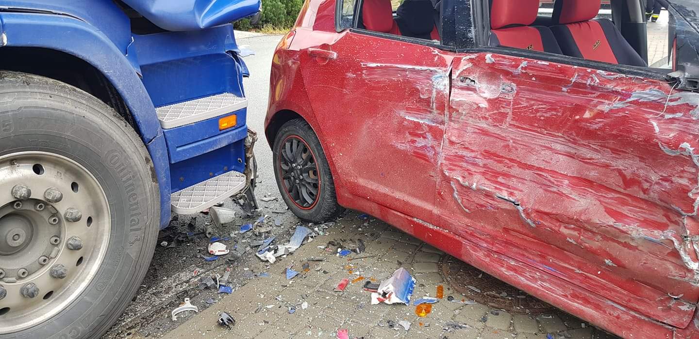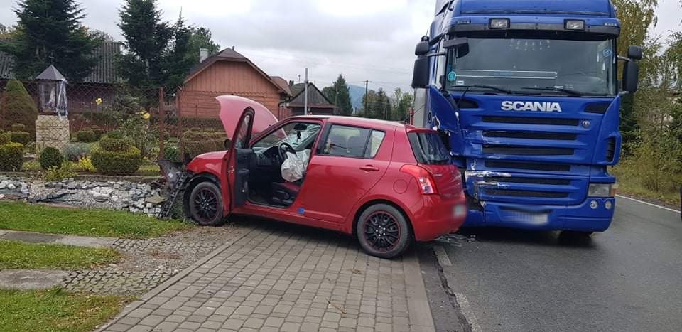 13 października o godzinie 11.04 zastępy z JRG nr 1 w Nowym Sączu, OSP Siołkowa oraz OSP Grybów Biała zadysponowane zostały do działań w Siołkowej. Po przybyciu na miejsce zdarzenia stwierdzono, że w zdarzeniu udział brały dwa samochody tj. ciągnik siodłowy marki Scania z naczepą na której przewożony jest materiał sypki oraz samochód osobowy Suzuki Swift. Obydwoma pojazdami podróżowali sami kierujący. Kierujący zestawem siodłowym opuścił pojazd o własnych siłach przed przybyciem pierwszego zastępu straży, nie odnosząc widocznych obrażeń i nie uskarżając się na żadne dolegliwości. Jednocześnie z zastępem straży na miejsce przybyła karetka Pogotowia ratunkowego, która wydobyła z samochodu i udzieliła pomocy kierującej samochodem osobowym. Samochód ciężarowy stał na swoim pasie jezdni. Tył Suzuki znajdował się na jezdni a przód na chodniku blokując przejście pieszym. Z samochodu ciężarowego nastąpił niewielki wyciek płynów eksploatacyjnych. Działania zastępów straży polegały na zabezpieczeniu miejsca zdarzenia, rozłączeniu instalacji elektrycznej w samochodzie osobowym oraz sorpcji rozlanych płynów eksploatacyjnych. Dalsze działania polegały na pomocy przybyłemu na miejsce pracownikowi Pomocy Drogowej w umieszczeniu Suzuki na lawecie. Dokonano ponownej sorpcji rozlanych płynów eksploatacyjnych oraz usunięciu z jezdni i chodnika elementów powypadkowych. Kierujący samochodem ciężarowym samodzielnie zjechał z jezdni na pobliski plac manewrowy. Kierująca samochodem Suzuki zabrana została do szpitala. Działania strażaków trwały godzinę.