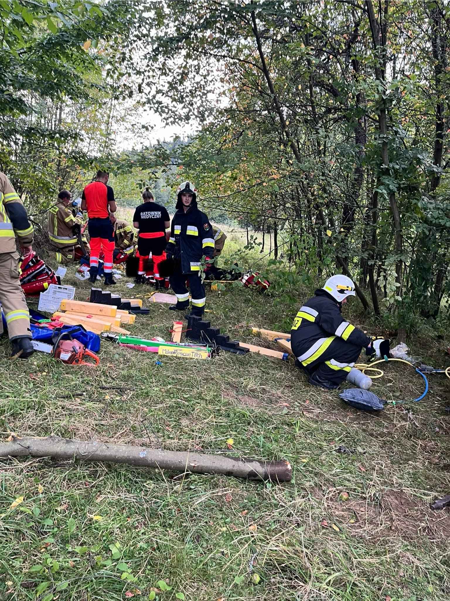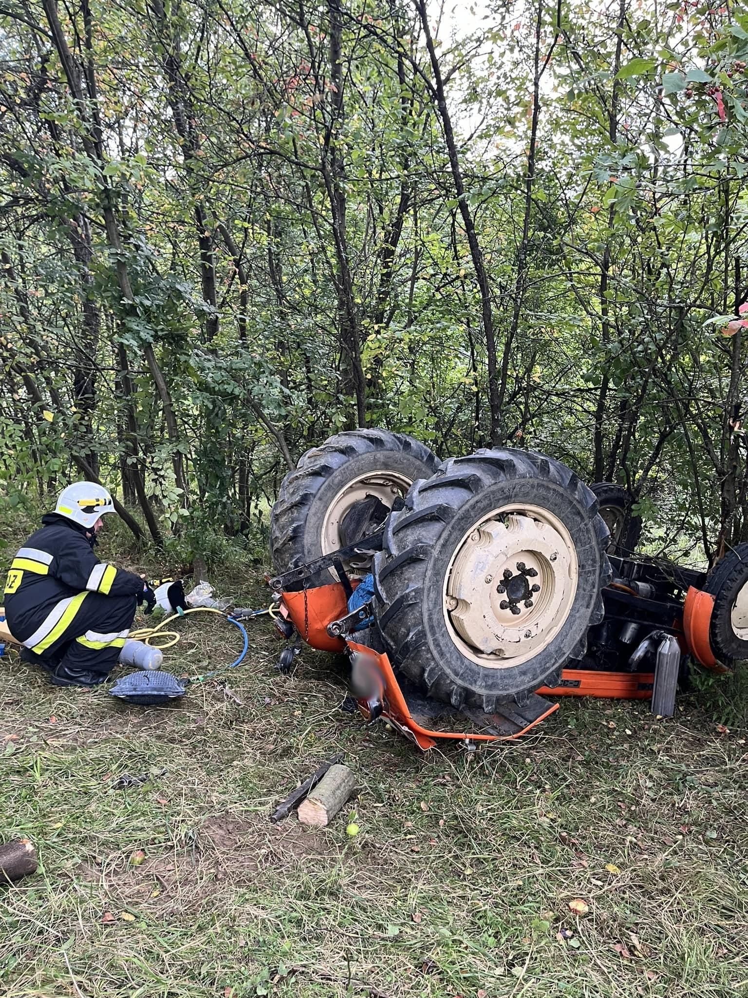 10 sierpnia o godzinie 17.49 zastępy z JRG nr 2 w Nowym Sączu, OSP Przysietnica oraz OSP Moszczenica Wyżna zadysponowane zostały do działań w Skrudzinie. Po przybyciu na miejsce zdarzenia ustalono, że ciągnik rolniczy URSUS C - 330 przygniótł mężczyznę w wieku 68 lat. Kierujący był przytomny i miał przygniecioną lewą rękę kolumną kierowniczą. Był on pod opieką ratowników medycznych Pogotowia Ratunkowego. Pojazd znajdował się do góry kołami, oparty o drzewo. Działania zastępów straży pożarnej polegały na zabezpieczeniu ciągnika przed stoczeniem przy pomocy klinów drewnianych, użyciu poduszek pneumatycznych wysokiego ciśnienia do uniesienia pojazdu oraz wyciągnięciu osoby poszkodowanej spod ciągnika rolniczego. Odłączono akumulator od pojazdu. Zabezpieczono lądowisko dla śmigłowca LPR. Na miejsce zdarzenia przyleciał LPR, który przejął osobę poszkodowaną. Po zbadaniu mężczyzny LPR podjął decyzję o zabraniu poszkodowanego do szpitala. Działania strażaków trwały ponad godzinę. Ciągnik rolniczy przekazano rodzinie poszkodowanego mężczyzny.