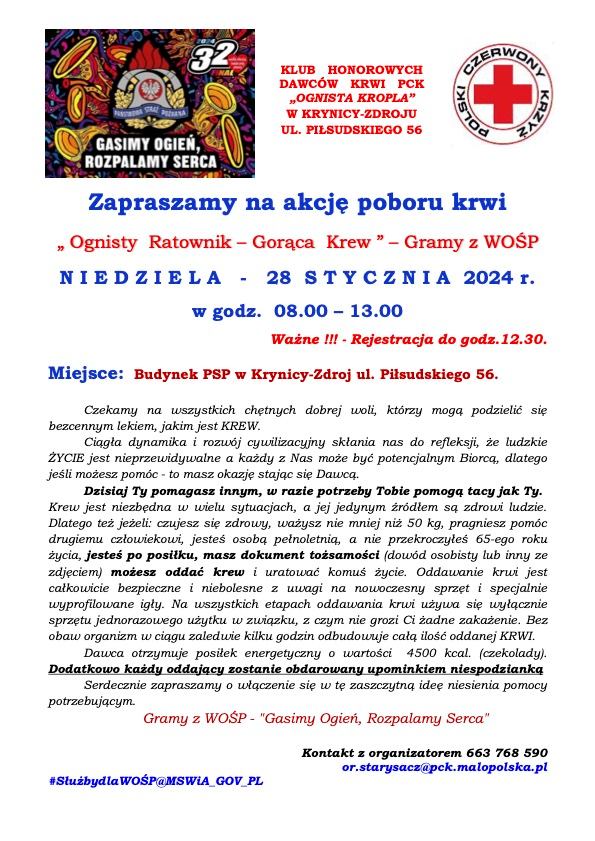 Sądeccy Strażacy podobnie jak w całej Polsce #SłużbyDlaWOŚP grają w 32. finale Wielkiej Orkiestry Świątecznej Pomocy. W ramach finału zapraszamy na akcję poboru krwi „Ognisty Ratownik – Gorąca Krew ” – Gramy z WOŚP, która odbędzie się w niedzielę 28 stycznia br. w godz. 08.00 – 13.00, która odbędzie się w budynku JRG Krynica Zdrój przy ulicy Piłsudskiego 56.