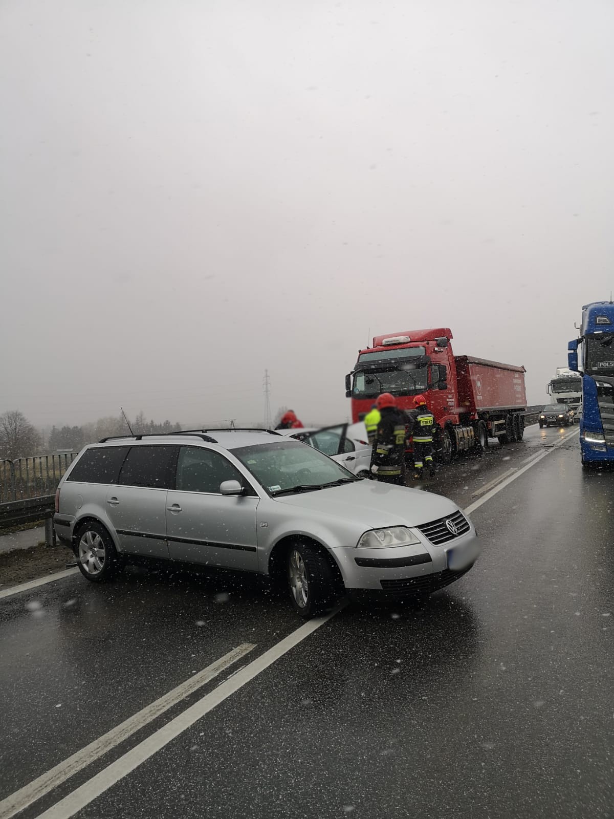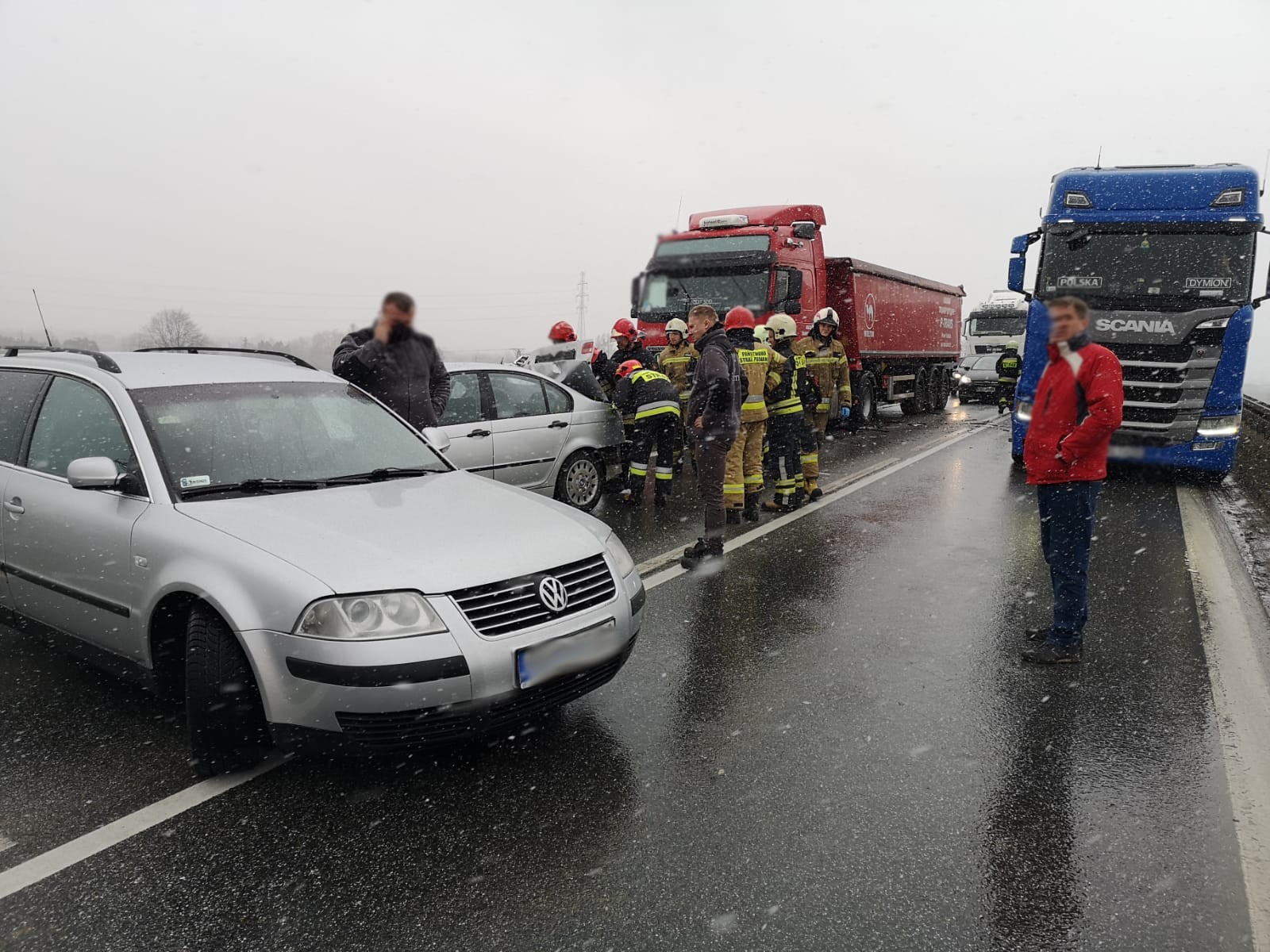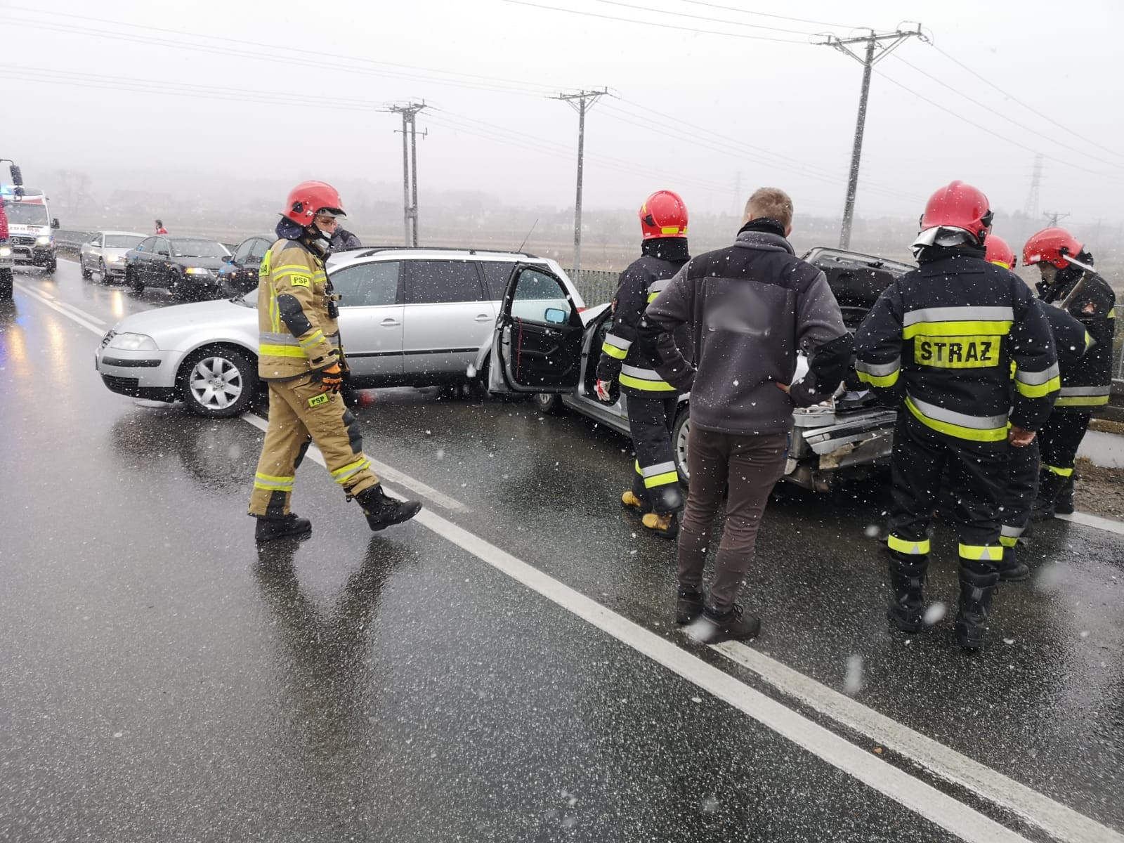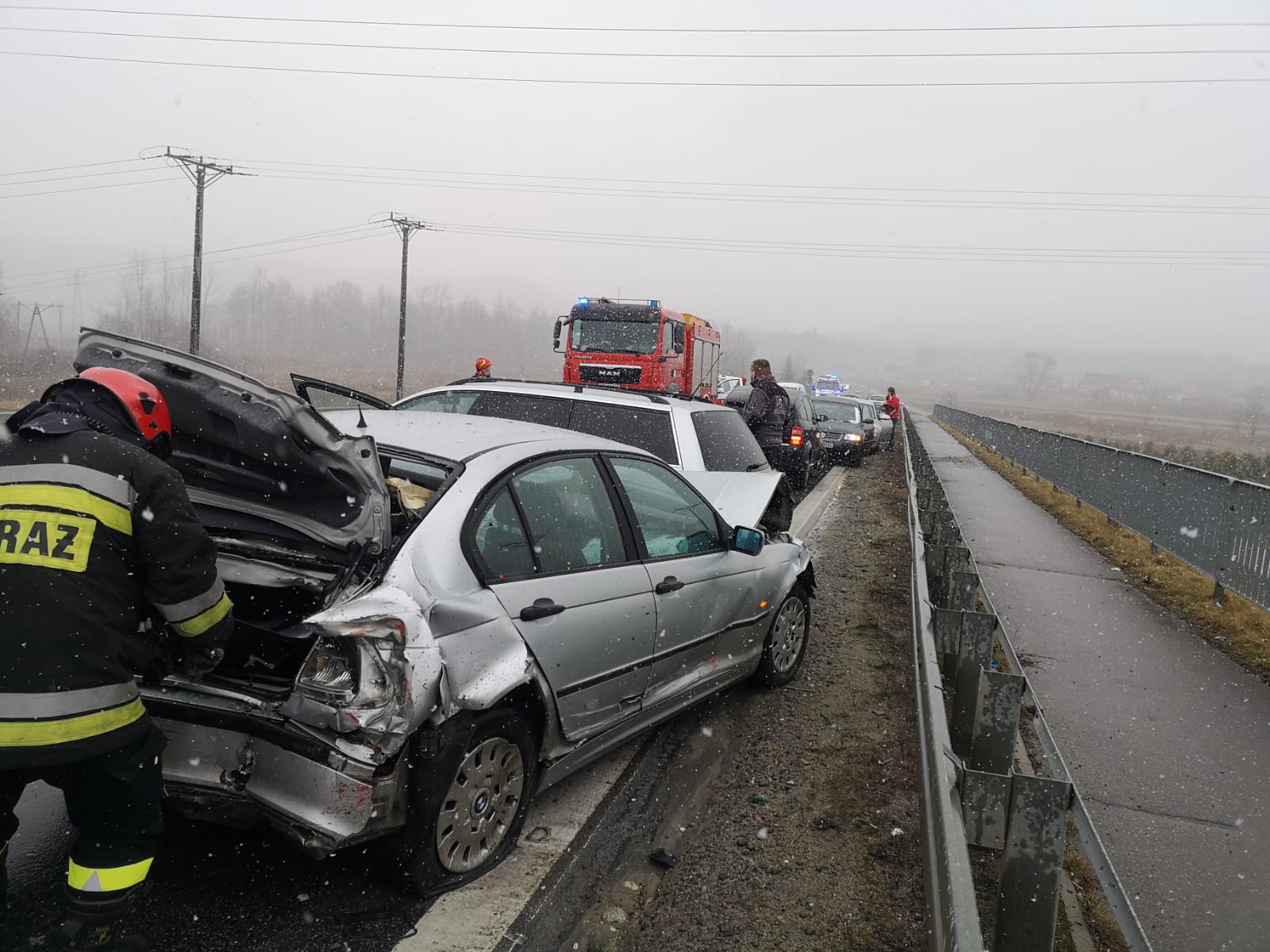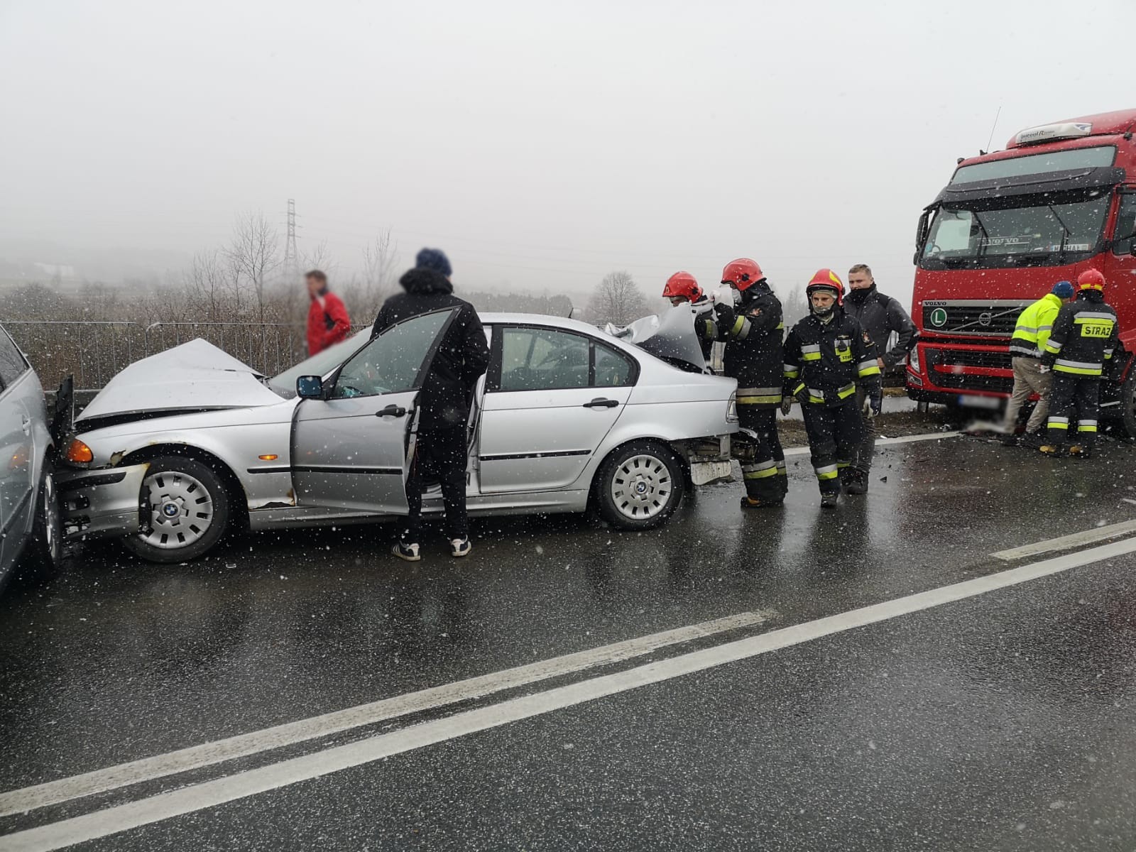 15 marca około godziny 14.19 zastępy z JRG nr 2 w Nowym Sączu oraz OSP Stary Sącz zadysponowane zostały do działań w Starym Sączu. Po przybyciu na miejsce zdarzenia ustalono, że doszło do zderzenia pojazdu ciężarowego marki Volvo z samochodem osobowym marki BMW. W wyniku zdarzenia samochód osobowy uderzył w kolejny samochód osobowy marki Volkswagen Passat. Pojazdami podróżowali sami kierujący, którzy opuścili swoje pojazdy przed przybyciem straży na miejsce zdarzenia. Dwóch kierowców nie uskarżało się na żadne dolegliwości, natomiast kierowca pojazdu marki BMW uskarżał się na dolegliwości. Działania strażaków polegały na zabezpieczeniu miejsca zdarzenia oraz wstrzymaniu ruch na czas prowadzonych działań ratowniczych. Udzielono kwalifikowanej pierwszej pomocy osobie poszkodowanej. Odłączono klemy akumulatorów z uszkodzonych pojazdów. Dokonano sorpcji rozlanych płynów eksploatacyjnych. Poszkodowanego przekazano załodze karetki Pogotowia Ratunkowego. Zepchnięto pojazdy na jeden pas jezdni, udrażniając ruch drogowy, który odbywał się od tego czasu wahadłowo. Osoba poszkodowana została przewieziona do szpitala. Na miejscu zdarzenia pozostało OSP Stary Sącz w celu zabezpieczenia miejsca zdarzenia do czasu dokończenia czynności dochodzeniowych przez Policje. Po zakończeniu działań przez Policje pojazdy zostały zabrane przez pomoc drogową, usunięto pozostałości po kolizji z jezdni oraz udrożniono ruch drogowy w obu kierunkach. Działania strażaków trwały trzy godziny.