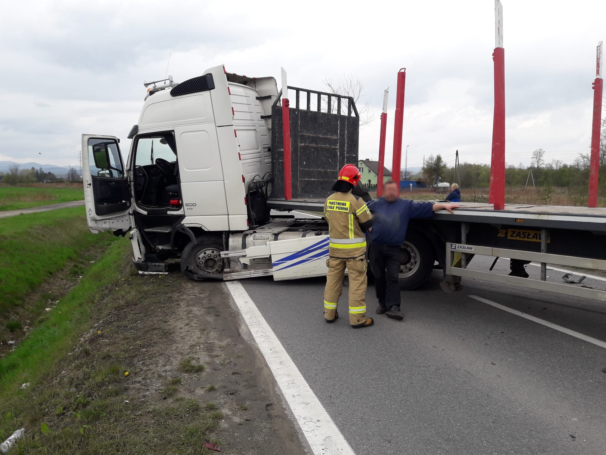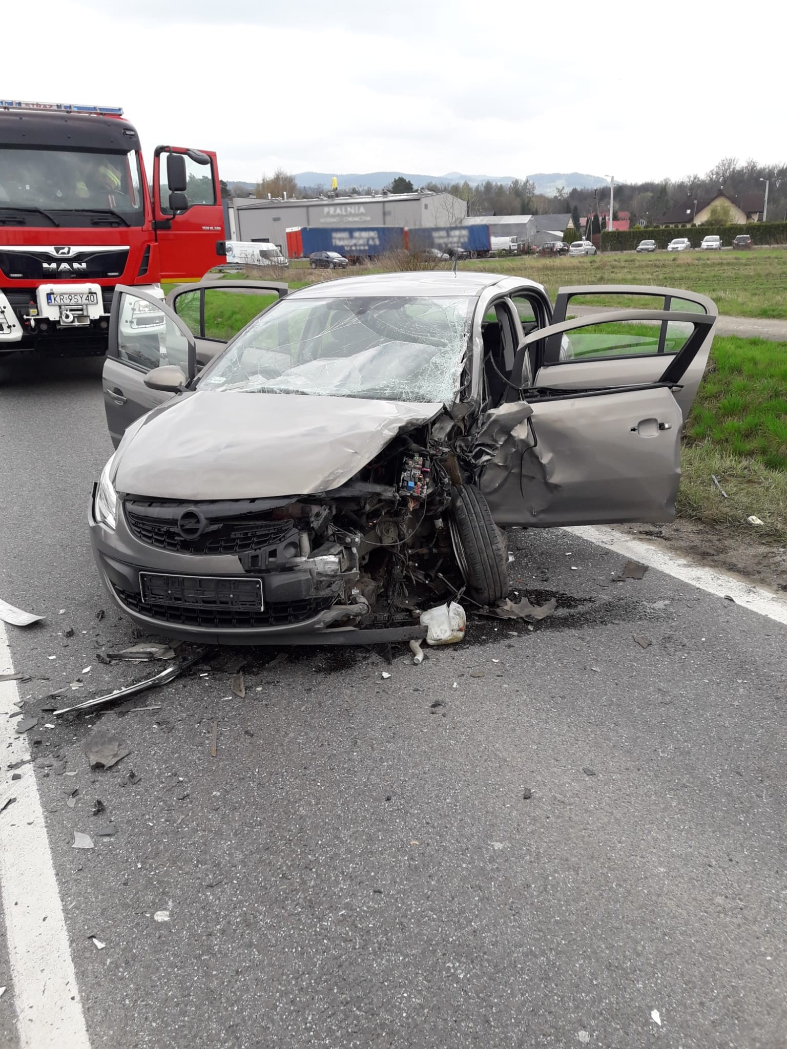 26 kwietnia o godzinie 14.43 zastępy z JRG nr 2 w Nowym Sączu oraz OSP Stary Sącz zadysponowane zostały do działań w Starym Sączu. Po przybyciu na miejsce zdarzenia ustalono, że doszło do zderzenia samochodu osobowego z samochodem ciężarowym. Droga była całkowicie zablokowana w obu kierunkach. Samochody znajdowały się na jezdni. Samochodem osobowym marki Opel podróżowało trzy osoby. Dwie osoby opuściło pojazd o własnych siłach. Trzecia osoba znajdowała się w pojeździe na tylnym siedzeniu. Samochodem ciężarowym marki Volvo podróżował sam kierowca, który opuścił pojazd o własnych siłach nie uskarżał się na dolegliwości. Działania zastępów straży polegały na zabezpieczeniu miejsca zdarzenia. Udzielono pomocy ratownikom medycznym pogotowia ratunkowego w ewakuacji osoby poszkodowanej z samochodu osobowego do karetki. Ratownicy medyczni z karetek przybyłych na miejsce zdarzenia, przetransportowali trzy osoby poszkodowane z samochodu osobowego do szpitala w Nowym Sączu. Dalsze działania straży polegały na odpięciu klem akumulatora w samochodzie osobowym, sorpcji rozlanych płynów eksploatacyjnych, usunięciu elementów karoserii z jezdni oraz sprawdzeniu czy pojazdy nie mają innych wycieków. Działania ratownicze strażaków oraz zabezpieczające trwały ponad pięć godzin.