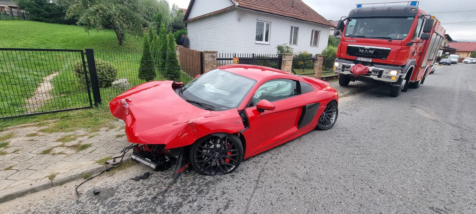 Stary Sącz, ul. Partyzantów - samochód osobowy wypadł z drogi i uderzył w ogrodzenie domu jednorodzinnego