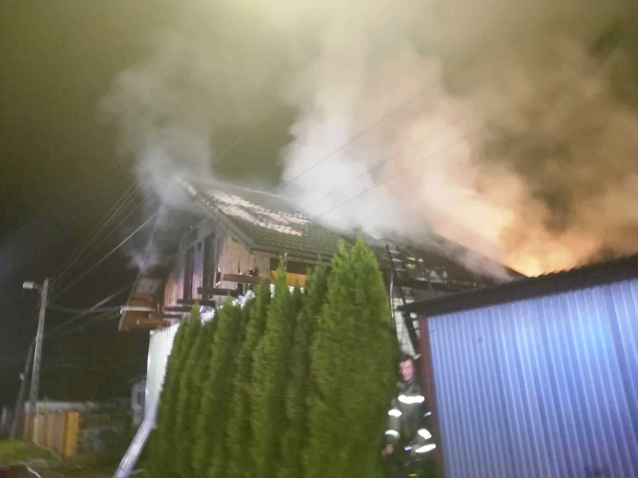 27 października o godzinie 2.10 zastępy z JRG nr 2 w Nowym Sączu oraz 6 zastępów OSP zadysponowane zostały do działań w Starym Sączu na ulicę Podgrodzką. Po przybyciu na miejsce zdarzenia ustalono, że pożarem objęte było w całości poddasze oraz część pomieszczeń na parterze budynku mieszkalnego o konstrukcji drewnianej. Na miejscu zdarzenia znajdowała się osoba, która o własnych siłach opuściła obiekt. Z uzyskanych od niej informacji wynikało, że wewnątrz budynku znajdowały się dwie osoby. W bezpośrednim zagrożeniu znajdował się sąsiedni budynek gospodarczy. Działania strażaków polegały na zabezpieczeniu miejsca zdarzenia oraz wprowadzeniu czterech ratowników w sprzęcie ochrony dróg oddechowych do wnętrza budynku. Strażacy zlokalizowali 50 letniego mężczyznę. Osoba ta została ewakuowana na zewnątrz w bezpieczne miejsce. Następnie zauważono drugą osobę 22 letnią kobietę, którą natychmiast ewakuowano. W tym samym czasie odłączono zasilanie elektryczne w skrzynce bezpieczników. Pozostali strażacy prowadzili działania gaśnicze z zewnątrz poprzez podanie dwóch prądów wody w natarciu. Ze względu na bliskość linii energetycznych zadysponowano na miejsce Pogotowie Energetyczne. Po ewakuacji ratownicy dokonali oceny stanu osób i natychmiast przystąpili do udzielania pomocy poprzez wykonywanie resuscytacji krążeniowo-oddechowej. Po przybyciu karetek Pogotowia ratunkowego strażacy udzielili pomocy przy wykonywaniu medycznych czynności ratowniczych oraz transporcie do karetki. Osoba, która sama opuściła budynek została też przewieziona do szpitala. Wykonano zaopatrzenie wodne w oparciu o przybyłe pojazdy oraz hydrant. W czasie działań dokonano szczegółowego przeszukania całego budynku, nie stwierdzono obecności kolejnych osób wewnątrz. Po lokalizacji pożaru przystąpiono do prac rozbiórkowych, dogaszania nadpalonych elementów konstrukcji oraz wyposażenia. Po ugaszeniu pożaru przy użyciu drabiny przenośnej oraz pilarki do drewna usunięto część nadpalonego stropu w celu dogaszenia ocieplenia w postaci trocin. Po ugaszeniu pożaru pogorzelisko oraz budynek drewniany sprawdzono przy użyciu kamery termowizyjnej, nie stwierdzono zagrożenia. Działania strażaków trwały ponad trzy godziny. Przyczyna pożaru jest nieustalona.