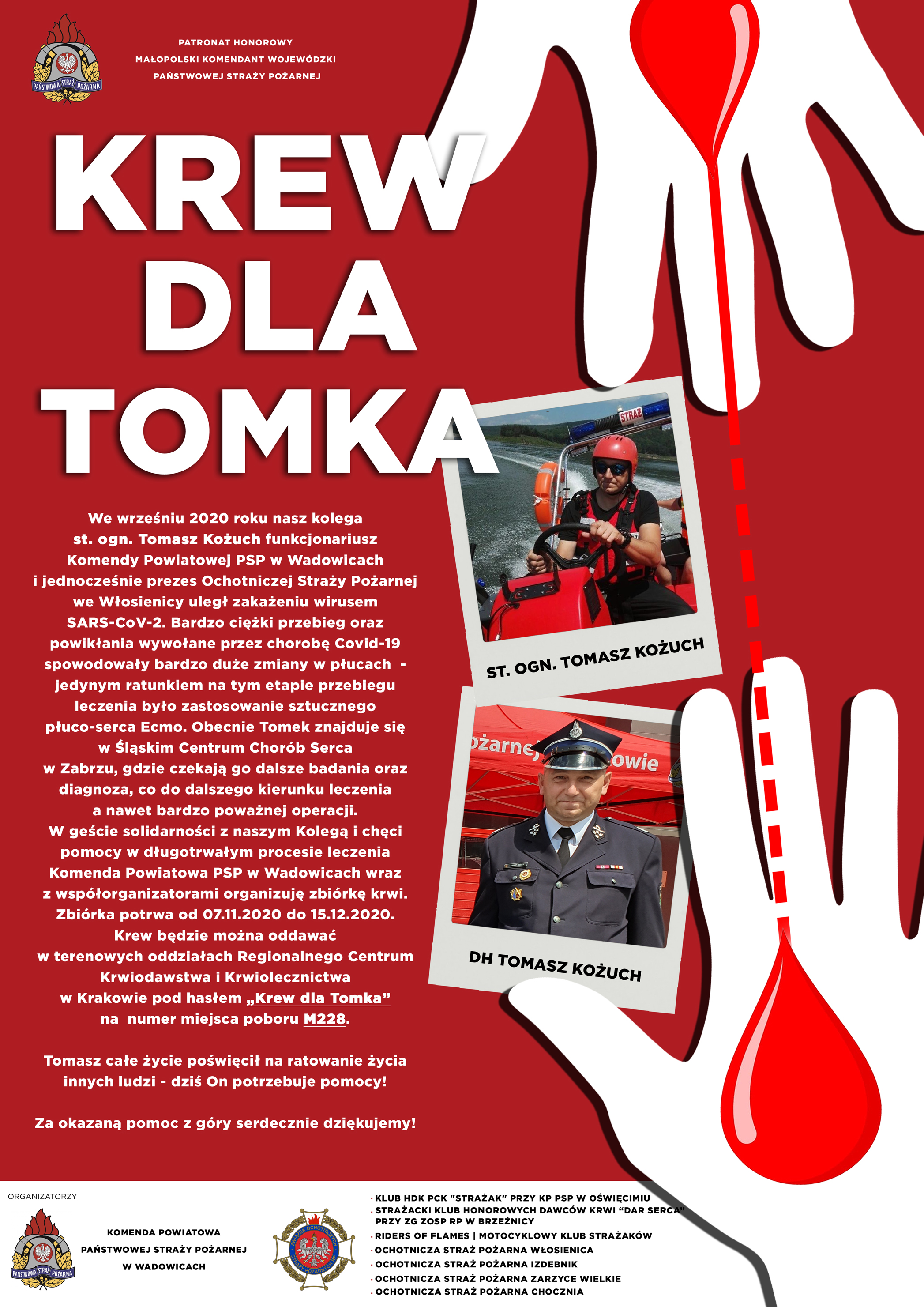 Akcję objął patronatem Małopolski Komendant Wojewódzki Państwowej Straży Pożarnej st. bryg. Piotr Filipek. Partnerem w akcjach są kluby HDK PCK Oddziału Rejonowego PCK w Starym Sączu. Akcje odbędą się w niedzielę 22 i 29 listopada oraz 6 grudnia 2020. w godz. od 8.00 do 13.00 w punkcie krwiodawstwa Nowy Sącz ul. Kazimierza Wielkiego 9A. tel. 18 442 05 07. W całym kraju są prowadzone akcje zbierania krwi dla Tomka W geście solidarności oraz prośbą rodziny naszego kolegi Tomka i chęcią pomocy w długotrwałym procesie leczenia zwracamy się z gorącym apelem do wszystkich strażaków Państwowej Straży Pożarnej i Ochotniczych Straży Pożarnych o oddawanie krwi. Apelujemy do stałych krwiodawców oraz do osób, które nigdy nie oddawały krwi a chciałyby wesprzeć nasze akcje i działania. To również odpowiedź na apele regionalnych centrów krwiodawstwa, które w czasie pandemii koronawirusa borykają się z brakiem krwi oraz osocza od ozdrowieńców. Zapraszamy wszystkich i prosimy o powiadomienie tych, którzy jeszcze mogą przyjść i pomoc innym potrzebującym. Każdy może oddać krew niezależnie od tego, jaka grupę krwi posiada. Czekamy na wszystkich chętnych, którzy mogą podzielić się tym bezcennym lekiem, jakim jest KREW. Każdy krwiodawca i oddający w tych dniach otrzyma niespodziankę – pluszaka maskotkę.