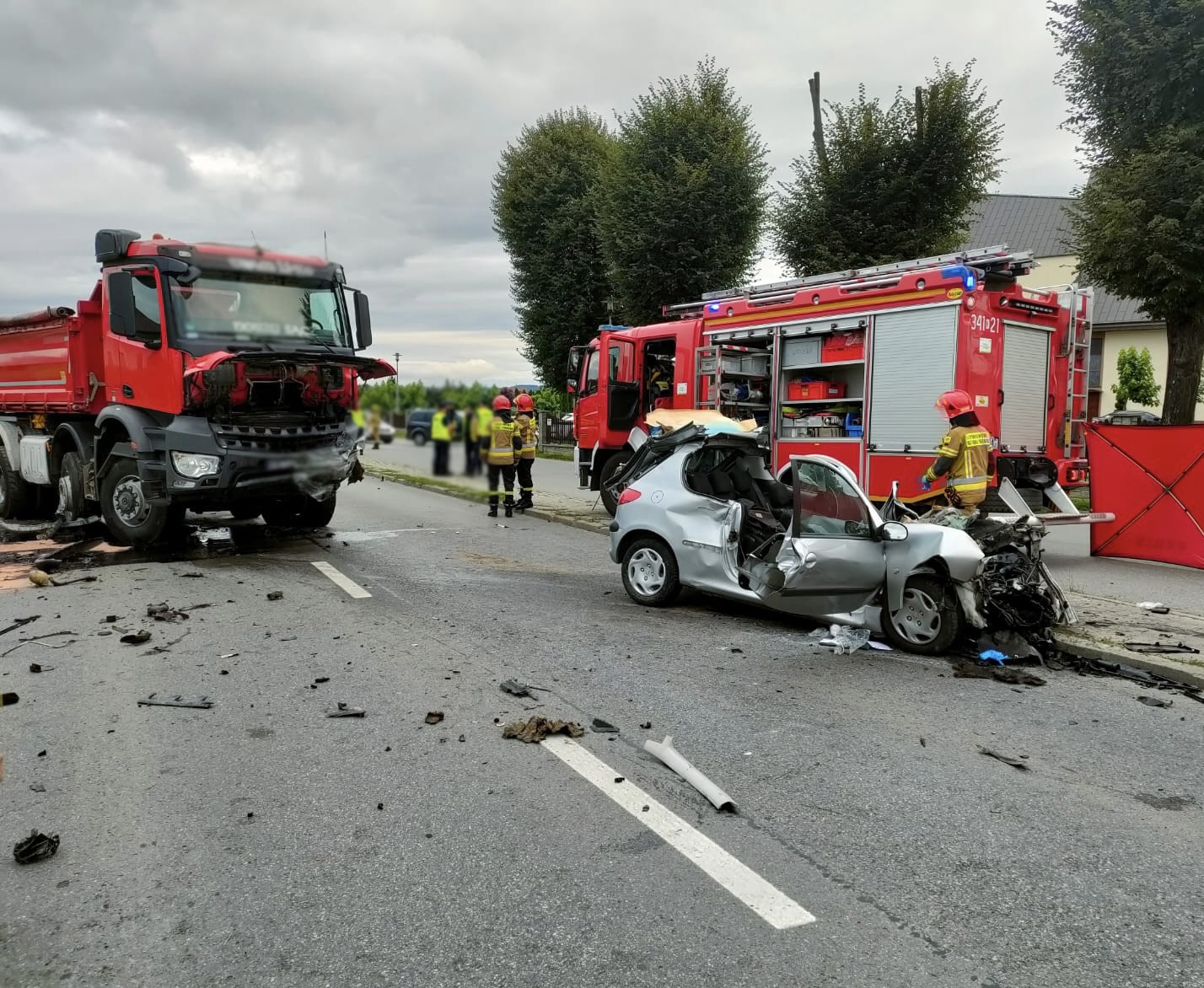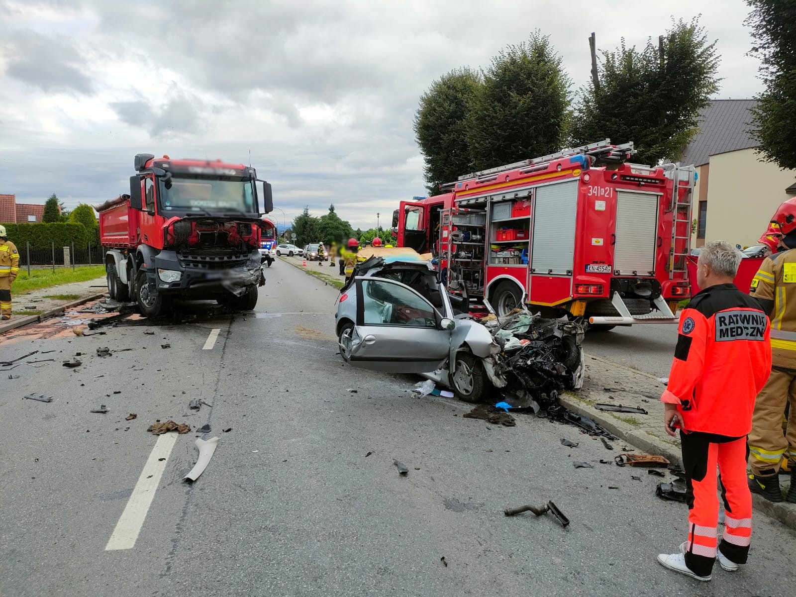 10 sierpnia o godzinie 5.48 zastępy z JRG nr 1 w Nowym Sączu, OSP Podrzecze oraz OSP Niskowa zadysponowane zostały do działań w Świniarsku. Po przybyciu na miejsce zdarzenia ustalono, że doszło do czołowego zderzenia samochodu osobowego marki Peugeot oraz samochodu ciężarowego marki Mercedes. Samochody całkowicie blokowały drogę. Równocześnie z zastępami straży na miejsce dotarła karetka Pogotowia Ratunkowego. Kierowca samochodu ciężarowego opuścił pojazd o własnych siłach przed przybyciem strażaków i nie uskarżał się na żadne dolegliwości. W samochodzie marki Peugeot znajdował się zakleszczony mężczyzna. Nastąpił wyciek płynów eksploatacyjnych z pojazdów. Działania strażaków polegały na zabezpieczeniu miejsca zdarzenia oraz wykonaniu dostępu do osoby zakleszczonej przy użyciu narzędzi hydraulicznych. Przemieszczono mężczyznę z pojazdu z pomocą deski ortopedycznej. Ratownicy medyczni stwierdzili zgon mężczyzny. W trakcie prowadzonych działań rozstawiono parawan ochronny, wydzielono objazd dla samochodów poprzez pobliski parking kościelny oraz zabezpieczono wyciek płynów eksploatacyjnych płynących wzdłuż krawężnika. Dalsze działania zastępów straży polegały na uprzątnięciu pozostałości karoserii z drogi oraz sorpcji rozlanych płynów eksploatacyjnych. Po przeprowadzonych czynnościach dochodzeniowych, pomoc drogowa usunęła uszkodzone pojazdy z jezdni. W związku z tym udrożniono ruch drogowy. Działania strażaków trwały ponad pięć godzin.